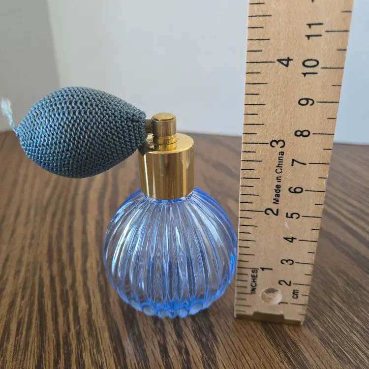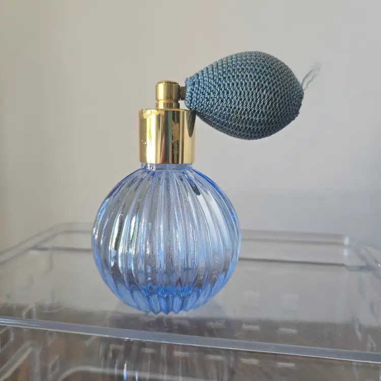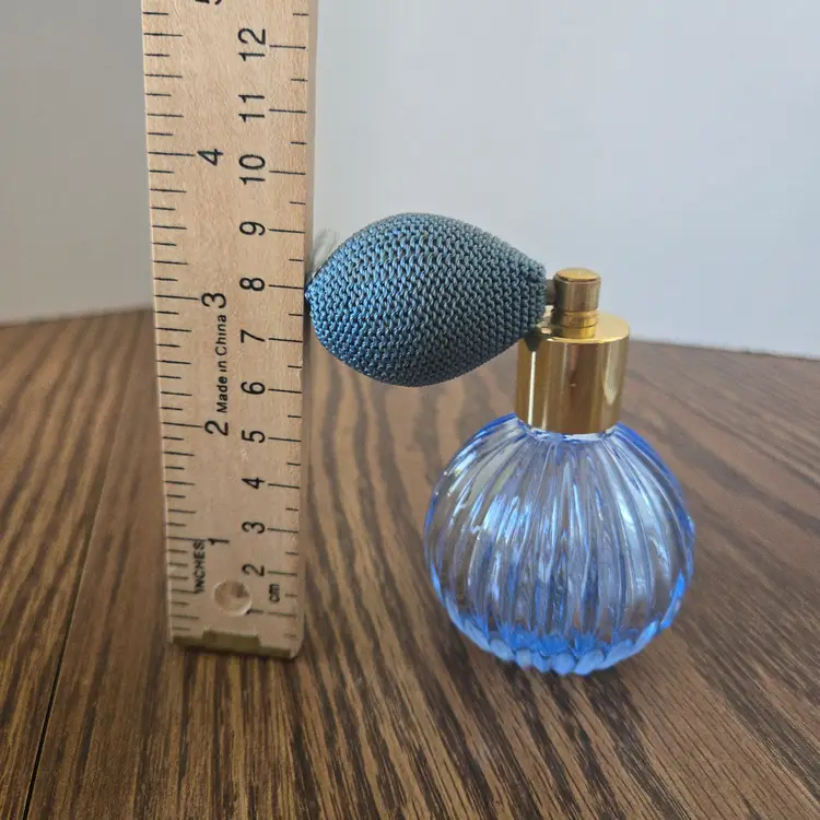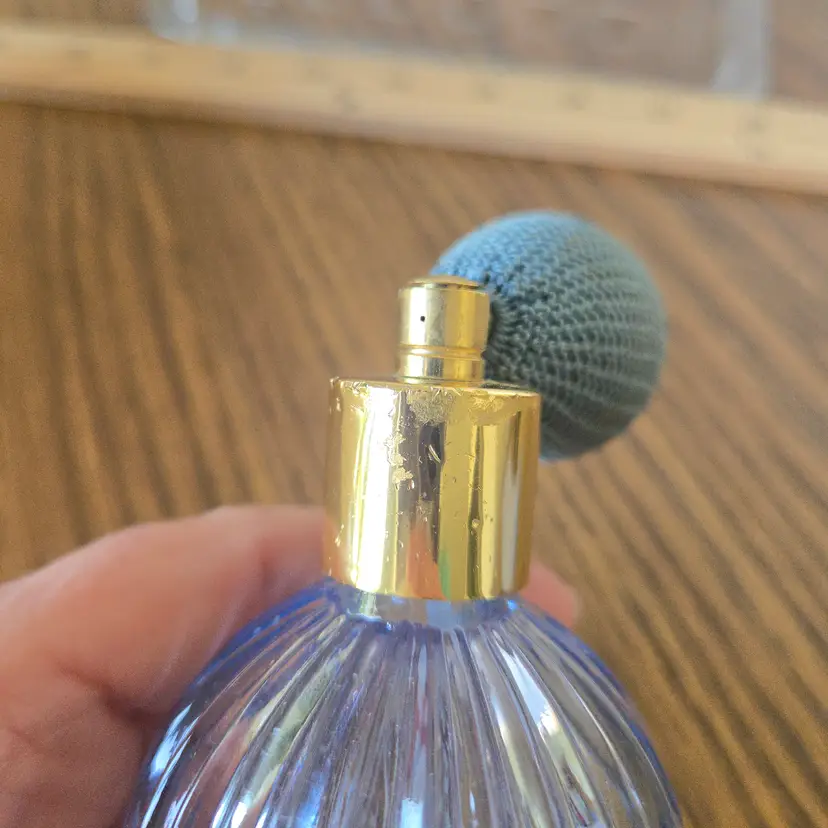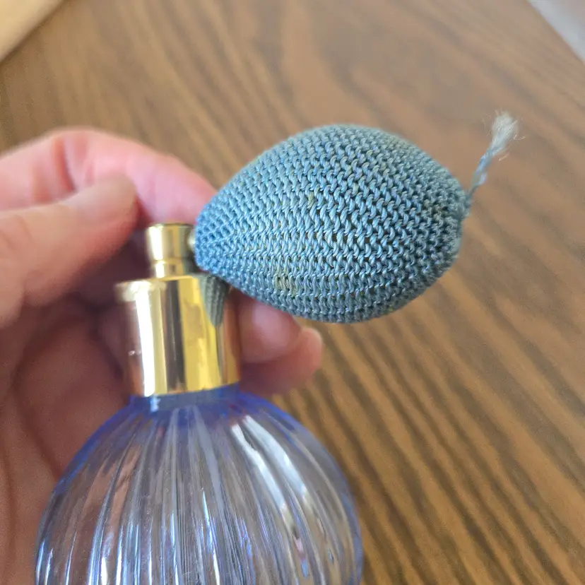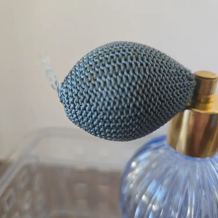 This perfume bottle has an atomizer that is still squeezable. The atomizer is a bit discolored (see pictures), and the cap is tarnished (see pictures). The atomizer has a frayed piece of thread that I think can be gently pushed back inside it with something like a small crochet hook. I would not cut it off because I think it would cause more fraying. I didn't want to attempt to fix that because I have a poor track record with attempts to "fix" things! The bottle itself is in nice condition and a beautiful blue color.