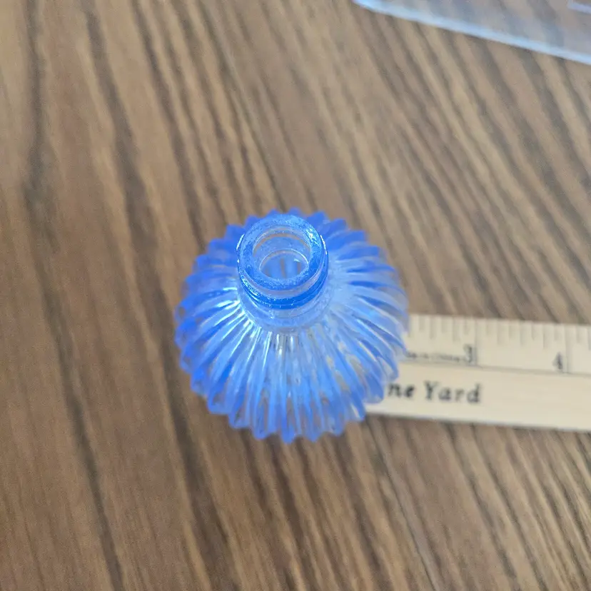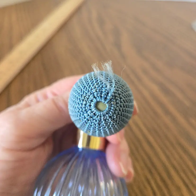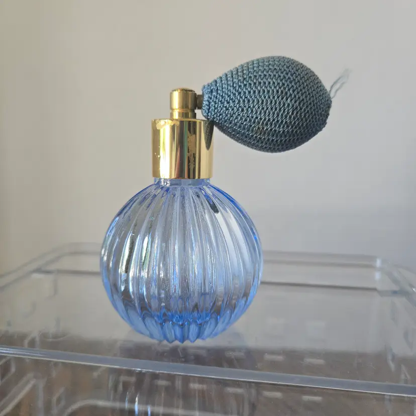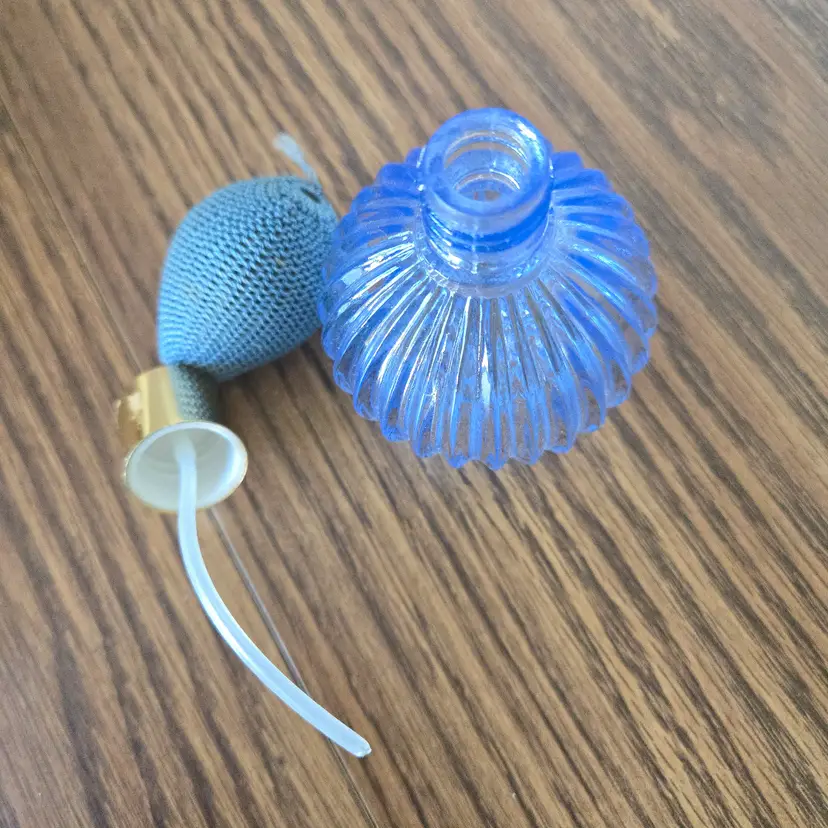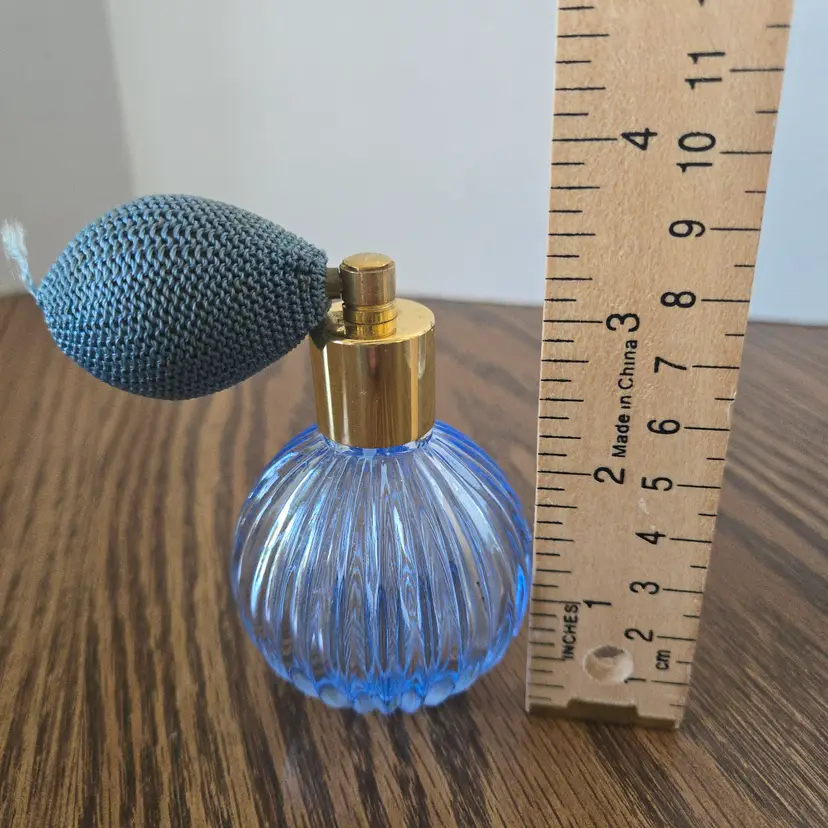 This perfume bottle has an atomizer that is still squeezable. The atomizer is a bit discolored (see pictures), and the cap is tarnished (see pictures). The atomizer has a frayed piece of thread that I think can be gently pushed back inside it with something like a small crochet hook. I would not cut it off because I think it would cause more fraying. I didn't want to attempt to fix that because I have a poor track record with attempts to "fix" things! The bottle itself is in nice condition and a beautiful blue color.