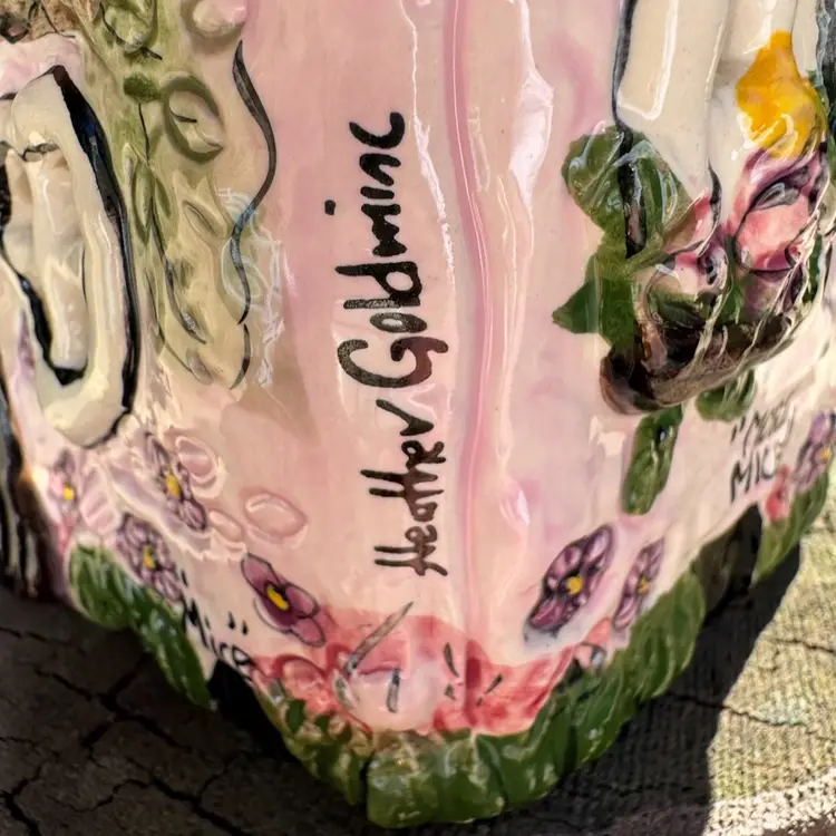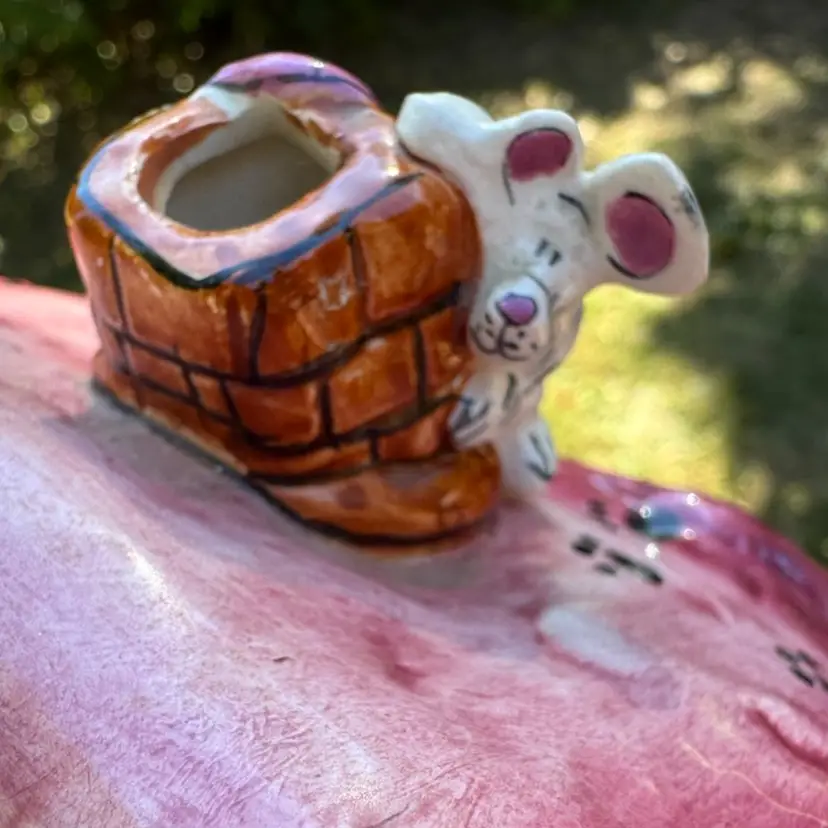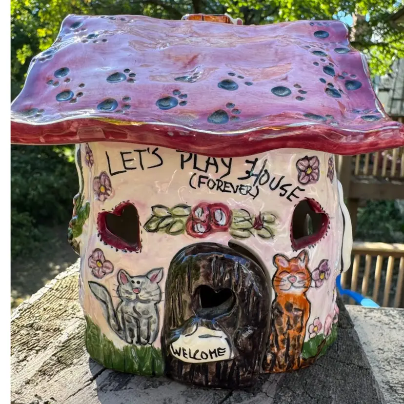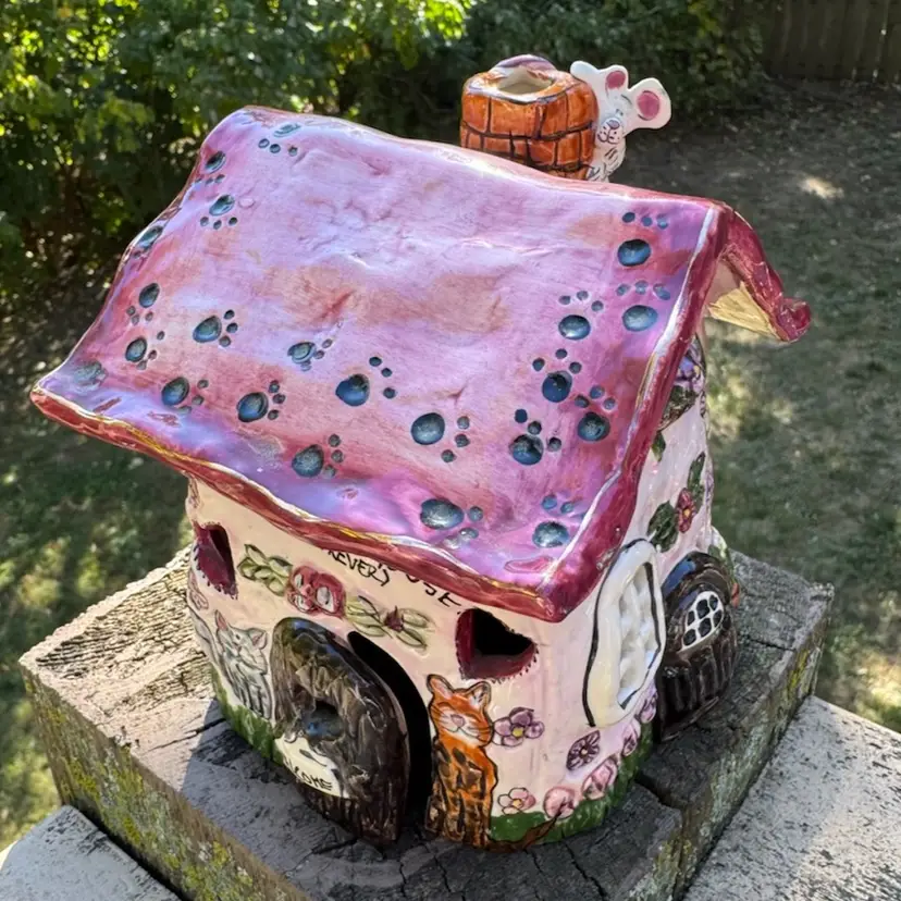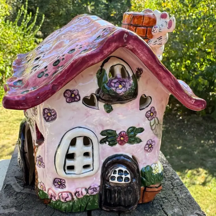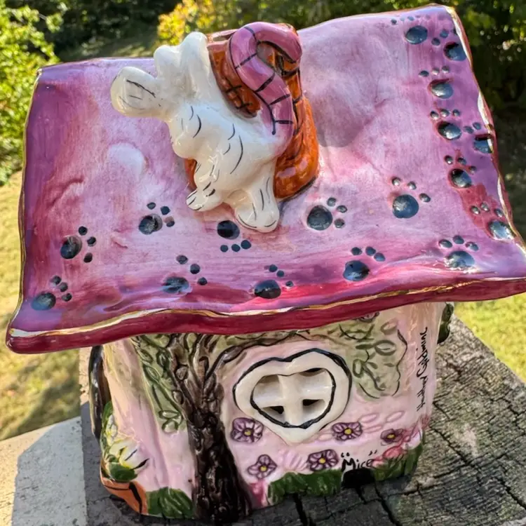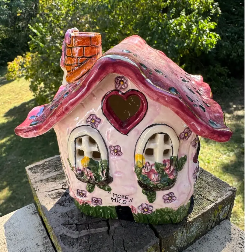 Awesome vintage condition Heather Goldminc Let’s Play House cat lovers candleholder! Cute little mouse hiding on the chimney. Measures about 5 inches tall and about 5 inches across. Would be adorable with a battery operated candle inside.