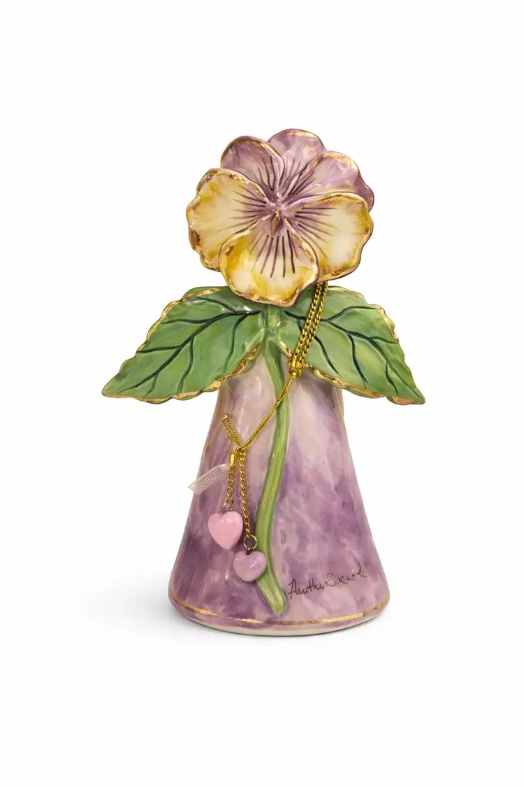 • Brand: Blue Sky • Collection: Charming – Signature Collection • Year: 2004 • Material: Hand-painted ceramic • Features: Pansy flower halo, green leaf wings, dangling heart charms • Colors: Lavender, green, soft yellow with gold accents • Condition: Pre-owned, excellent condition with no chips or cracks • Marked on base: Blue Sky ©2004 • Made in China