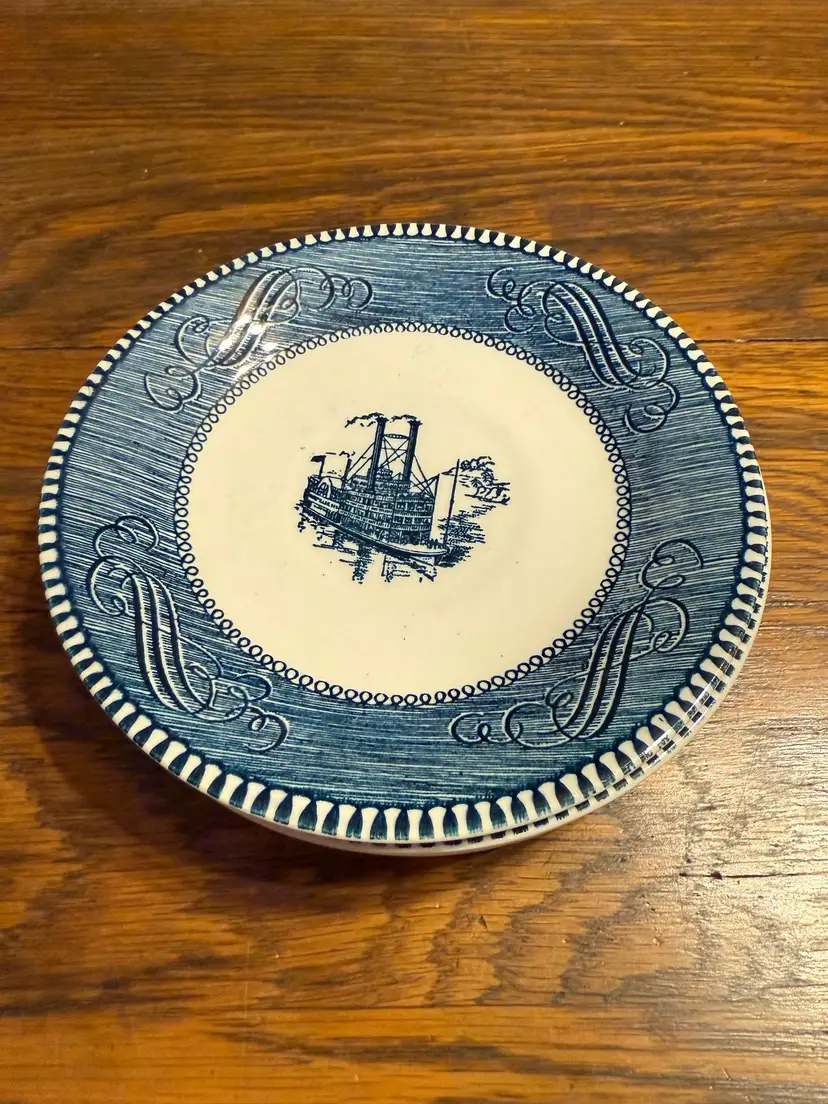 Bring a touch of vintage Americana charm to your table with this set of four 6-inch blue-and-white steamboat saucers. Each piece features a wonderfully detailed riverboat illustration at the center, surrounded by a textured blue border and a repeating rope-style pattern—classic mid-century American dinnerware styling.