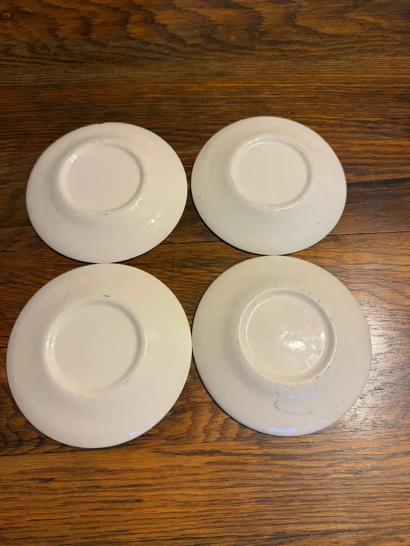 These saucers were found together with matching plates from the same collection and make a lovely set for display, serving small treats, holding mugs, or styling a rustic shelf vignette.