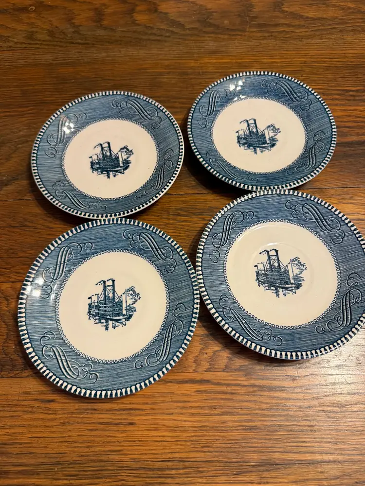 🌟 Item Details Quantity: 4 saucers Size: ~6 inches across Color: Blue on ivory/cream Design: Central steamboat illustration, textured hatched border, rope-style scrollwork Material: Ceramic (ironstone-style, unmarked) Backstamp: None (common for mid-century restaurantware-style pieces) Era: Likely mid-20th century
