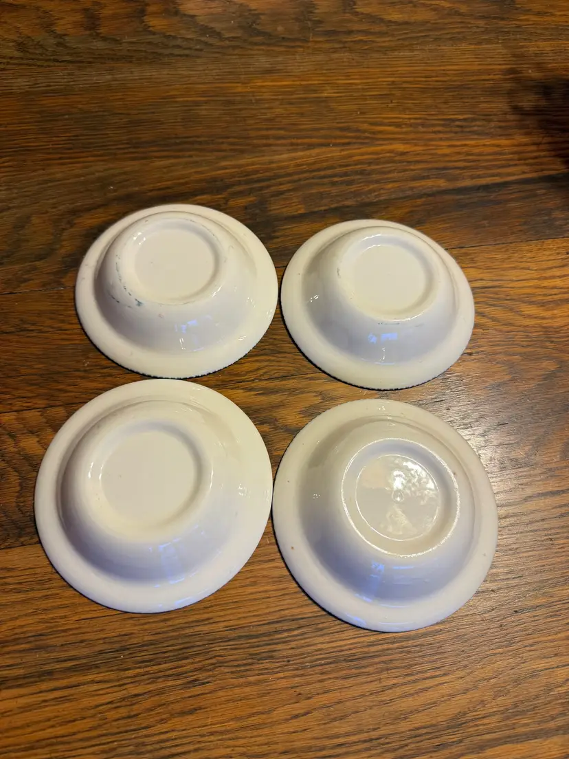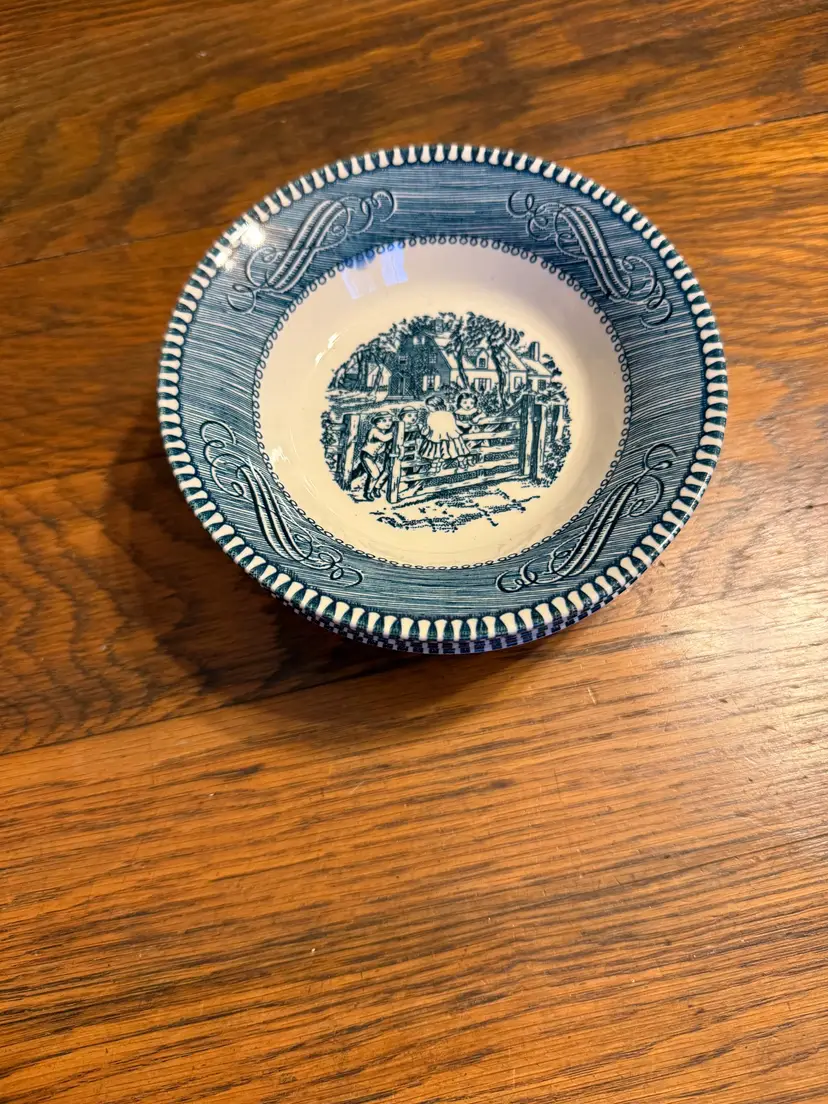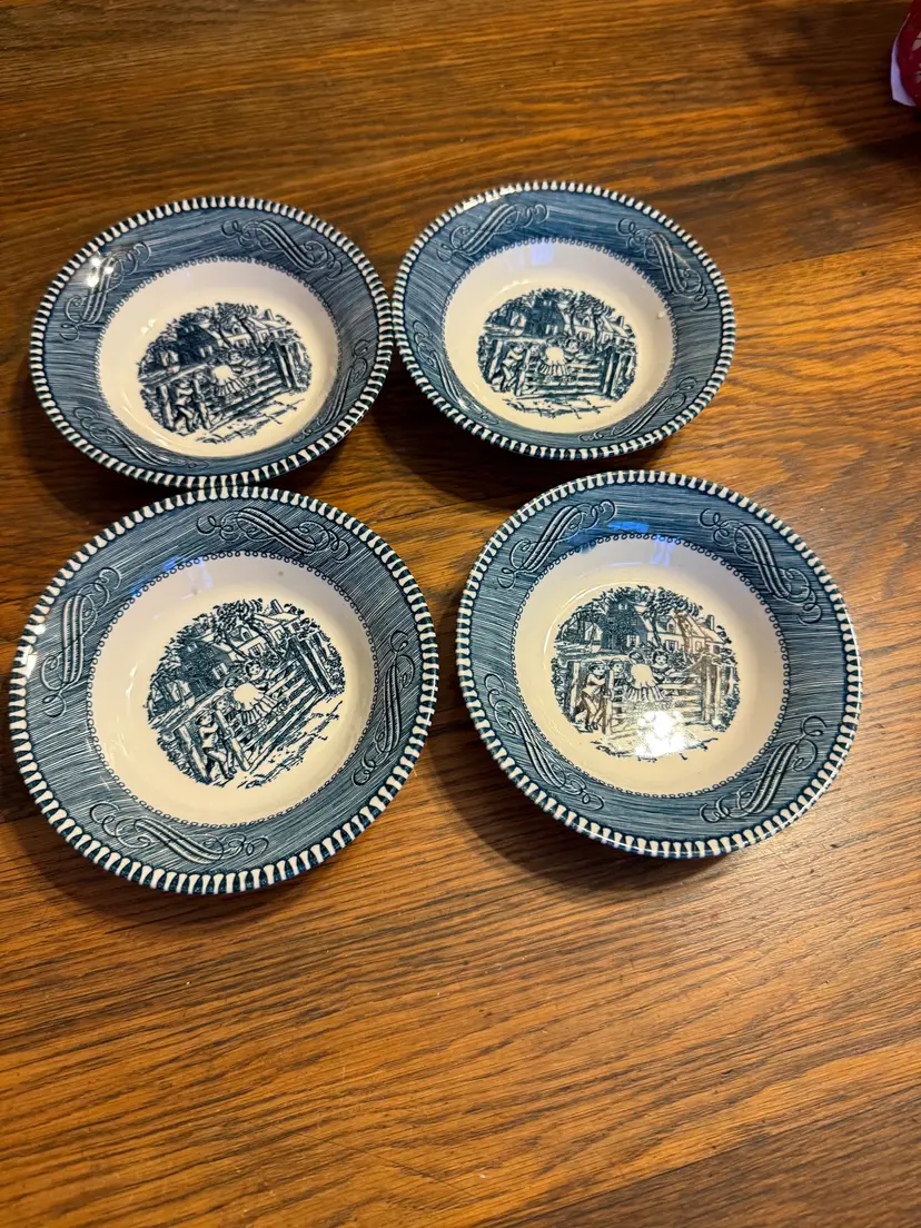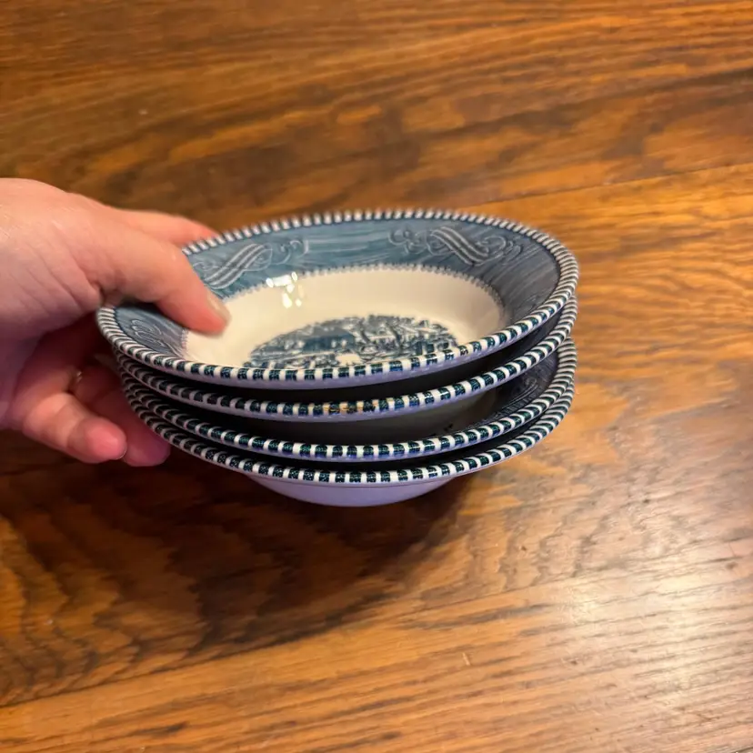 Item Details Set of 4 bowls Size: 5.5 inches wide Pattern: Blue transferware pastoral scene Color: Blue on cream Material: Ceramic / ironstone-style pottery Condition: Good vintage condition; light surface wear consistent with age Era: Likely mid-century transferware Maker: Unmarked, but consistent with earlier matching dishes from your collection