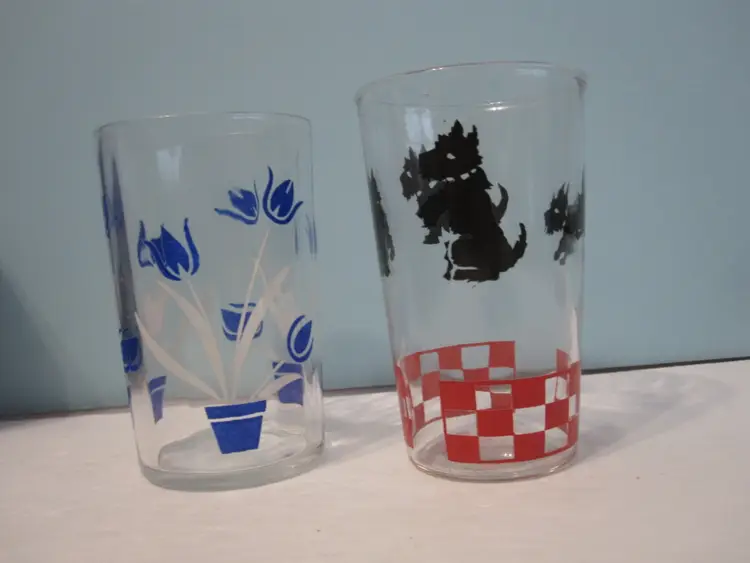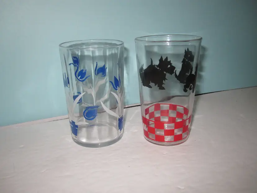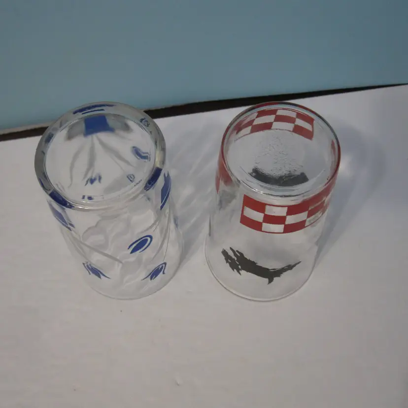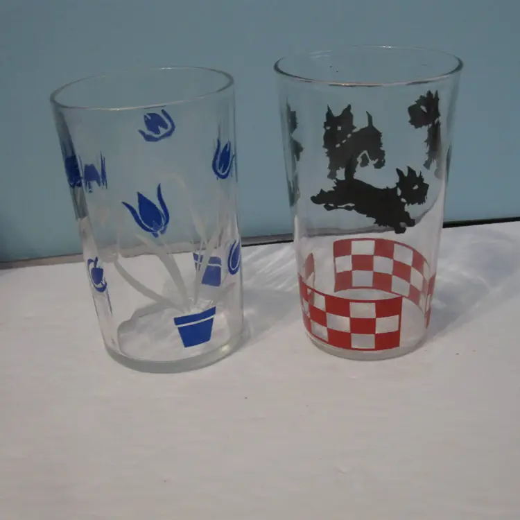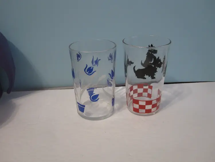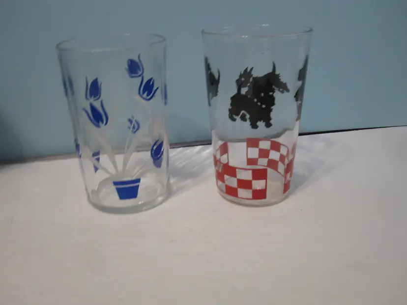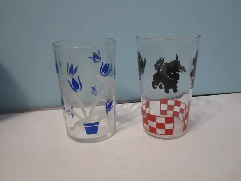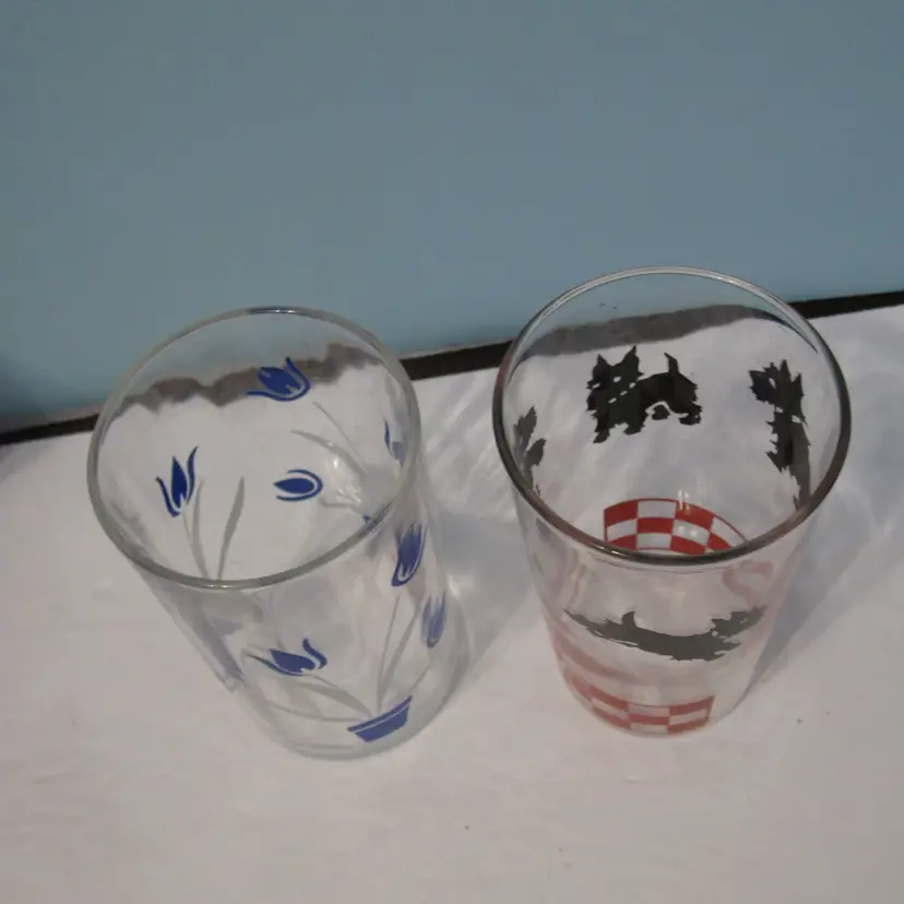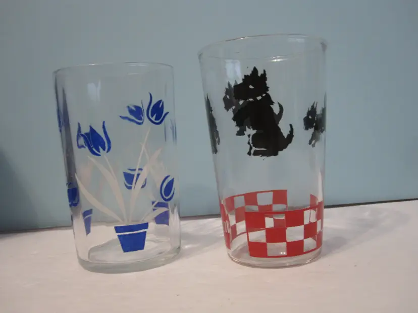 These adorable glasses have some light wear, but still a nice set to use and display. Each cup is about 3 1/2" x 2 1/4" round. This is shipped from a smoke free home. Thanks for looking!