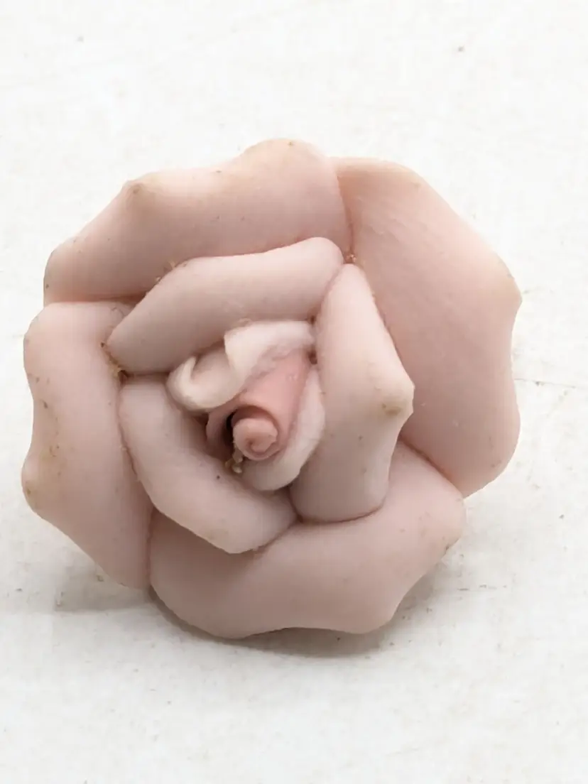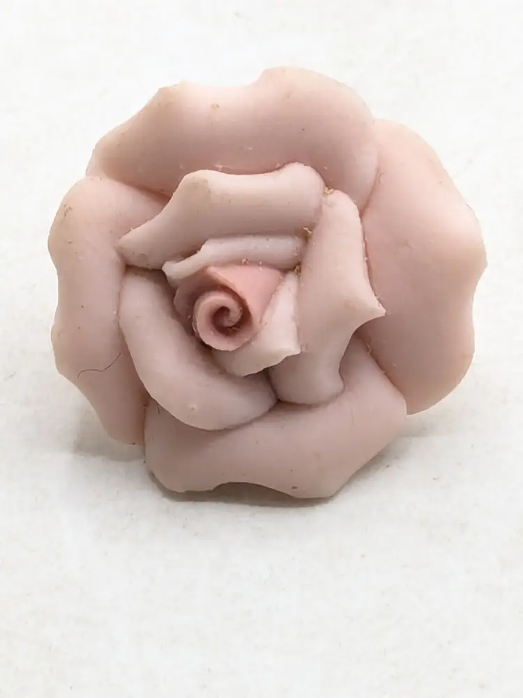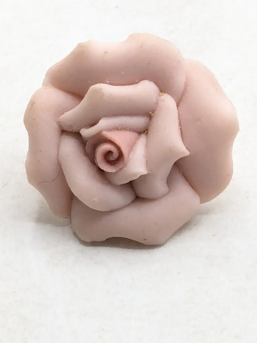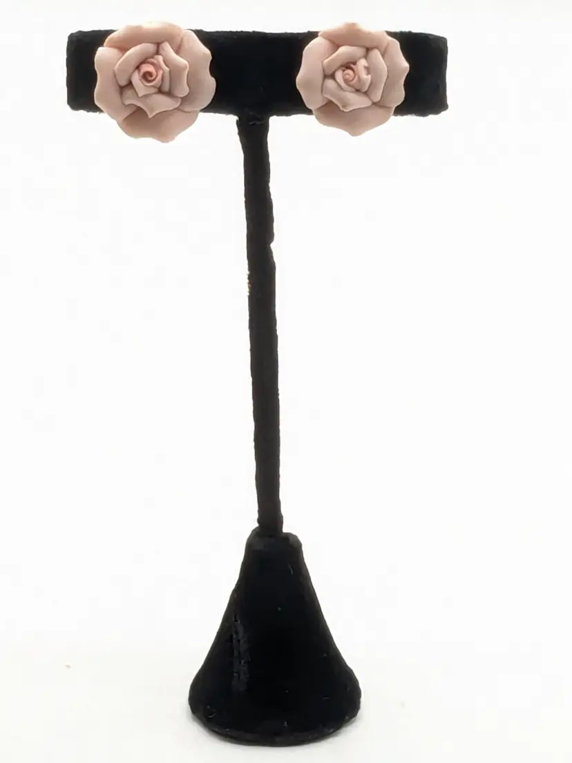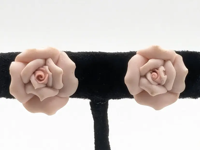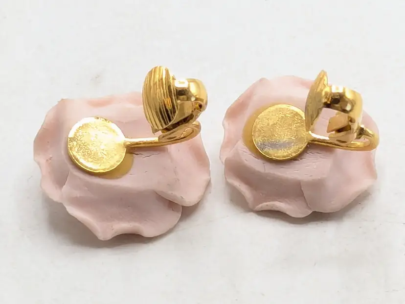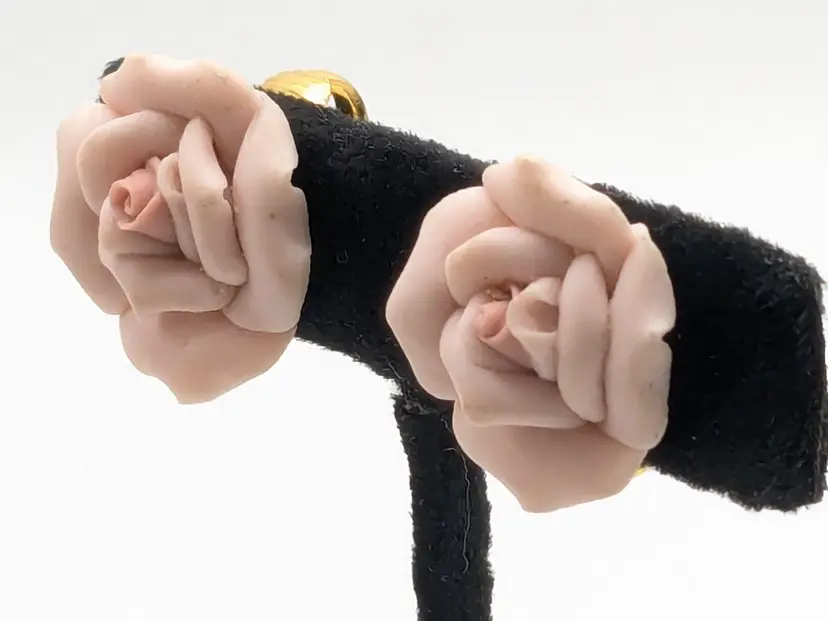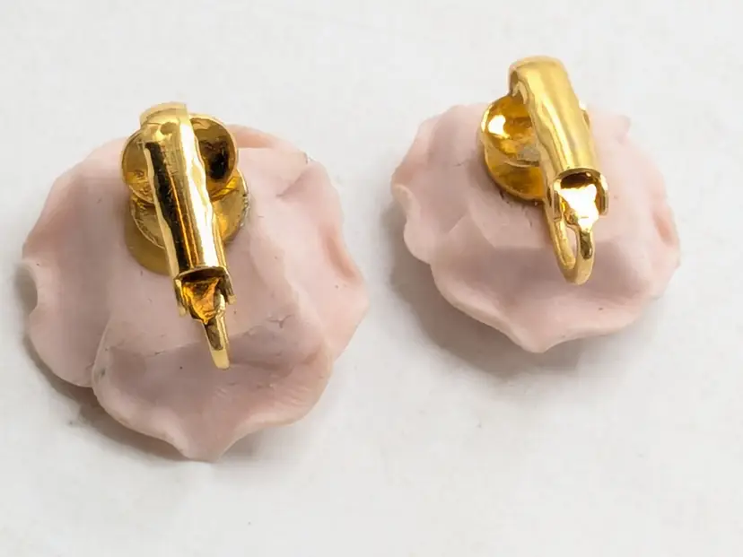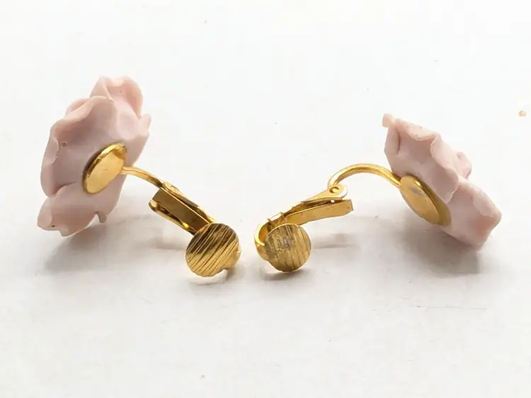 Romantic jewelry! Good condition. Pale pink ceramic roses with gold tone clip backs. Measures 3/4". wen