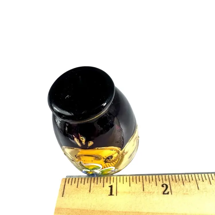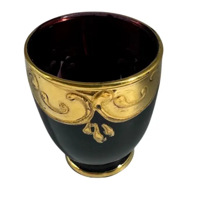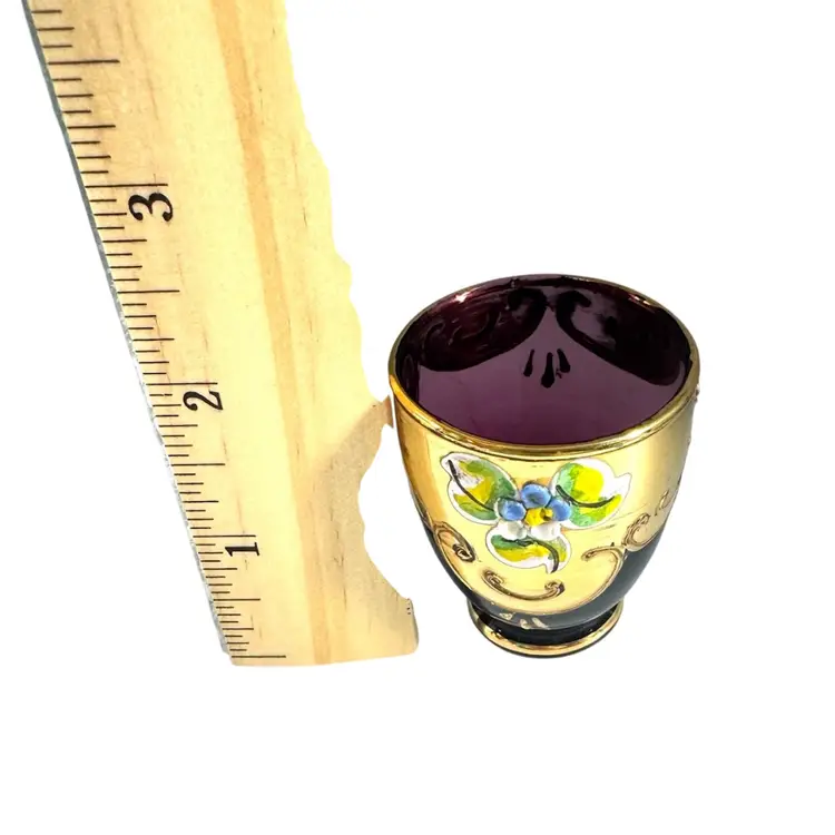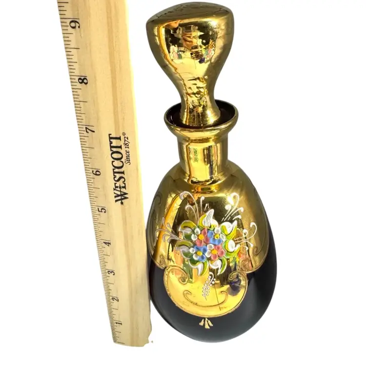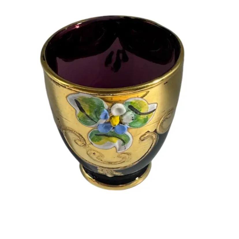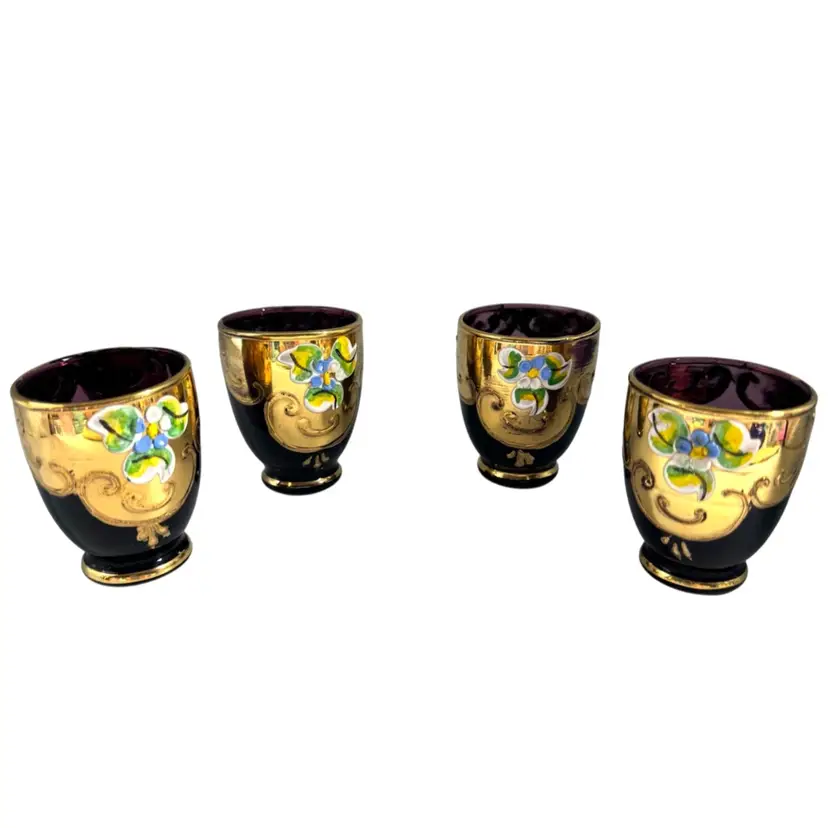 Beautiful 5 piece Bohemian Amethyst & Gold Decanter Set. Back of decanter has pin size gold paint from making and stopper has wear marks.