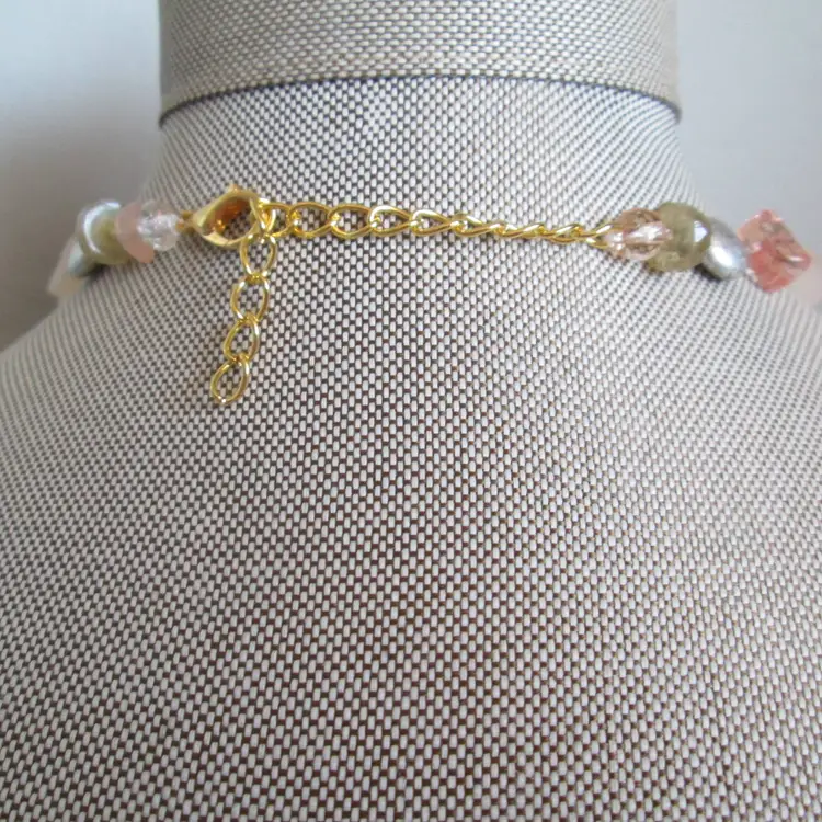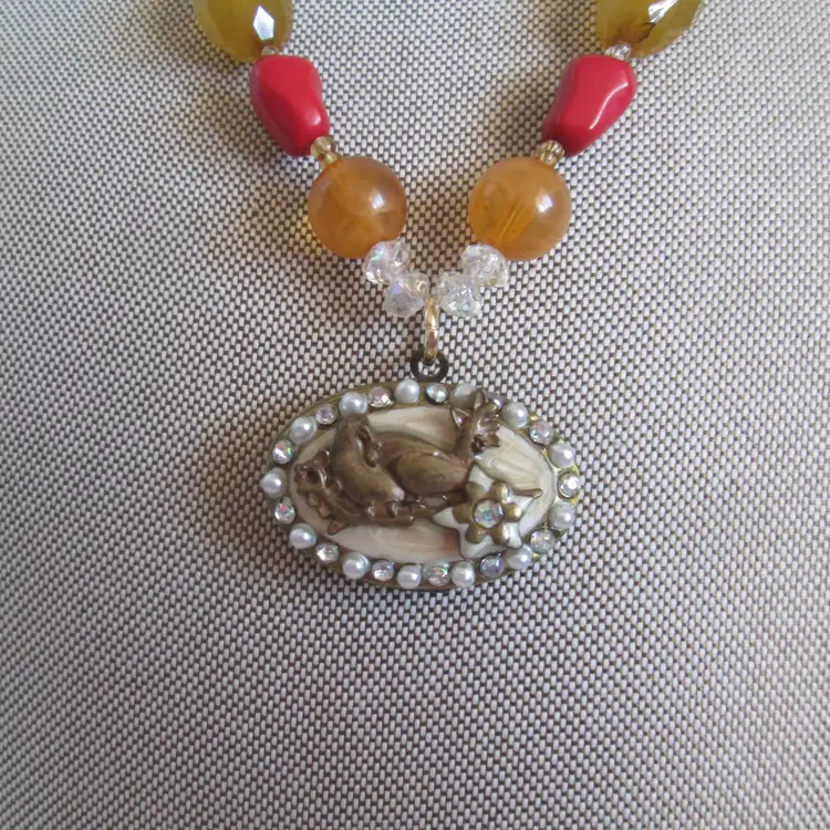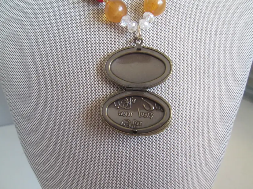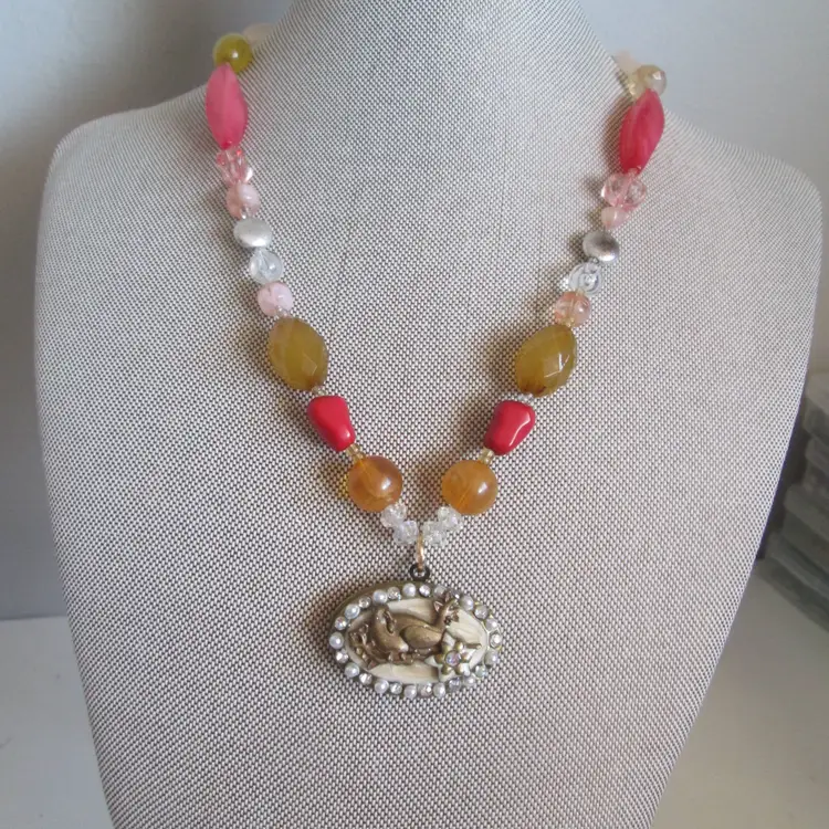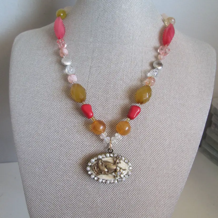Vintage Bohemian beaded necklace with cuddling dove bird locket pendant. The beads are a mix of acrylic and metal. The locket measures 1 1/4" x 1 1/2". The length of the bead necklace measures 18" to 19" with adjustment. This is an upcycled design using vintage beads and jewelry findings.