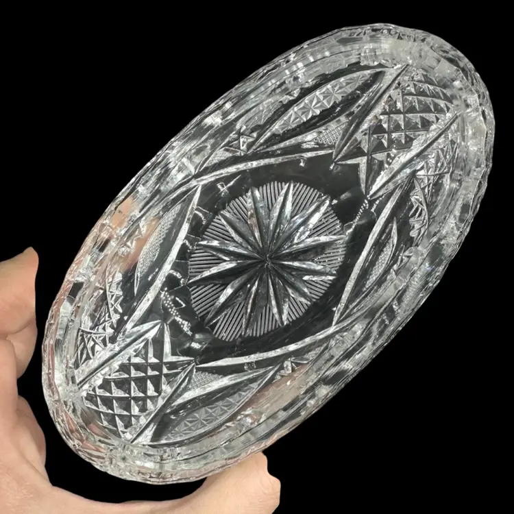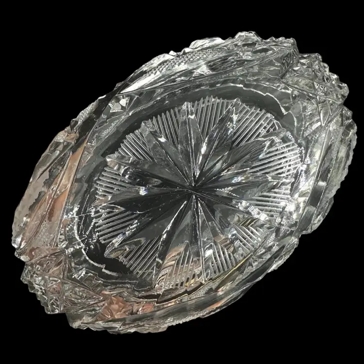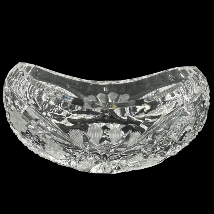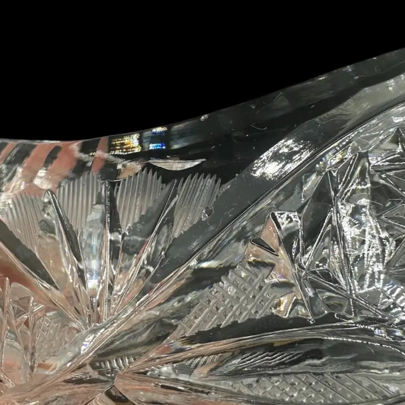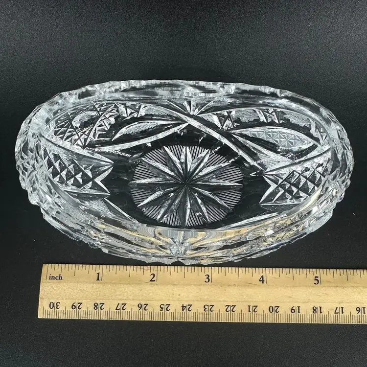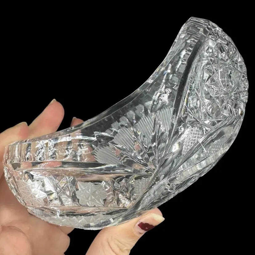This is a vintage Bohemian styled dish made of clear crystal. It features etched designs on the exterior. There is a white fragment/air pocket within the glass as well as very small chipping, as pictured. No signatures or cracks. Dish measures approximately 4.25” long and 2” deep.
