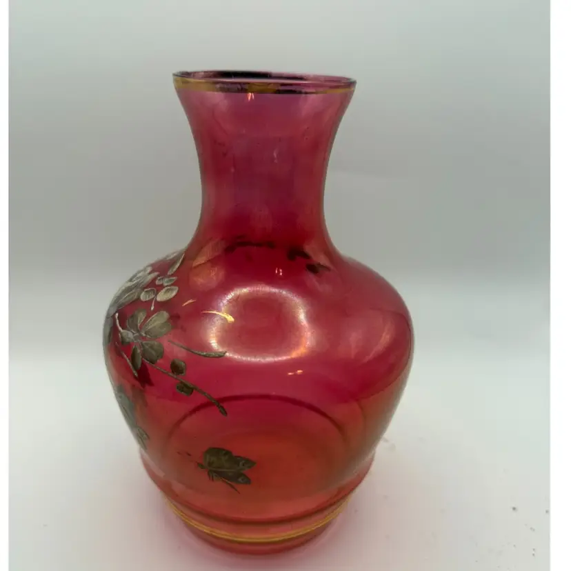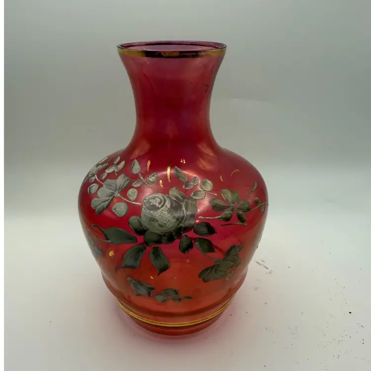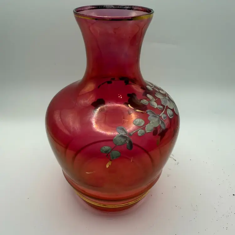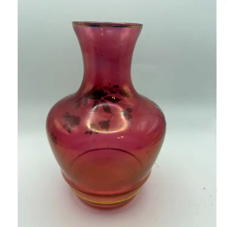 The style of this vase, with its cranberry glass body, hand-painted floral decoration, and gold accents, is characteristic of the late 19th to early 20th century. The iridescent quality, often achieved through metallic salt applications, adds to its decorative appeal and collectible value.