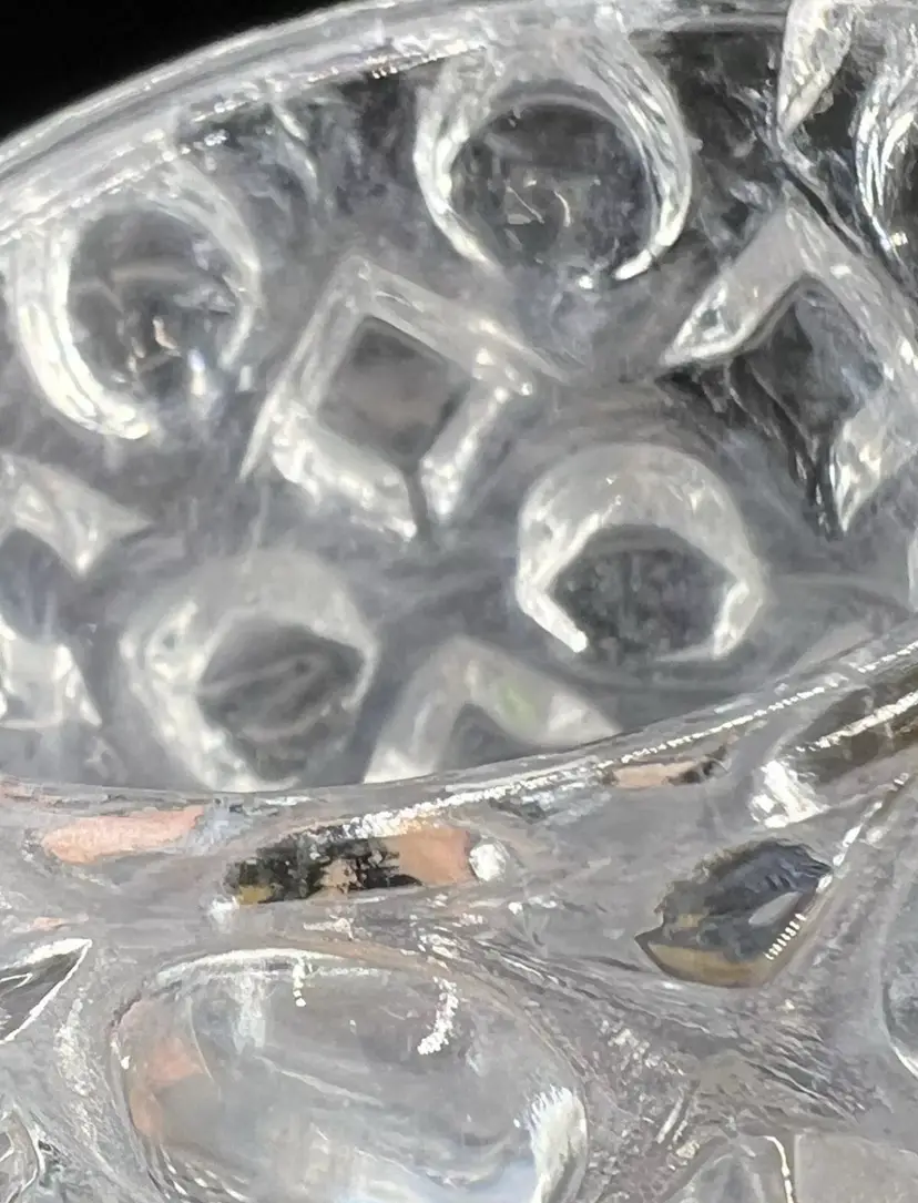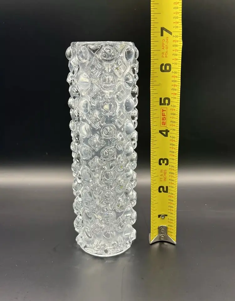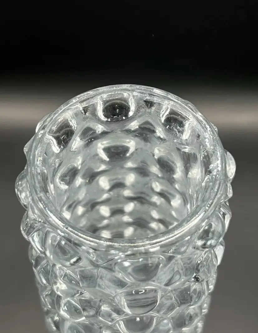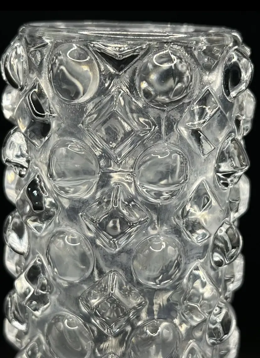 It has a rounded hobnail and diamond hobnail pattern. A few of the hobnails on the bottom edge feel a little rough with possibly chips. The glass is cloudy in some spots. Please see all pictures!