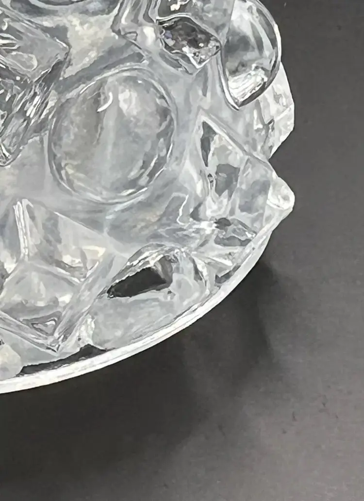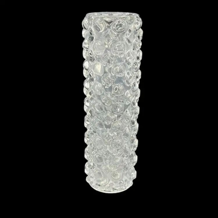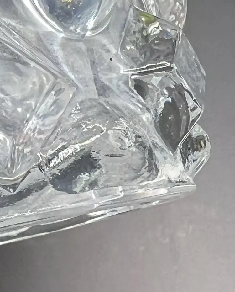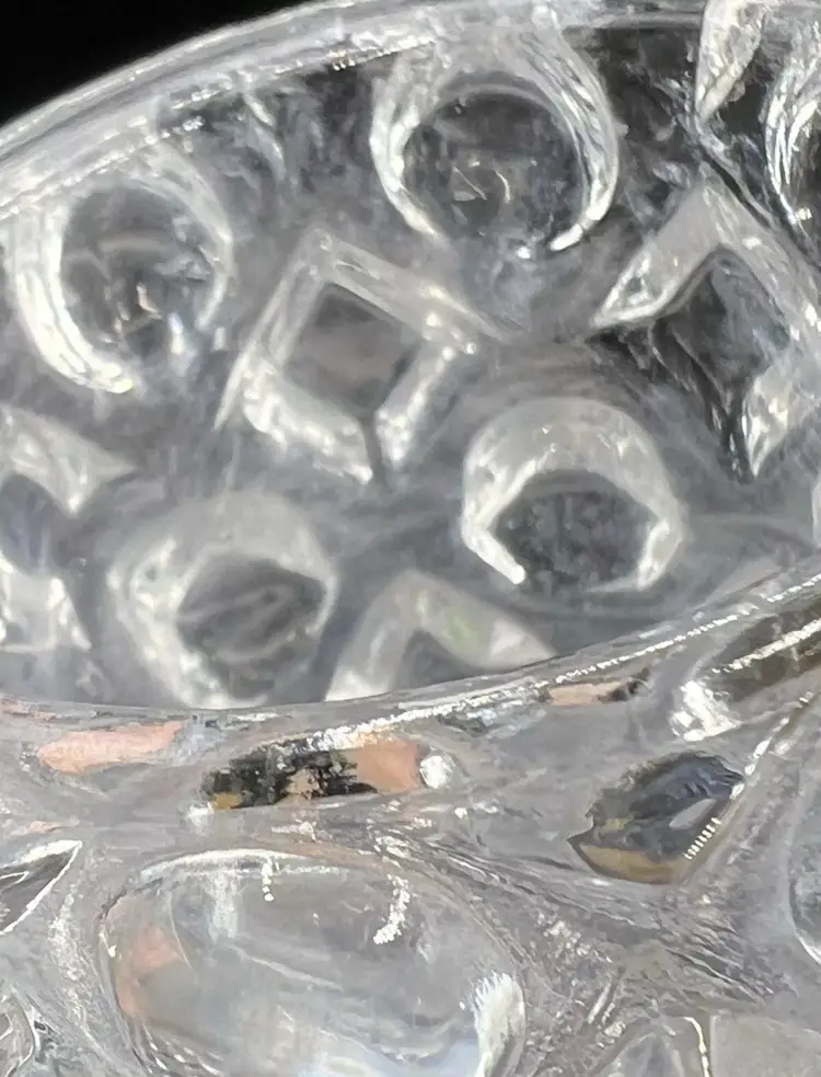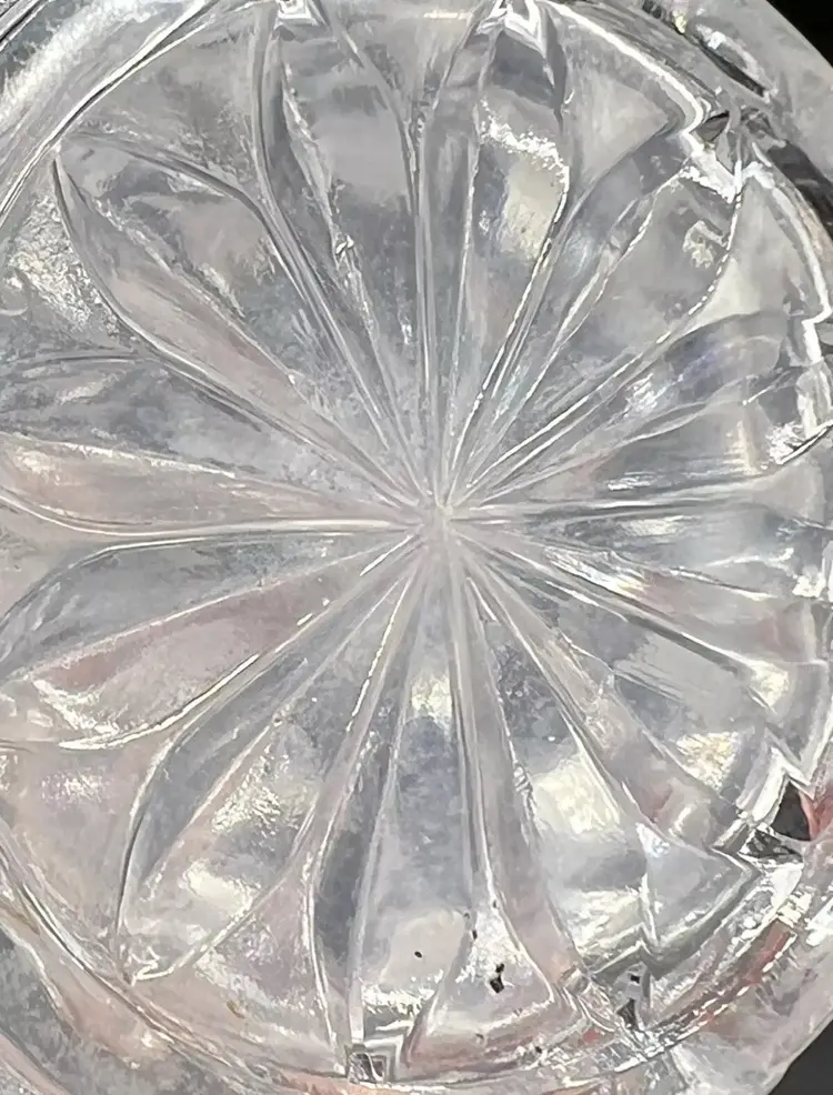 It has a rounded hobnail and diamond hobnail pattern. A few of the hobnails on the bottom edge feel a little rough with possibly chips. The glass is cloudy in some spots. Please see all pictures!