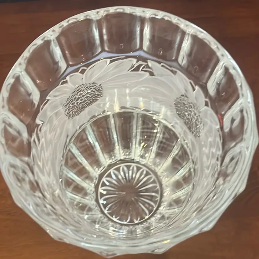 This particular vase, with its frosted sunflower motif and ribbed detailing, exemplifies the decorative artistry often associated with mid-20th century European glass. The style, reminiscent of Lalique, suggests an influence from Art Nouveau and Art Deco aesthetics, focusing on natural forms and elegant textures. Such pieces were popular as decorative items and functional vases, adding a touch of sophistication to interiors.