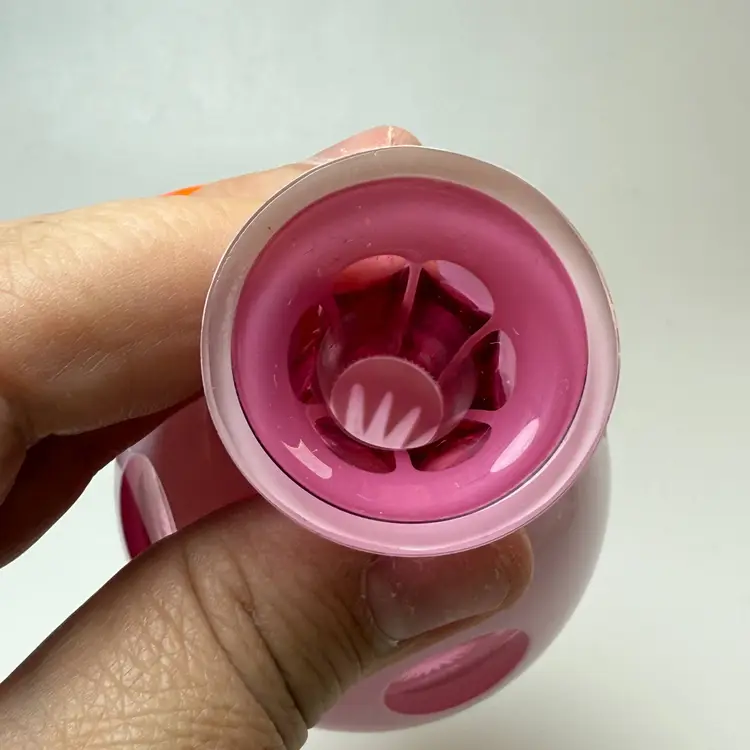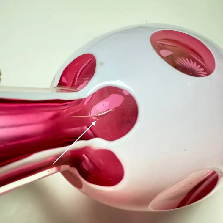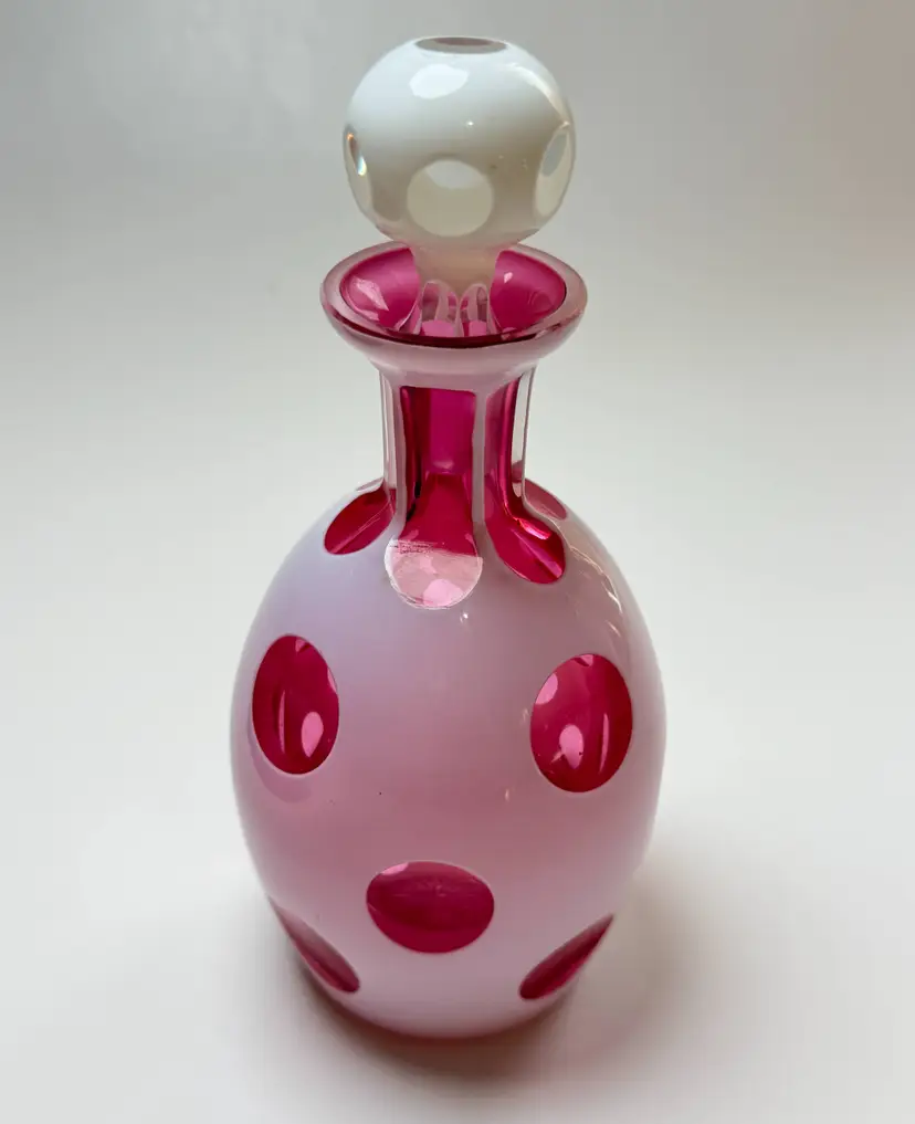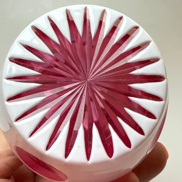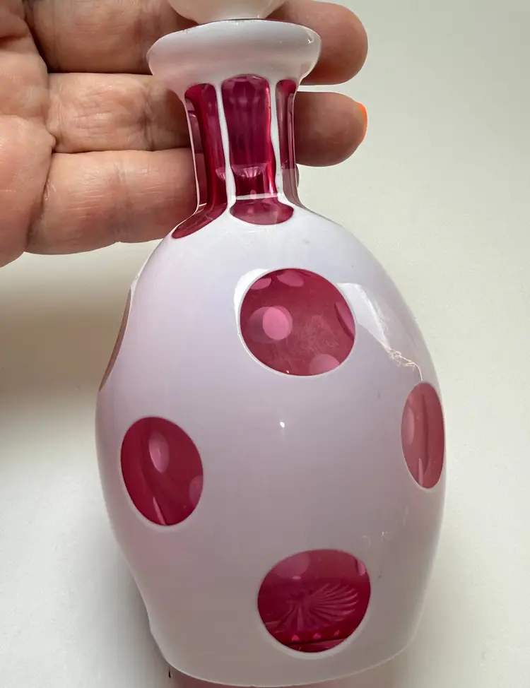 6.25" tall x 2" diameter base. No chips, no cracks. Please see the last photo. There is a line on the shoulder that I think is a stretched bubble as viewed under a magnifier. Starburst base. Most likely from the 1920s or 1930s. Could also be a vanity bottle of some sort.