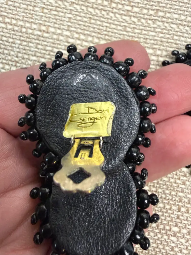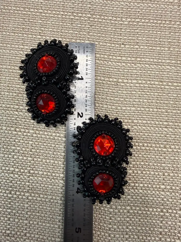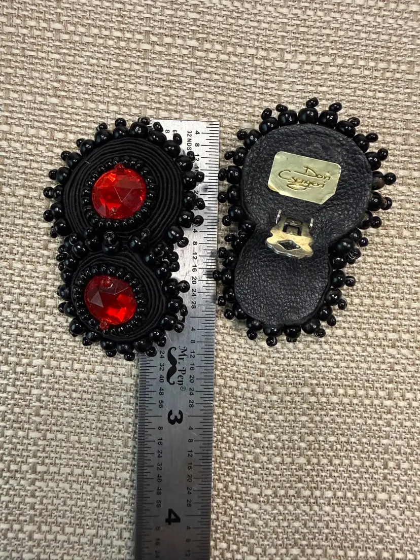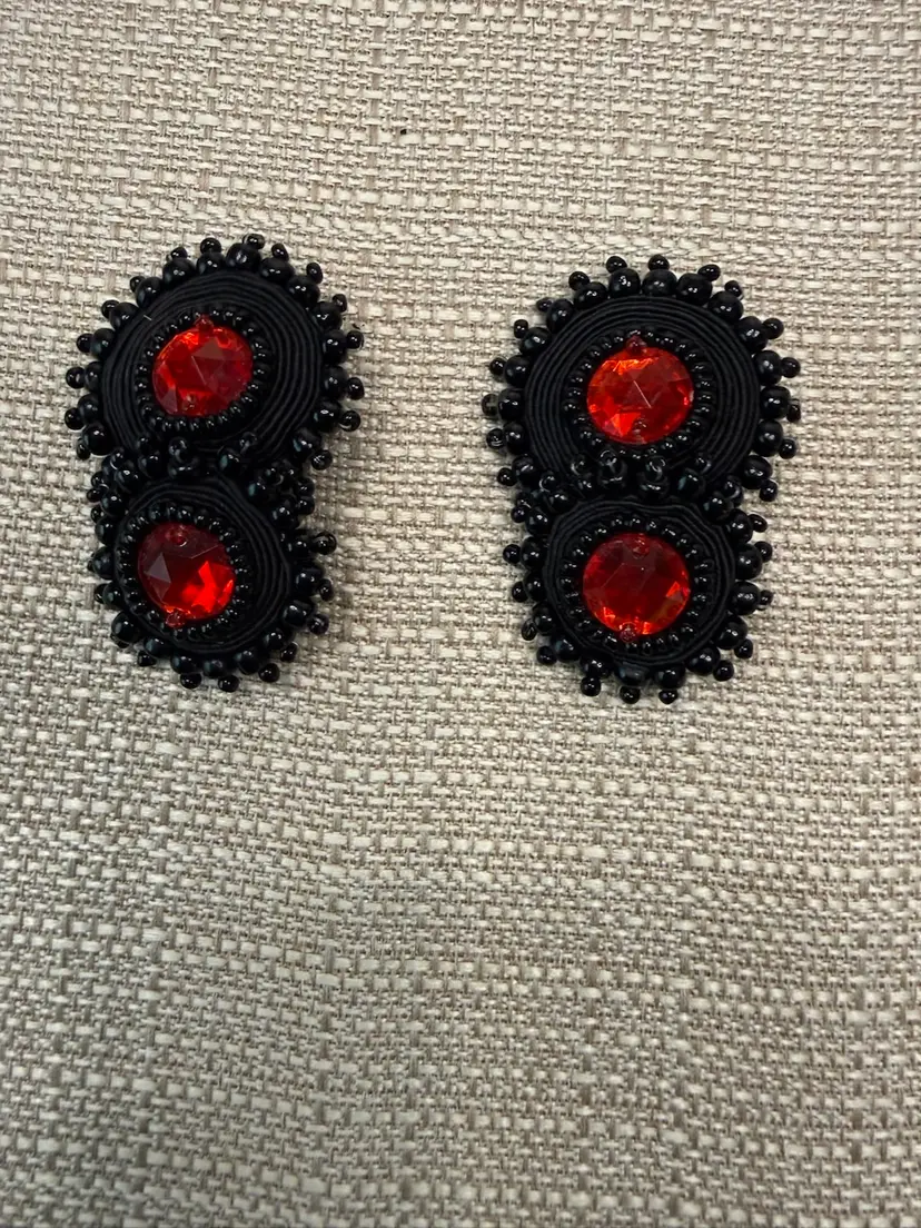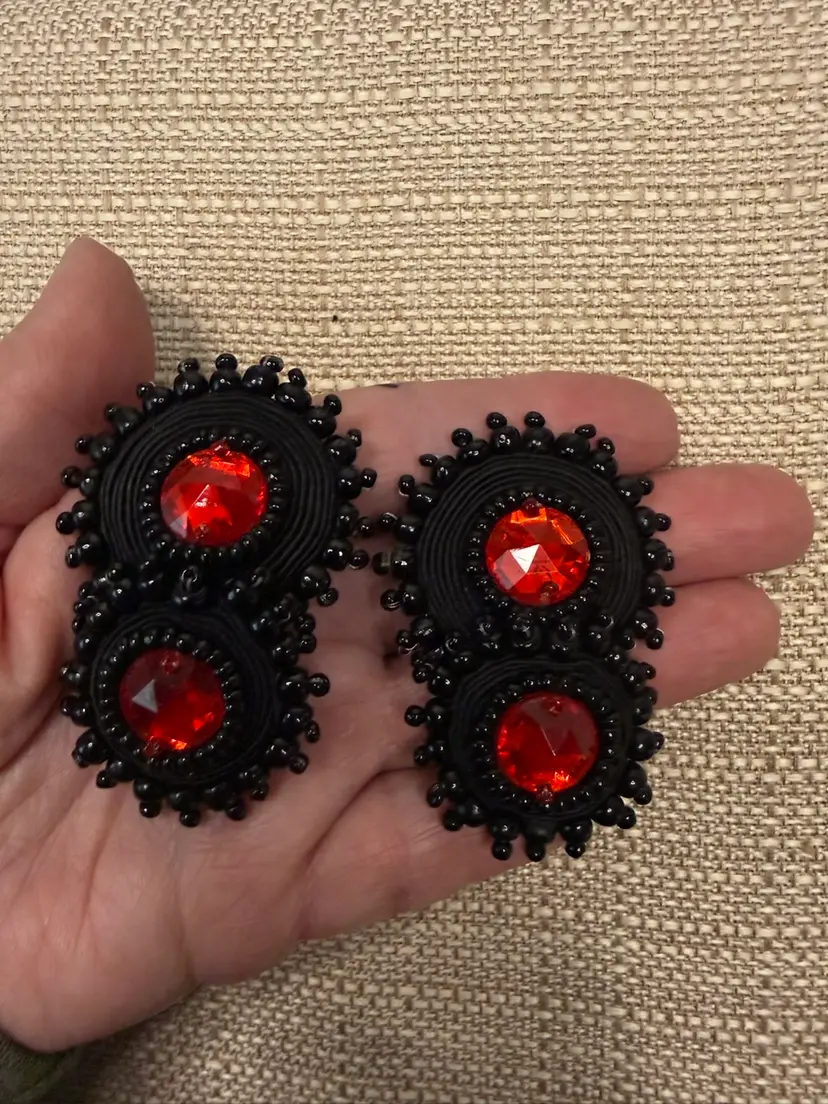 These Vintage BOHO STATEMENT Black/Red DORI Csengeri Soutache Earrings are a unique and handmade piece of jewelry. The earrings feature black soutache with red crystal accents, measuring 2.5 inches in length. The statement style and beaded design add a touch of vintage charm to any outfit. Made in Israel by the brand Dori Csengeri, these earrings are signed and sure to make a bold fashion statement with their eye-catching colors and design. ONE OF A KIND