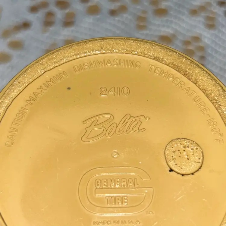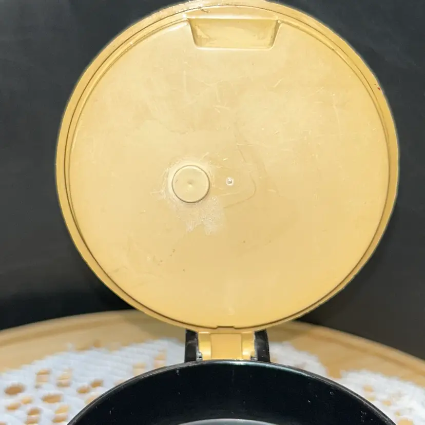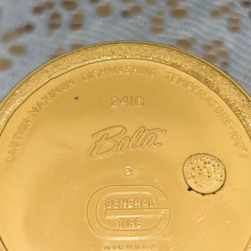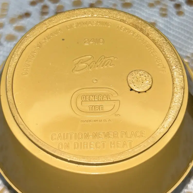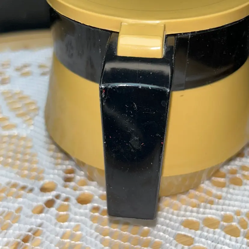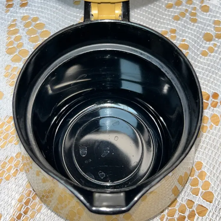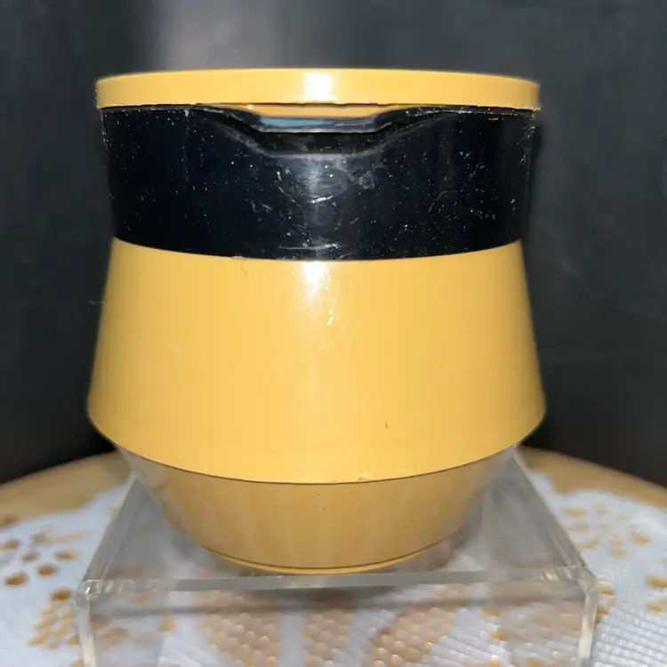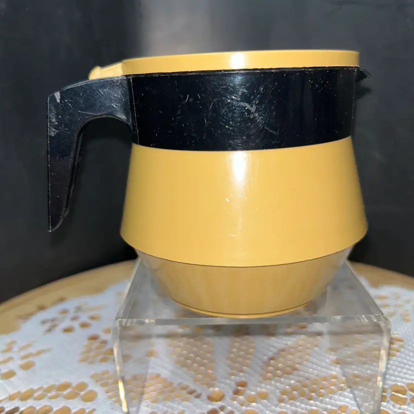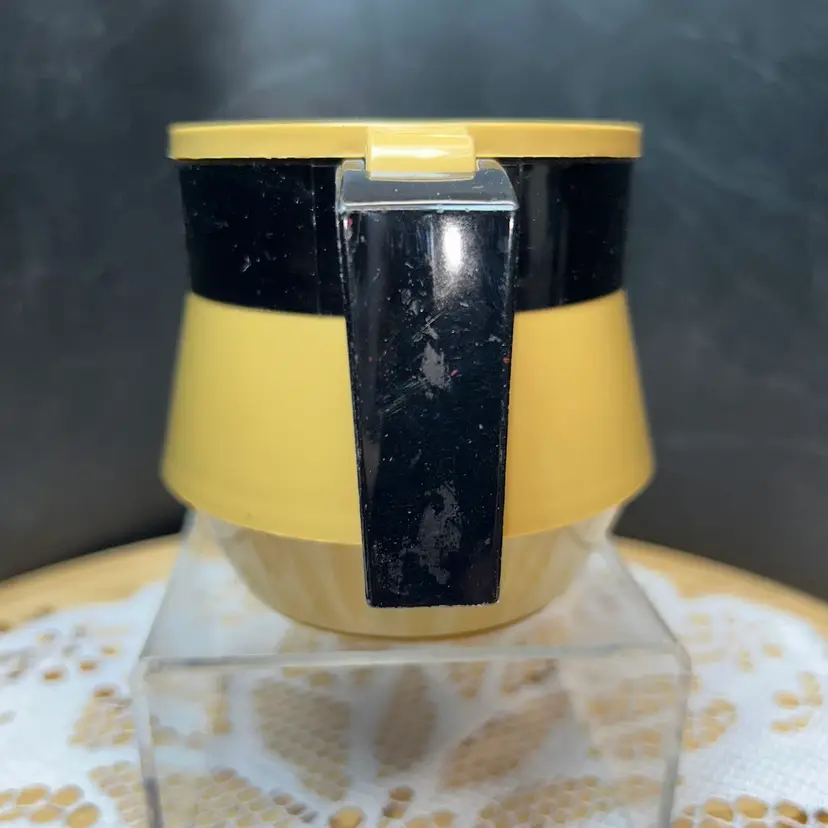 Yellow and black 3.5” tall, 3.5” diameter across top, creamer or individual coffee pitcher. Hard to find. In very, good condition. Plastic.
