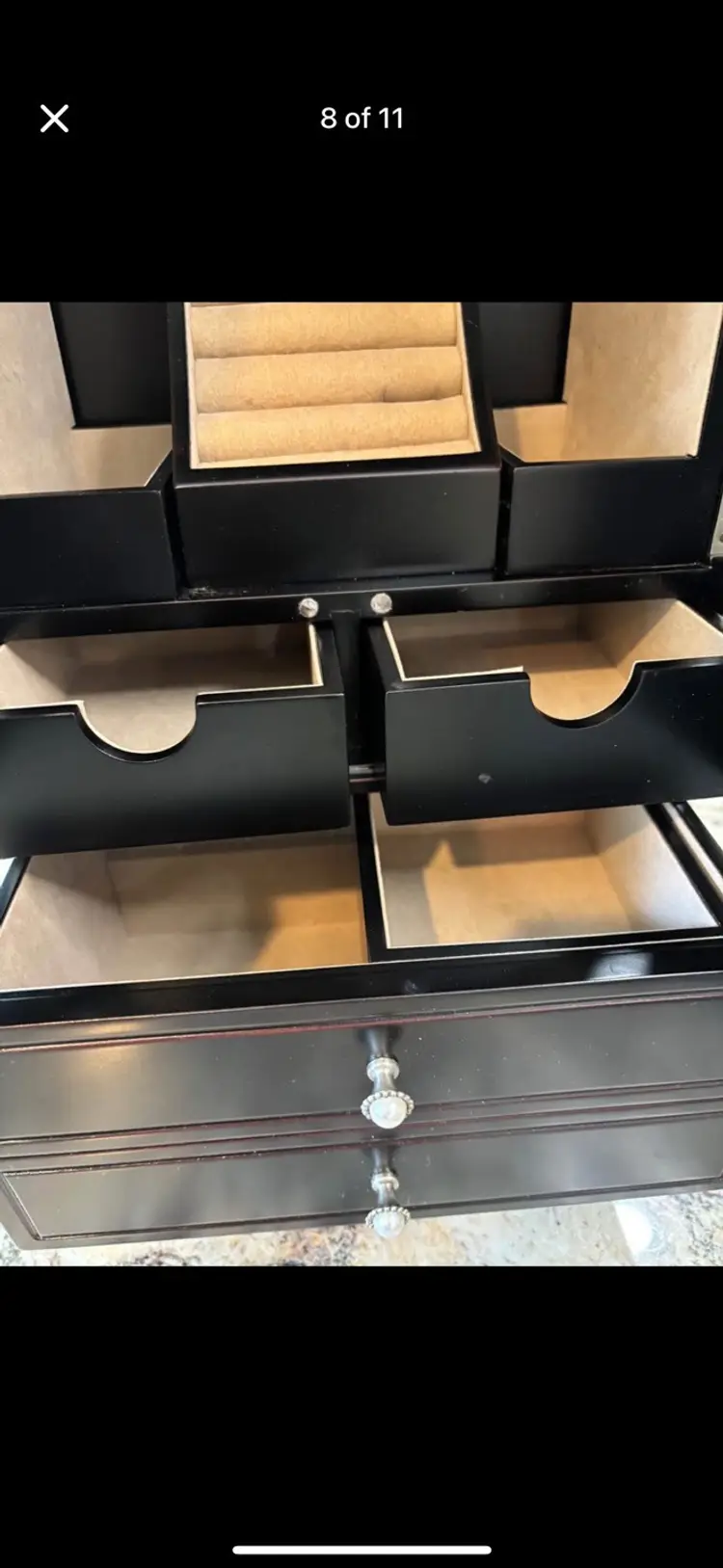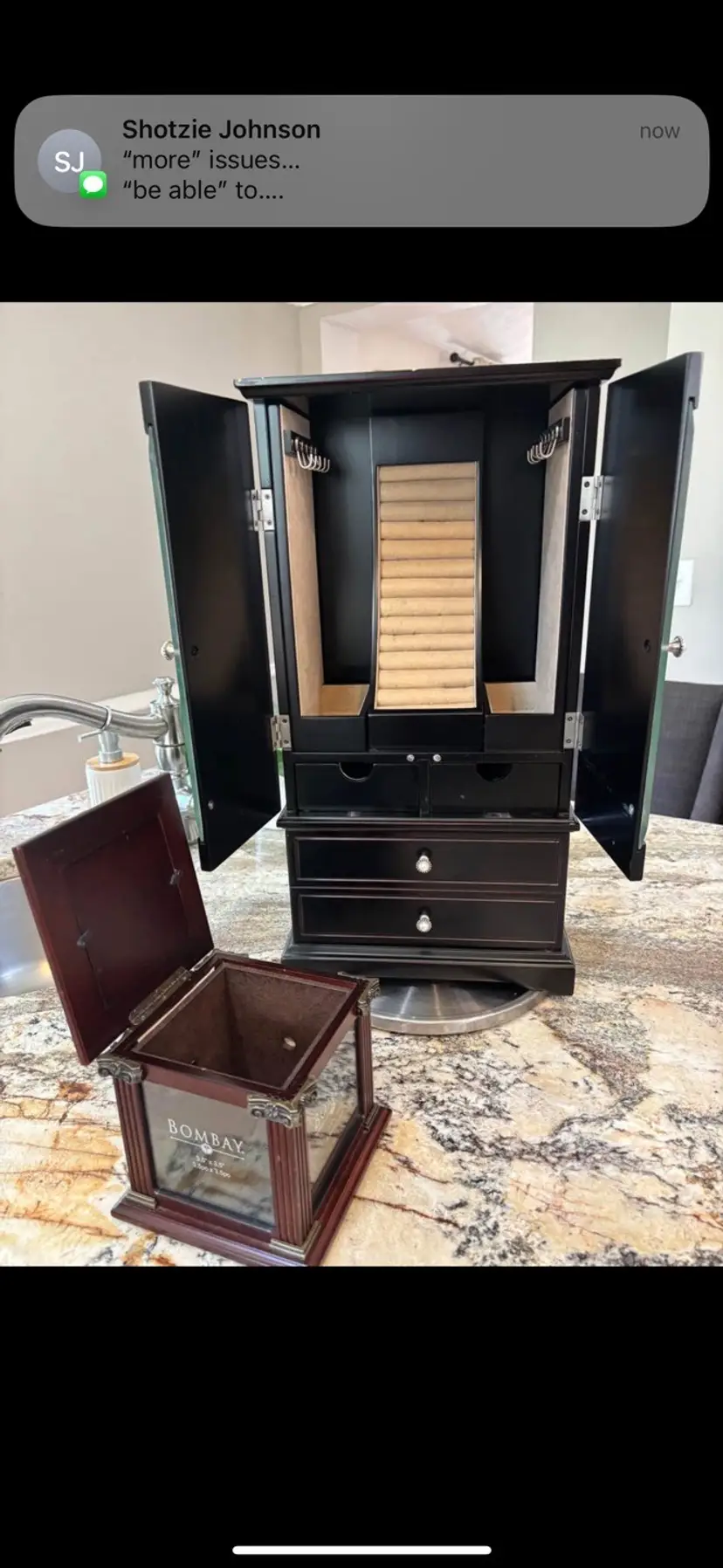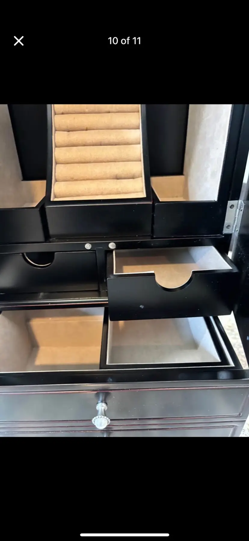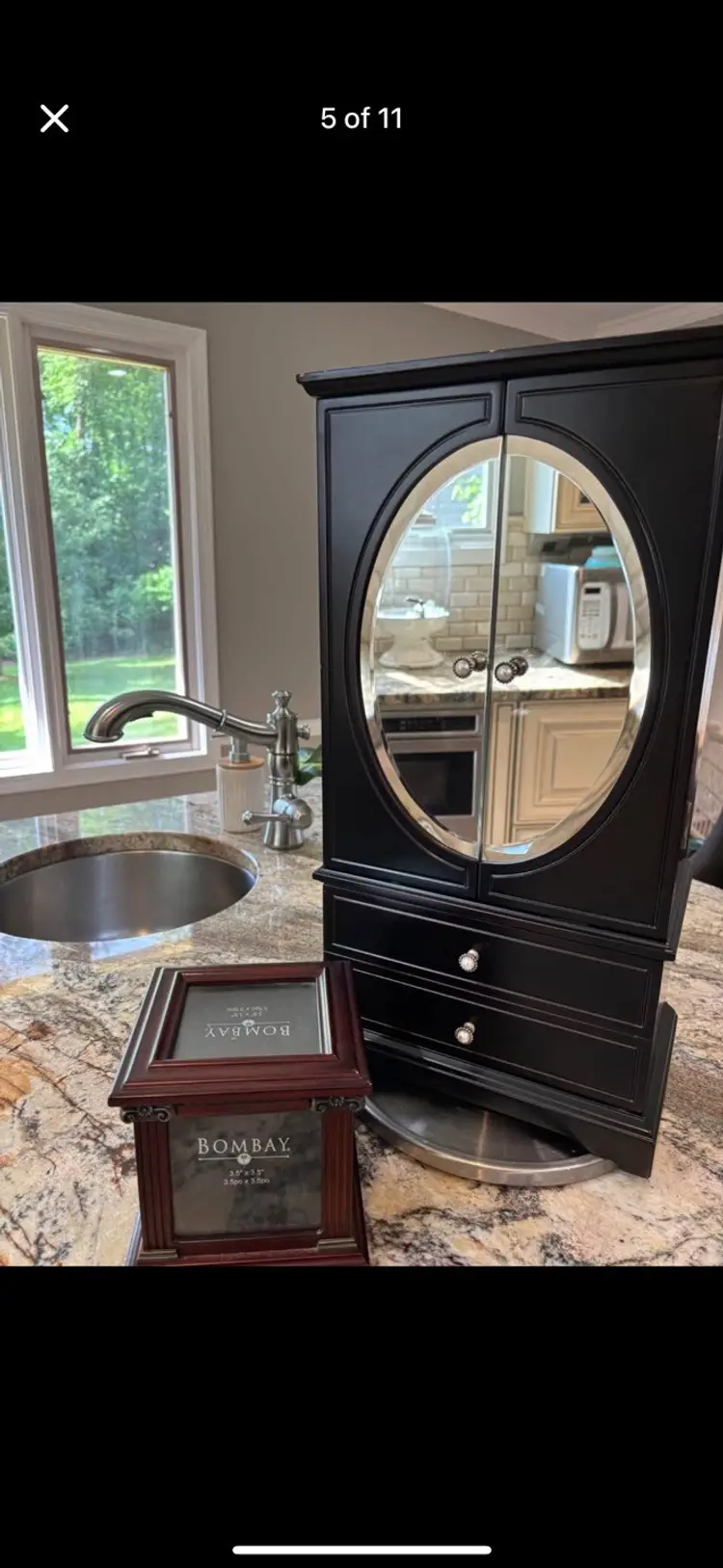 Vintage Bombay Jewelry Cabinet Box and small Keepsake Box set .Chest Organizer Ring Hanger Drawers Mirror doors The Jewerly cabinet is 20" tall and 11" wide. The small Bombay box is 3.5 x 3.5 . See small paint chips in video and pictures on boxes.