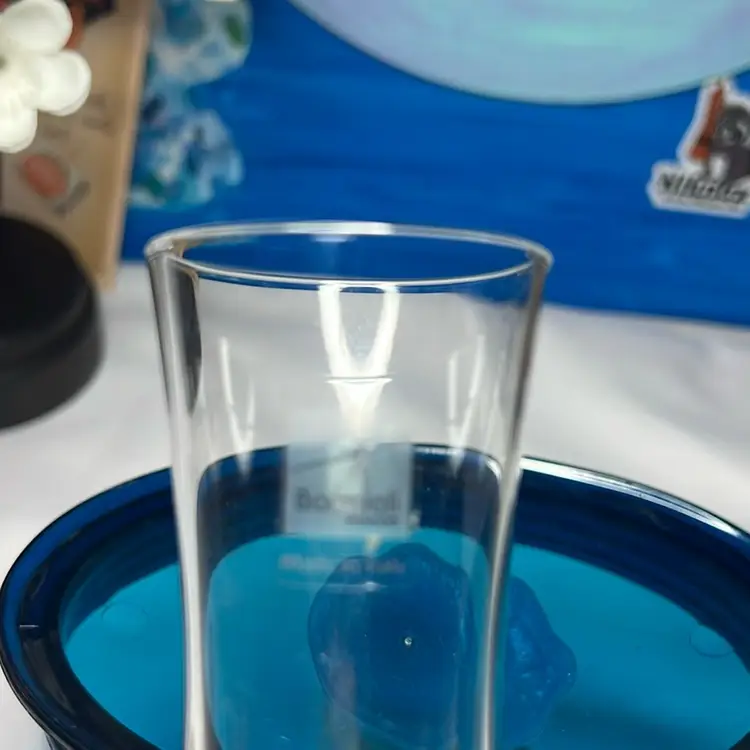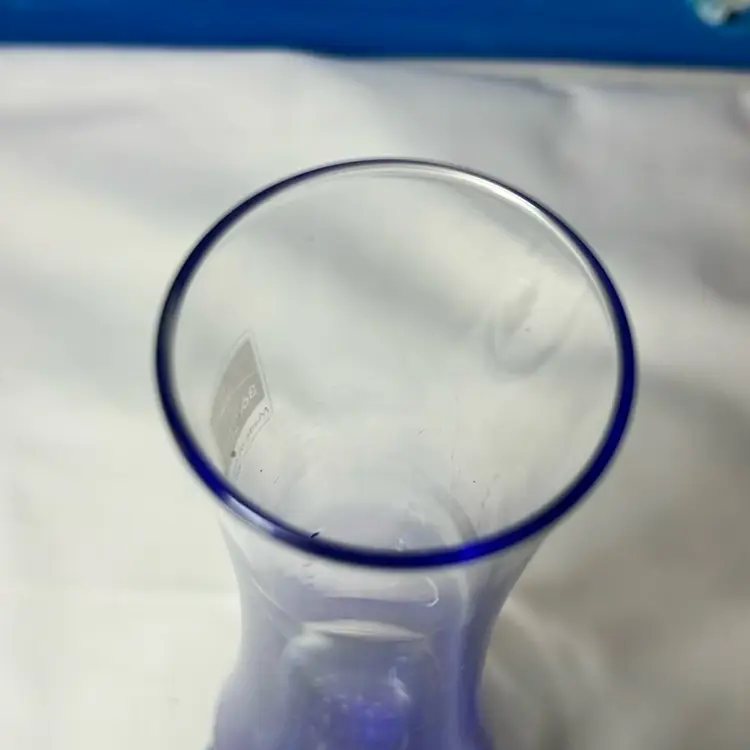 Made in Italy by the prominent Italian company Bomioli Rocco co. Hand blown with controlled bubbles and a scalloped cobalt blue base. No damage & measures 7.5” tall & 2.5” wide