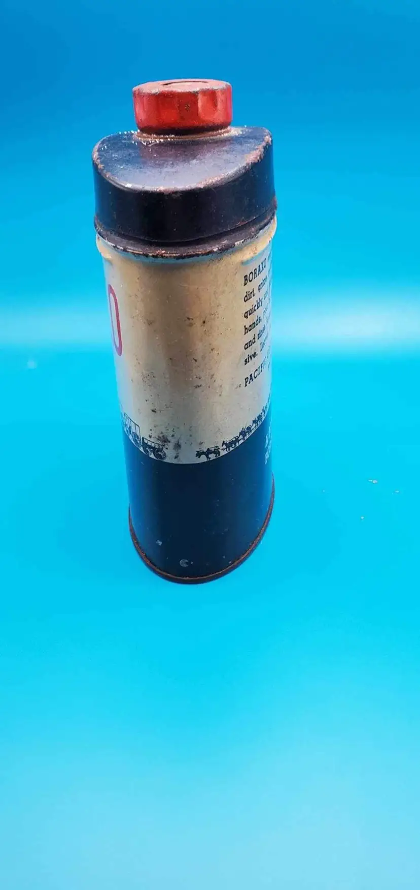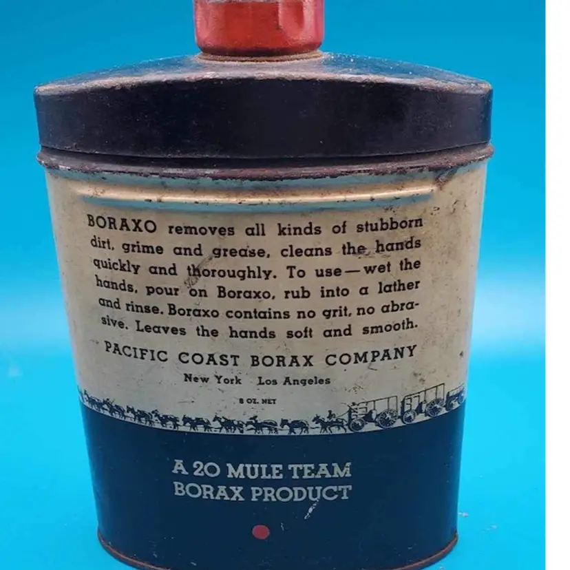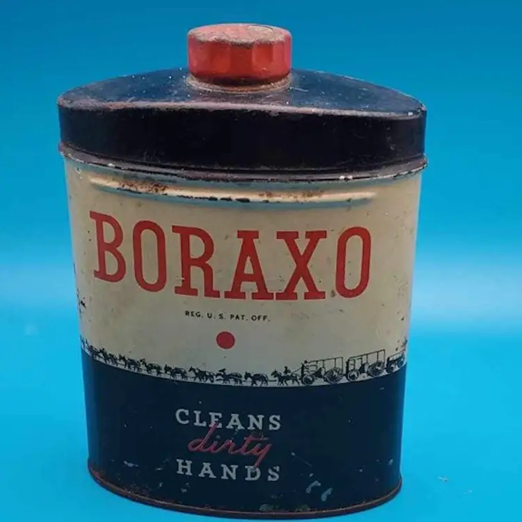 Vintage Boraxo hand soap tin with powdered soap. Great assemblage piece and piece for old garage. In rusty crusty condition but lid does open and shut. Great piece of old Americana. In red white and blue. Still smells like Boraxo