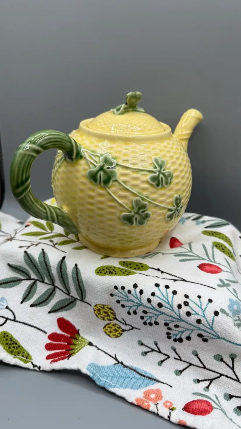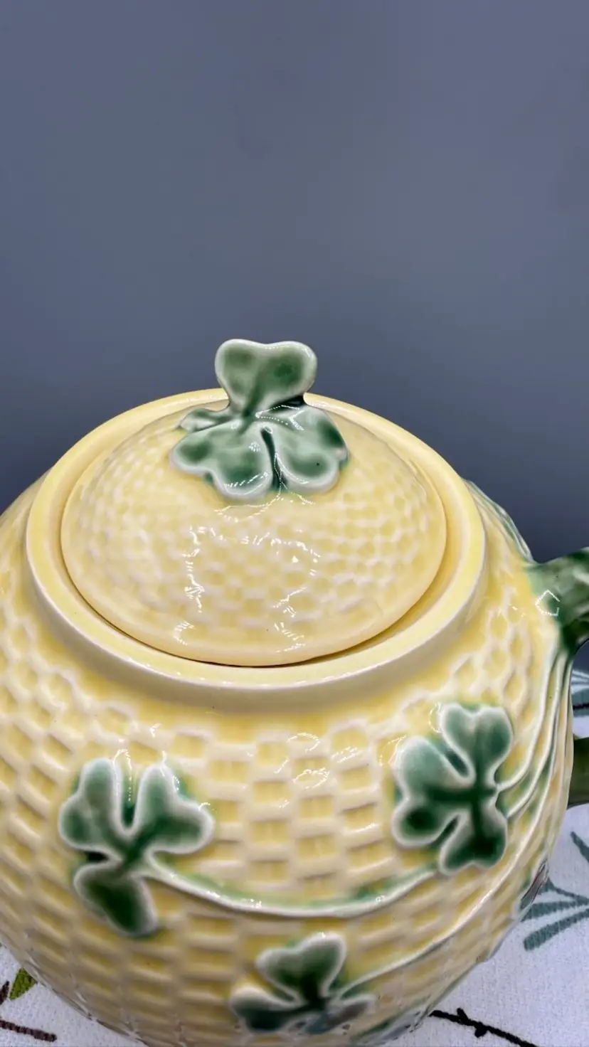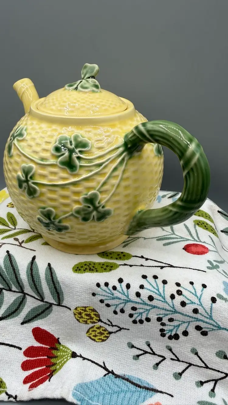 Crafted in Portugal, this piece features the iconic Yellow Basketweave pattern beautifully adorned with embossed green shamrocks. Brand: Bordallo Pinheiro (Portugal). Pattern: Shamrock (Green Clover on Yellow/Cream Basketweave). Material: Glazed ceramic / Majolica style. Excellent condition looks brand new. No chip
