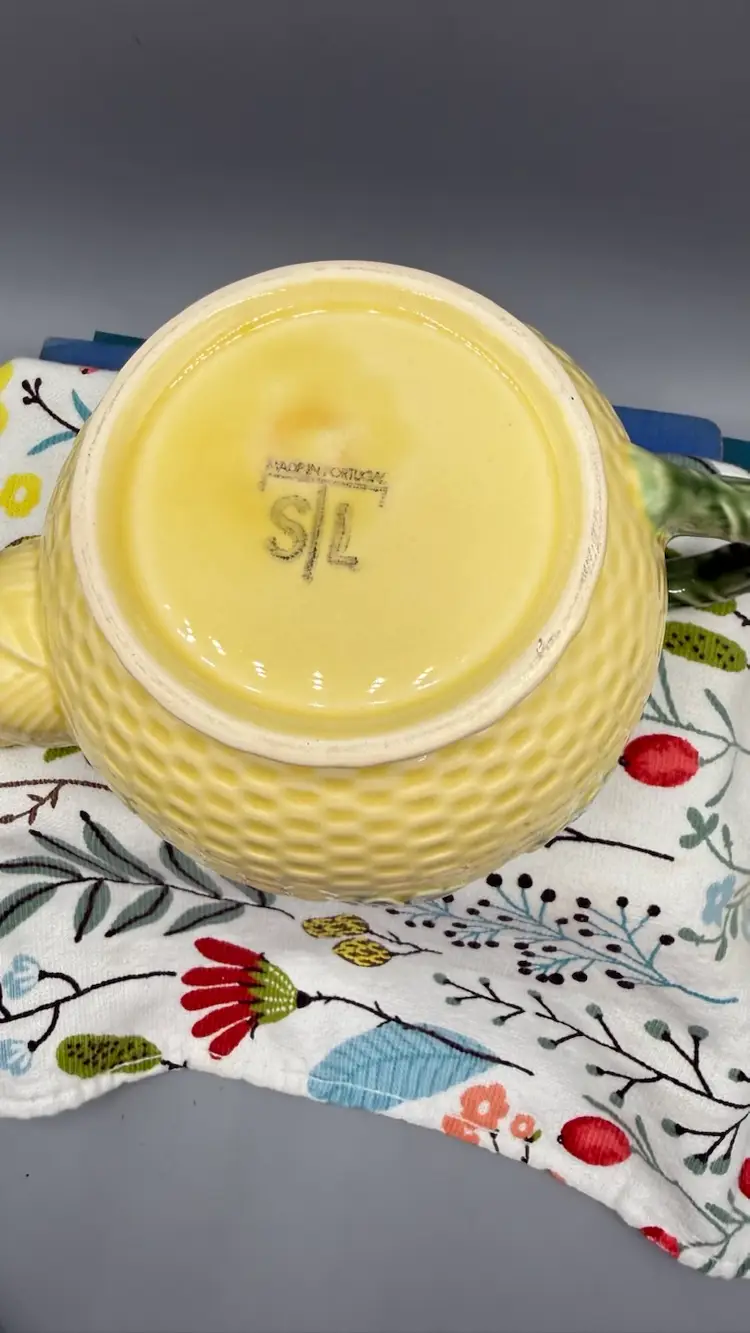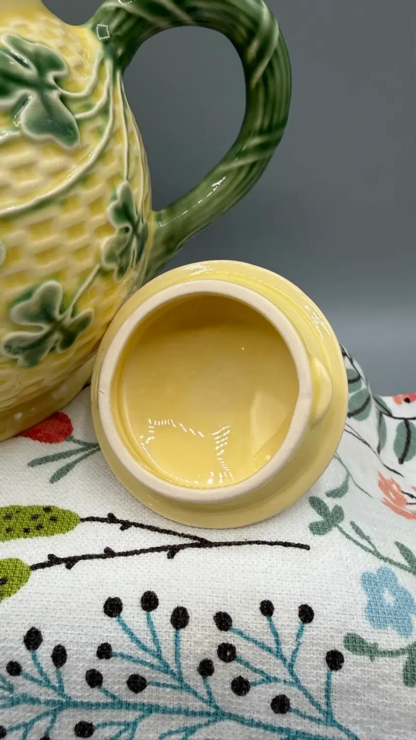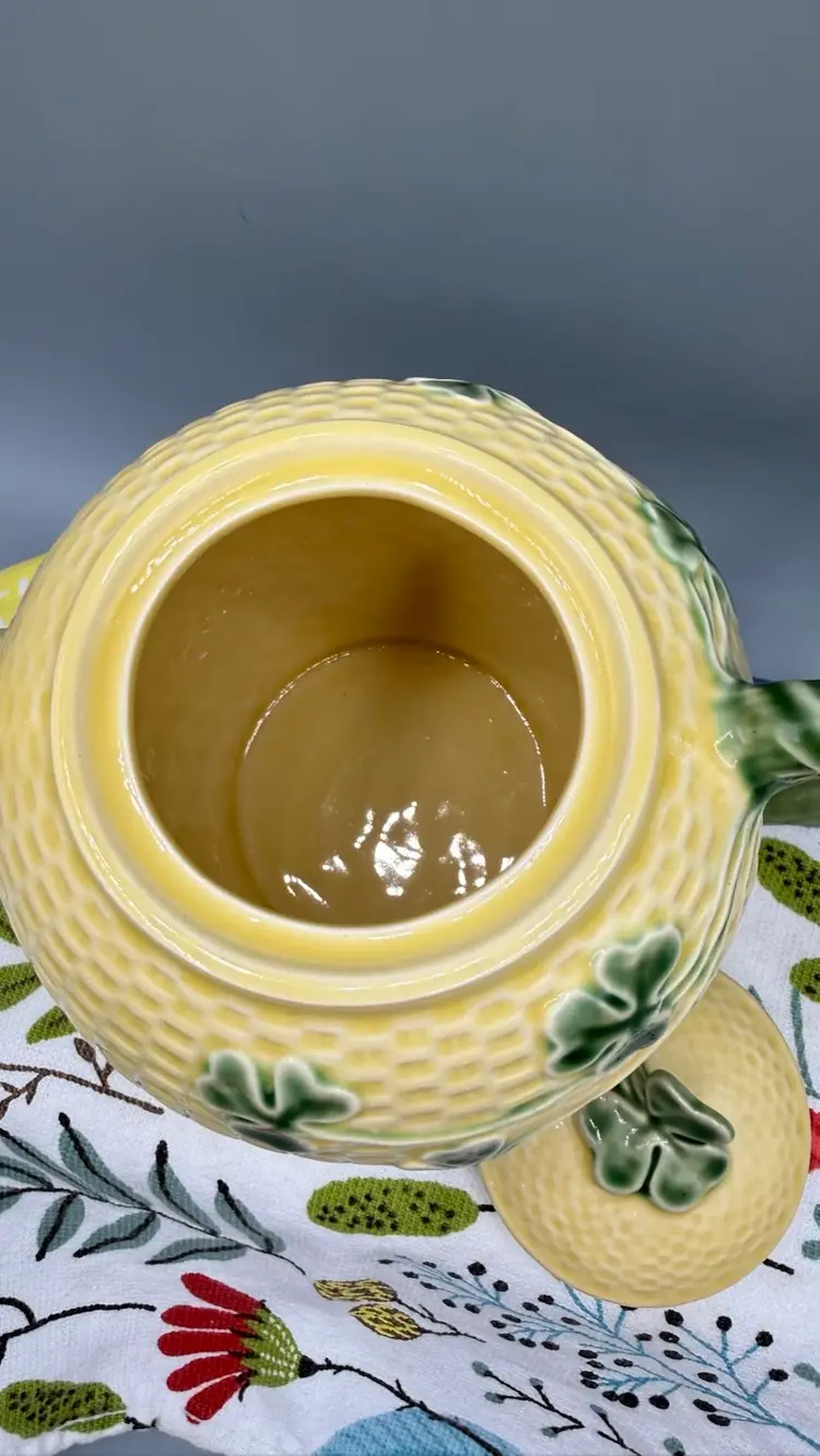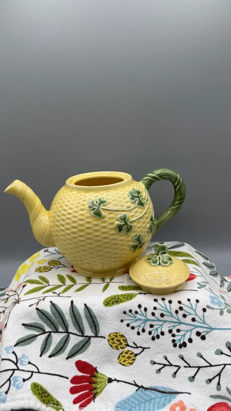 Crafted in Portugal, this piece features the iconic Yellow Basketweave pattern beautifully adorned with embossed green shamrocks. Brand: Bordallo Pinheiro (Portugal). Pattern: Shamrock (Green Clover on Yellow/Cream Basketweave). Material: Glazed ceramic / Majolica style. Excellent condition looks brand new. No chip