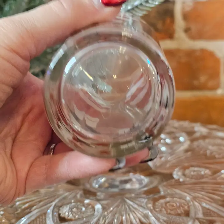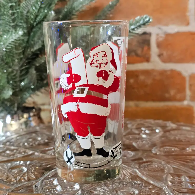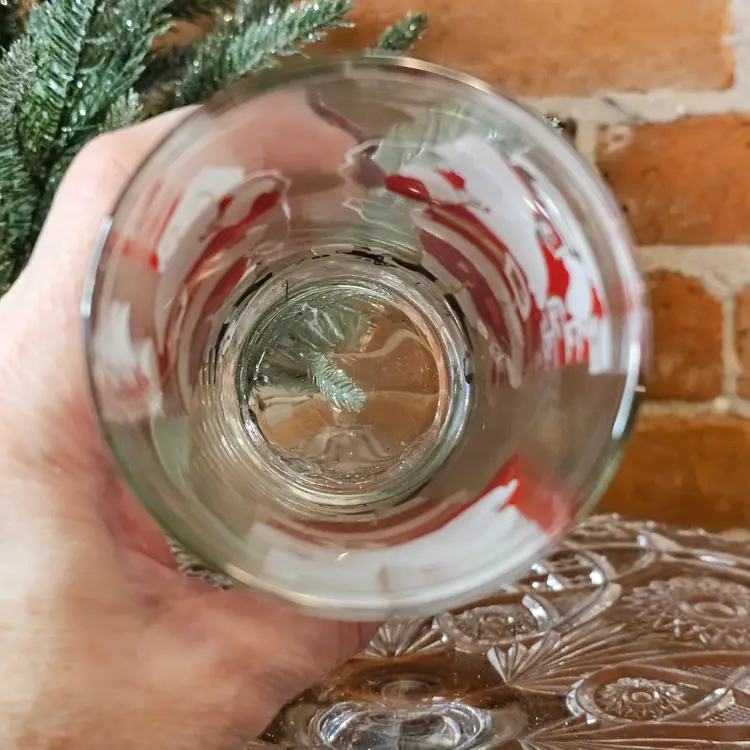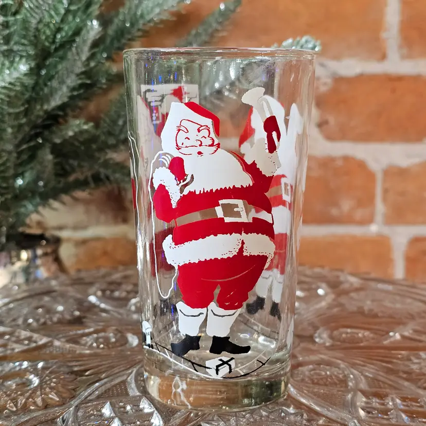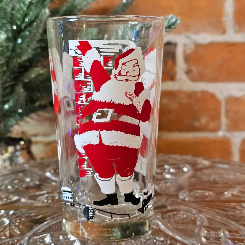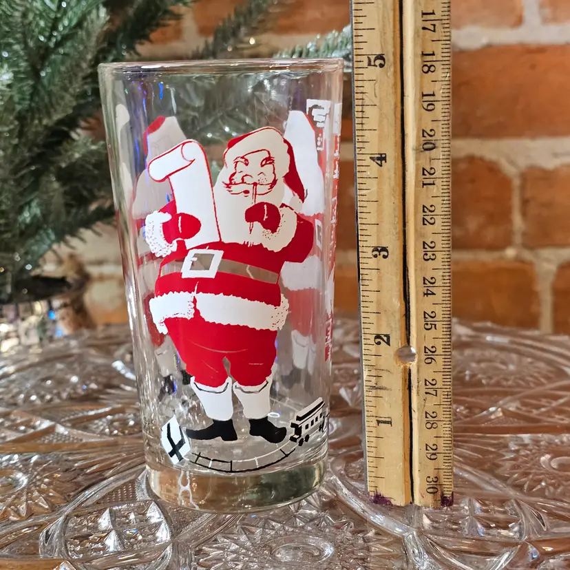 The glass measures 5" tall and shows Santa with a list, a bell and at the chimney. No chips or cracks, colors are bright, no fading.