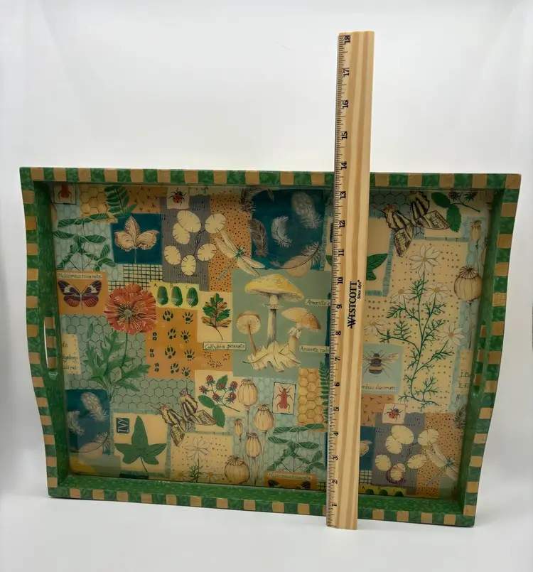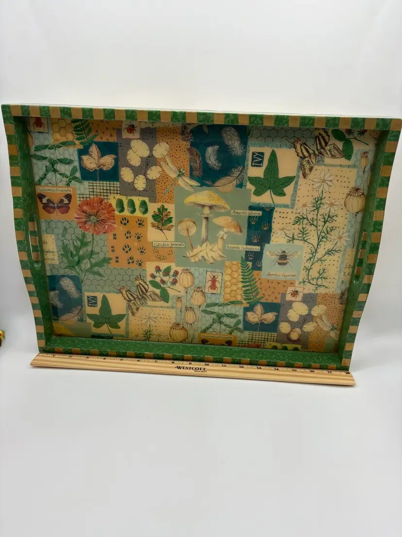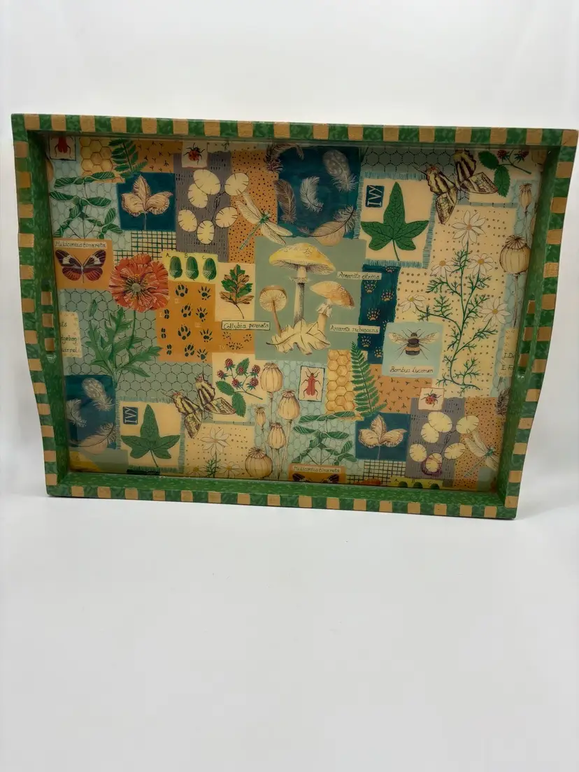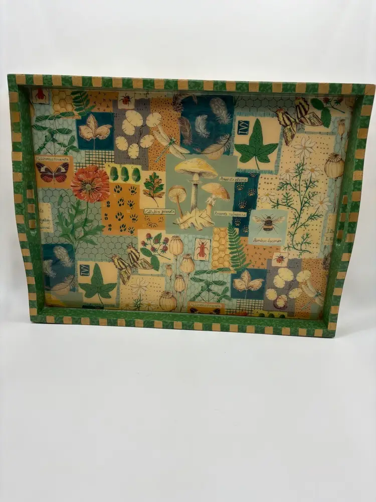 Vintage Botanical Print Decoupage Serving Tray Decor Green