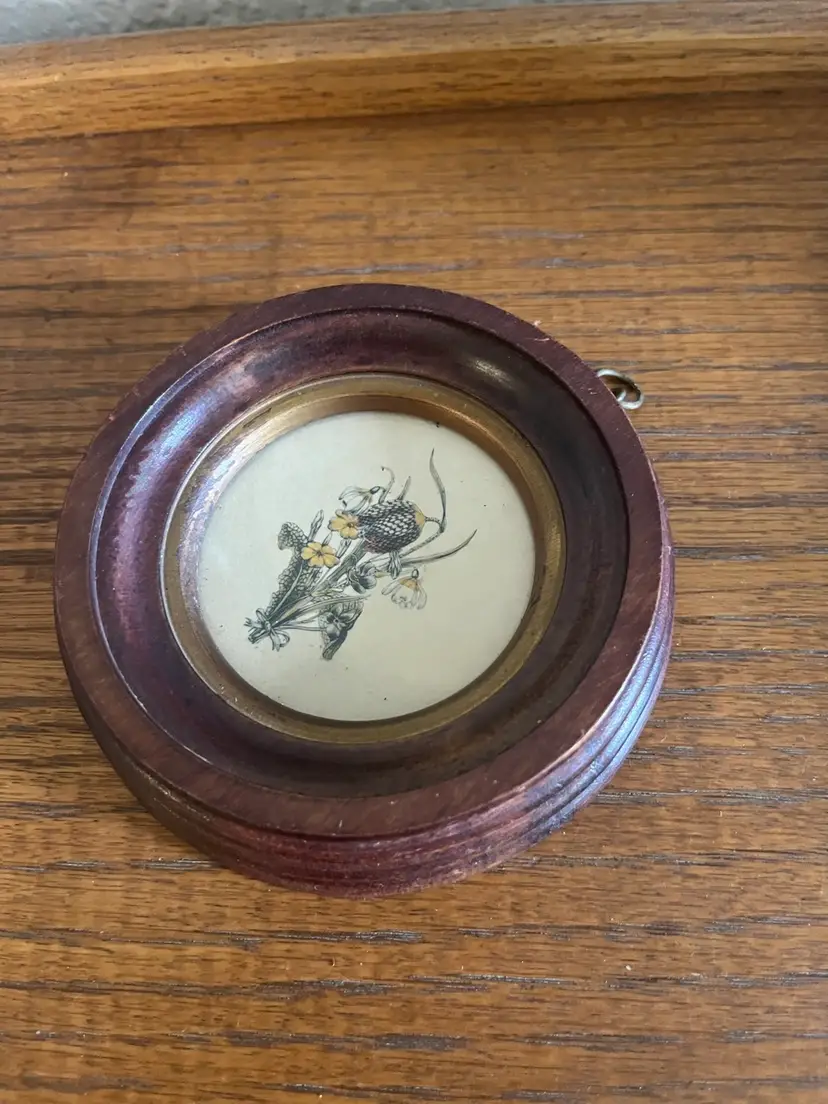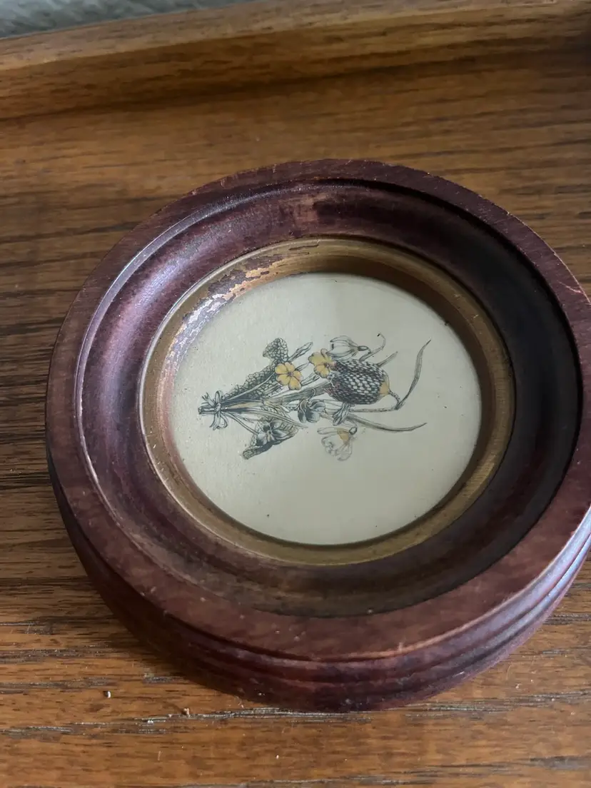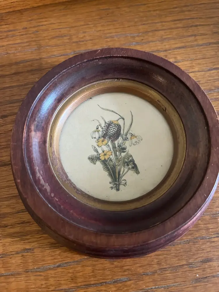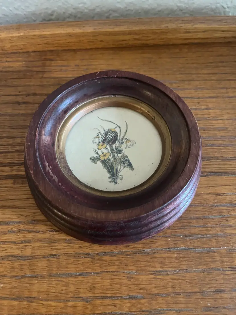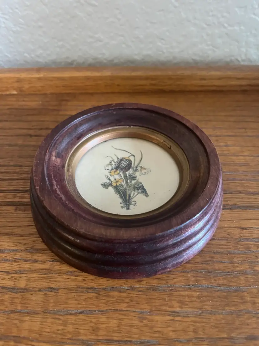 Beautiful small vintage botanical print in wooden frame. Perfect to display on a shelf with a stand or to fill in a space on a gallery wall. 4 3/4”