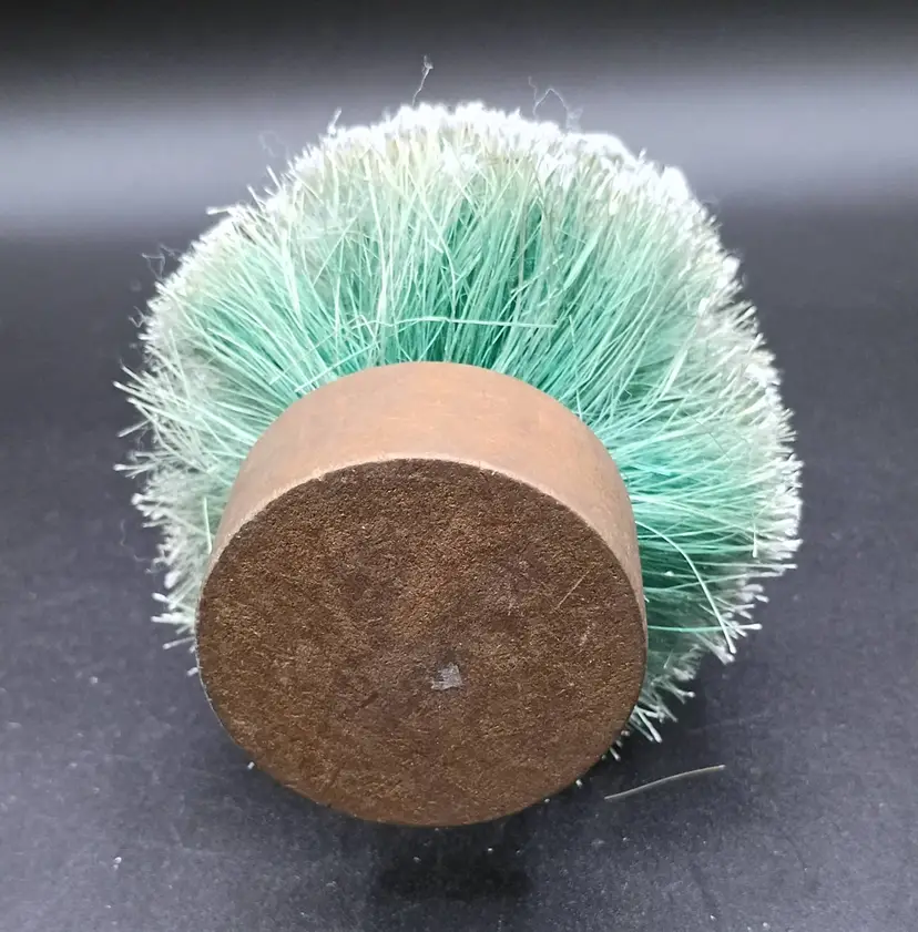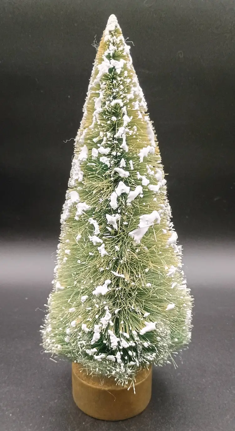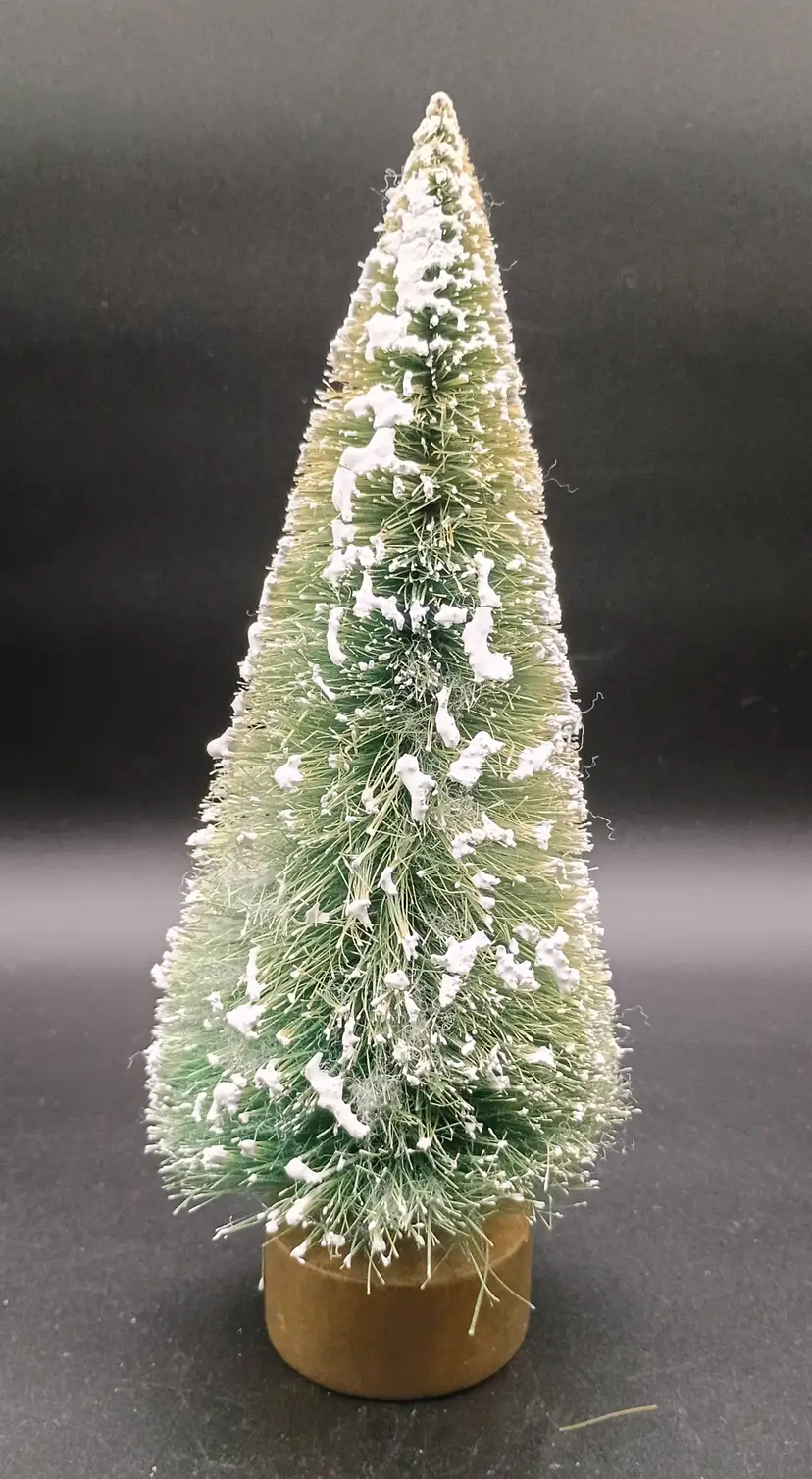 The product is a vintage Bottle Brush Tree with a mica glitter finish in green color, standing at 9 3/4 inches tall. It is an artificial tree perfect for Christmas decor, featuring a red base for added festive touch. This collectible tree is a charming addition to any seasonal display, adding a nostalgic and whimsical feel to the holiday season. Perfect for collectors or anyone looking to add a unique and vintage touch to their Christmas tree.