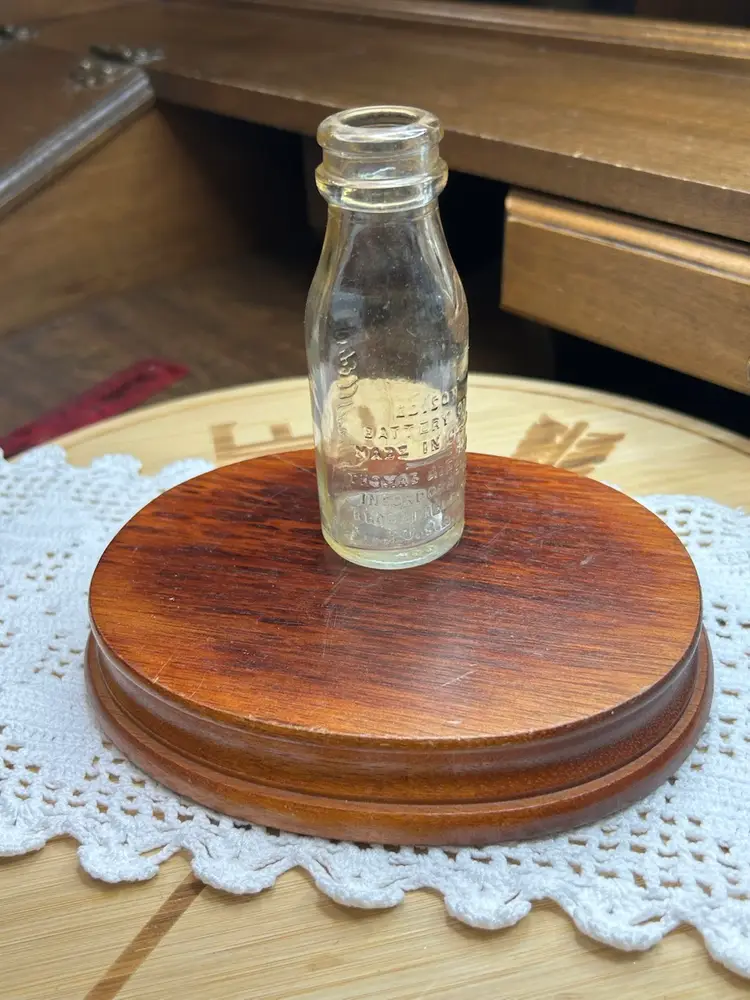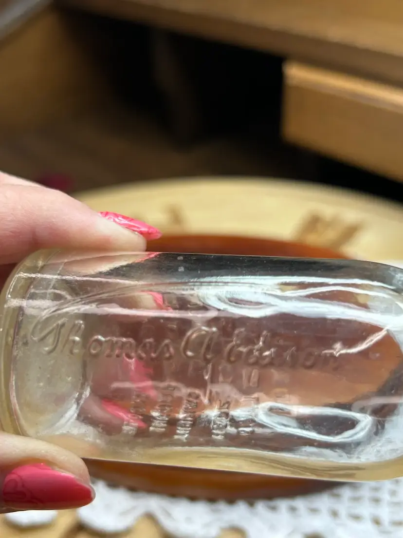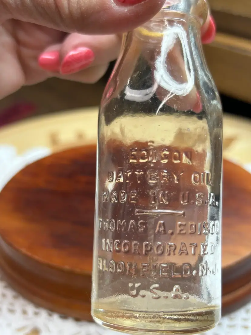 Bottle says, “Edison Battery Oil. Made in USA. Thomas A. Edison Incorporated Bloomfield N. J. U. S. A. “ other side has facsimile of Thomas A. Edison’s signature. 4.25@ tall x 0.75” diameter opening, 1.25” diameter base.