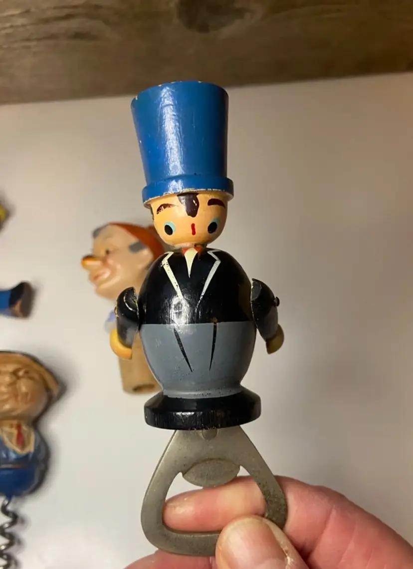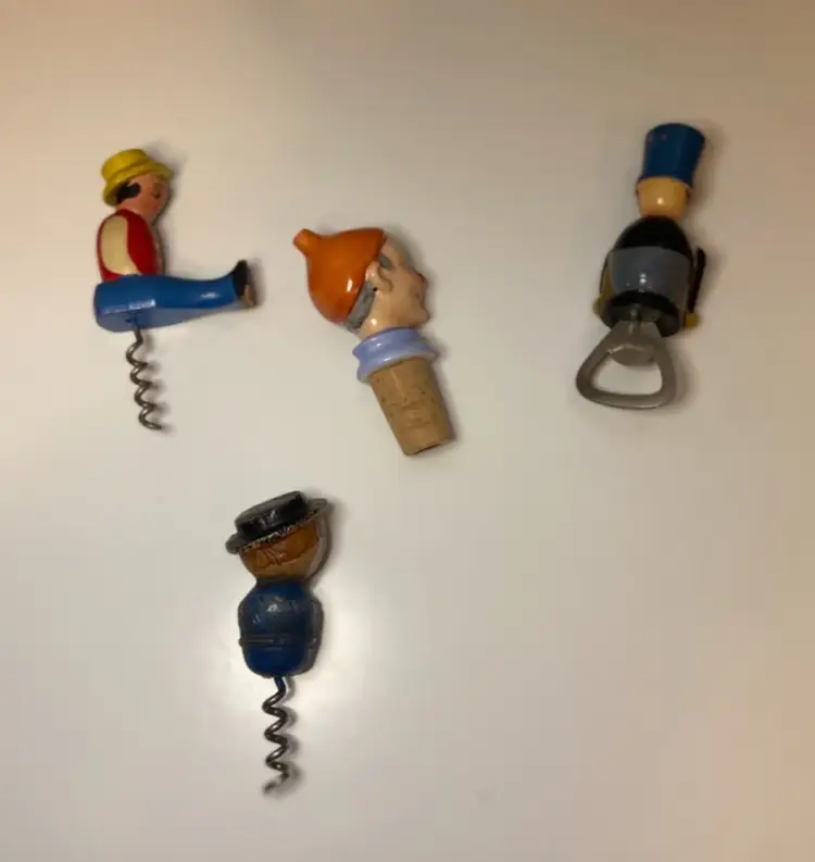This set of 4 barware accessories, one Goebel porcelain bottle stopper, 2 wooden hand carved corkscrews and one wood gentleman bottle opener with moveable arms. All in good used condition. The perfect addition to any bar, kitchen or man cave.