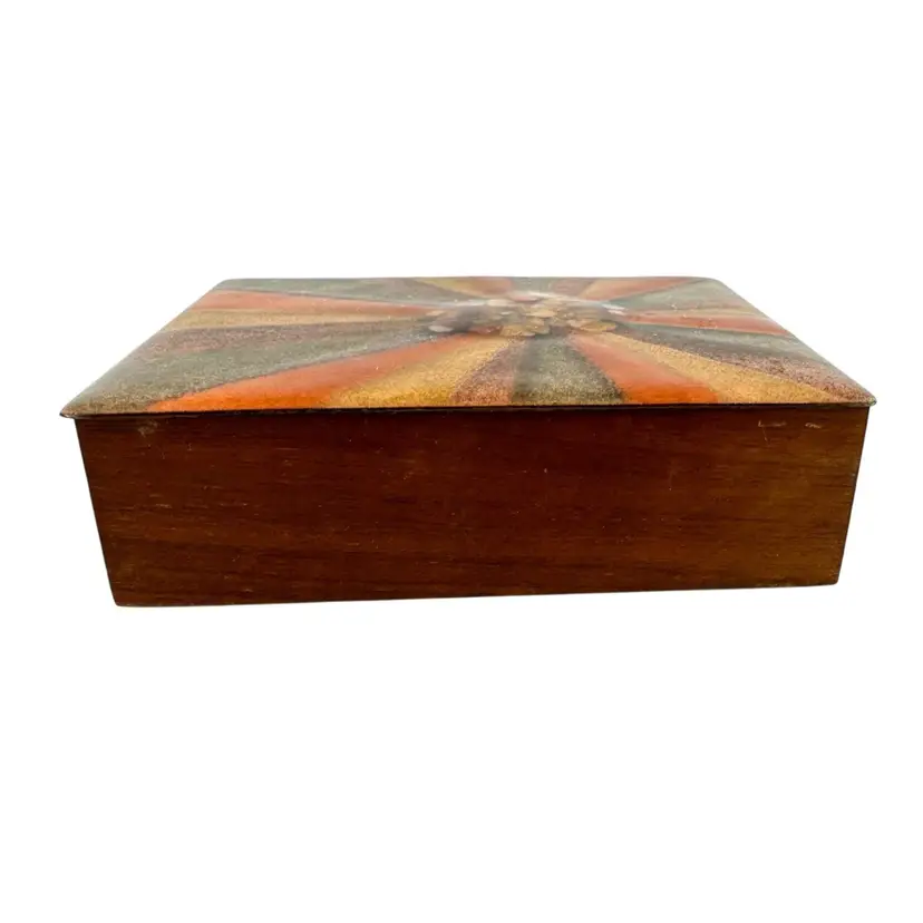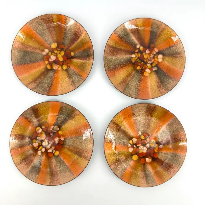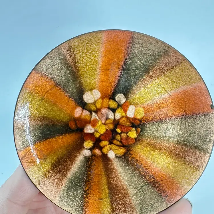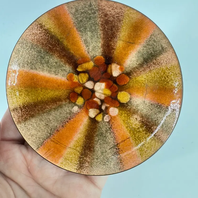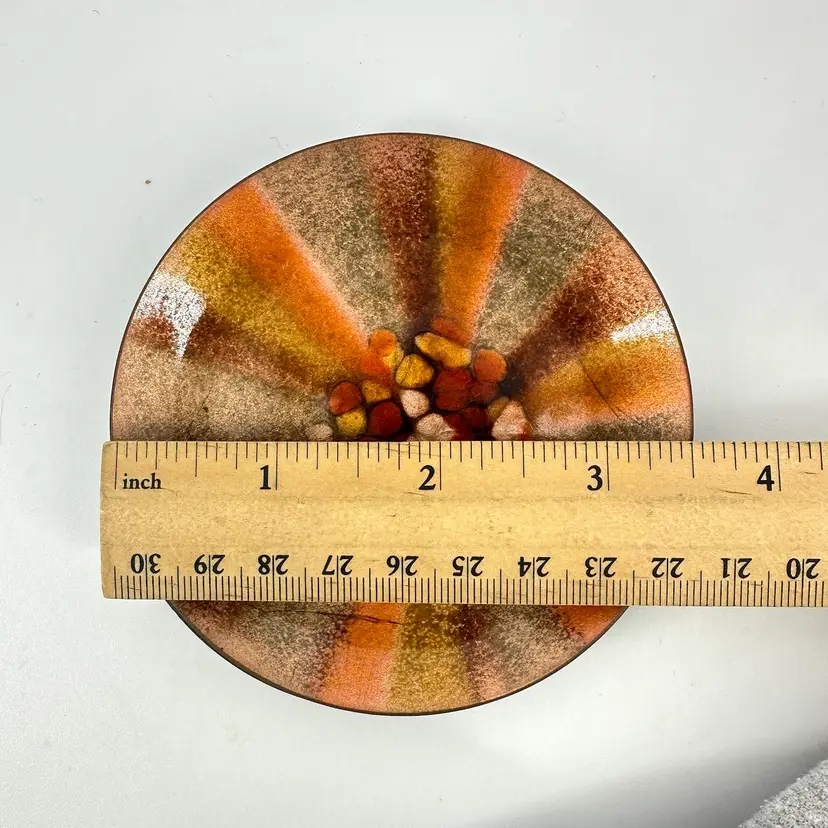 Vintage 5-piece set including 4 small dishes and a wooden lidded box. All featuring a midcentury enamel on copper orange sunburst design. The enamel on all four dishes does have crazing, as shown. Dishes measures approximately 3.5” wide. Box measures approximately 3 3/4” by 4 3/4”. No signatures.