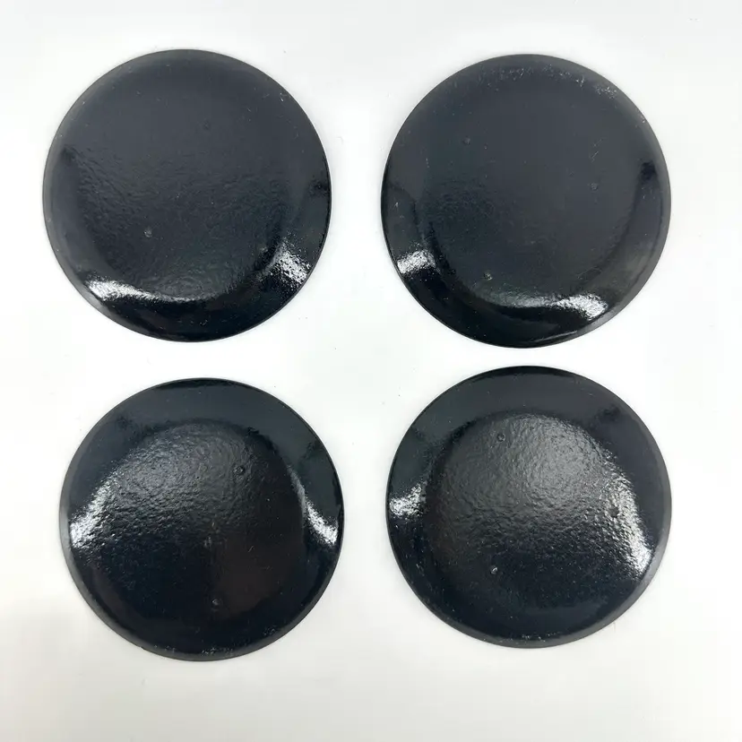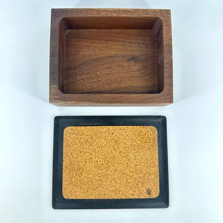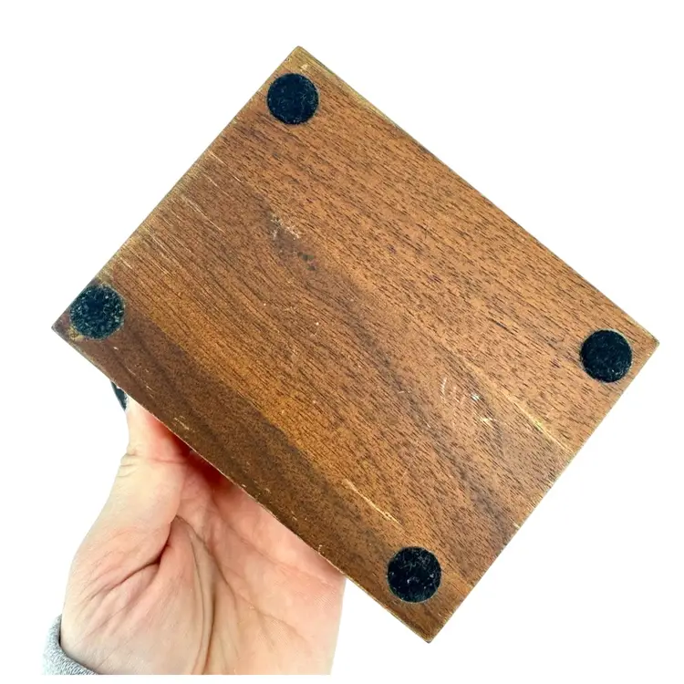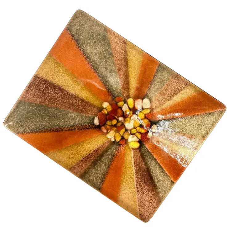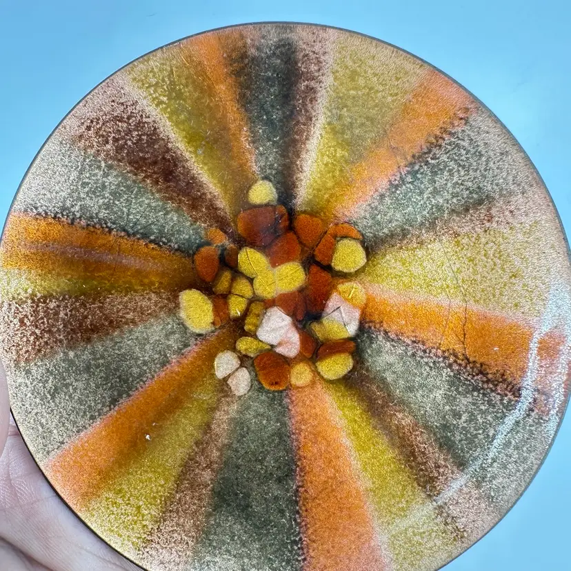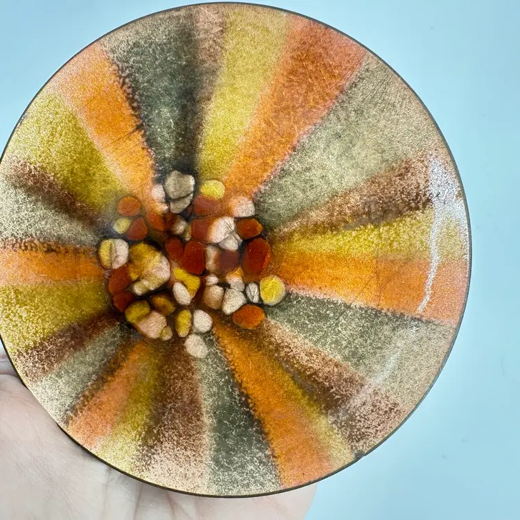 Vintage 5-piece set including 4 small dishes and a wooden lidded box. All featuring a midcentury enamel on copper orange sunburst design. The enamel on all four dishes does have crazing, as shown. Dishes measures approximately 3.5” wide. Box measures approximately 3 3/4” by 4 3/4”. No signatures.