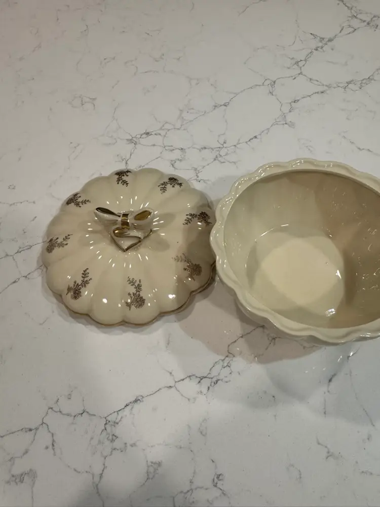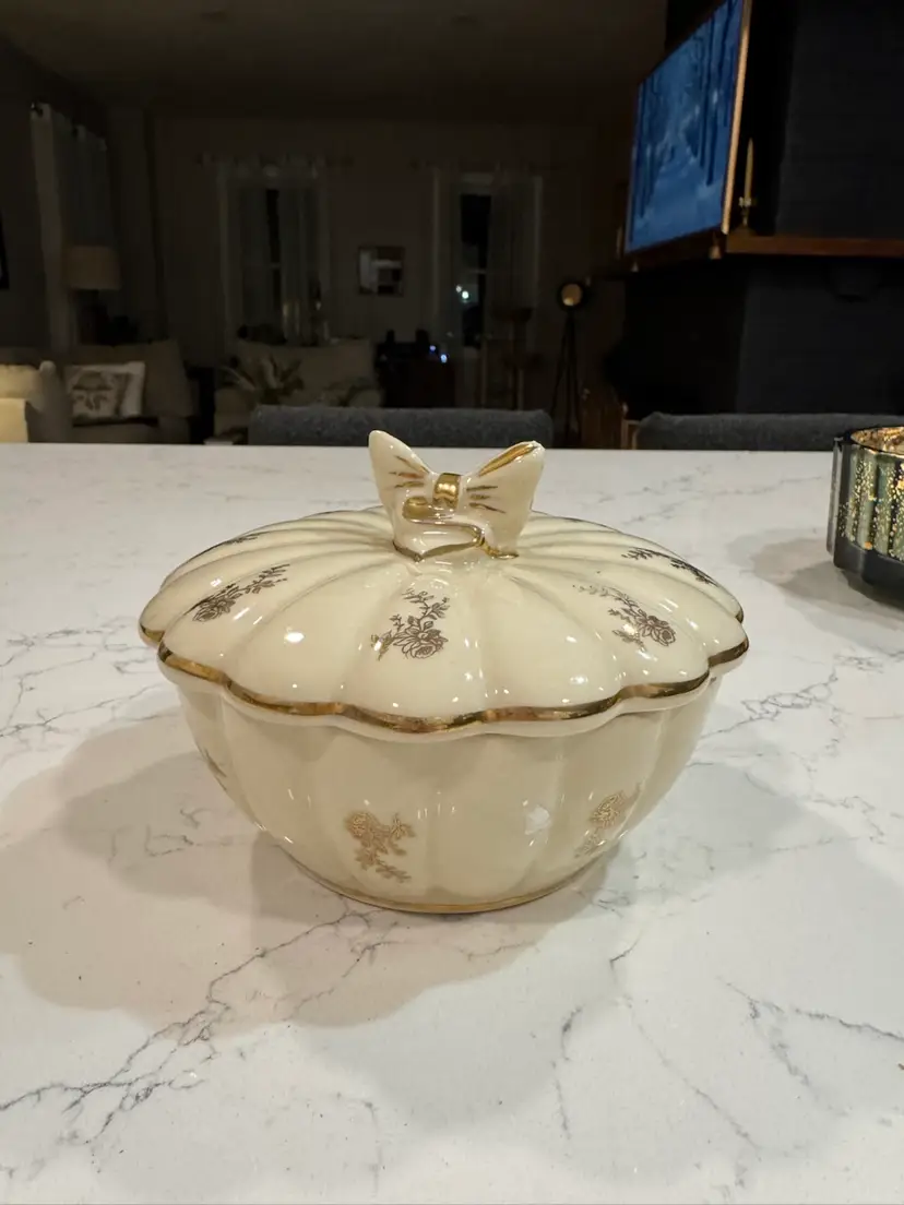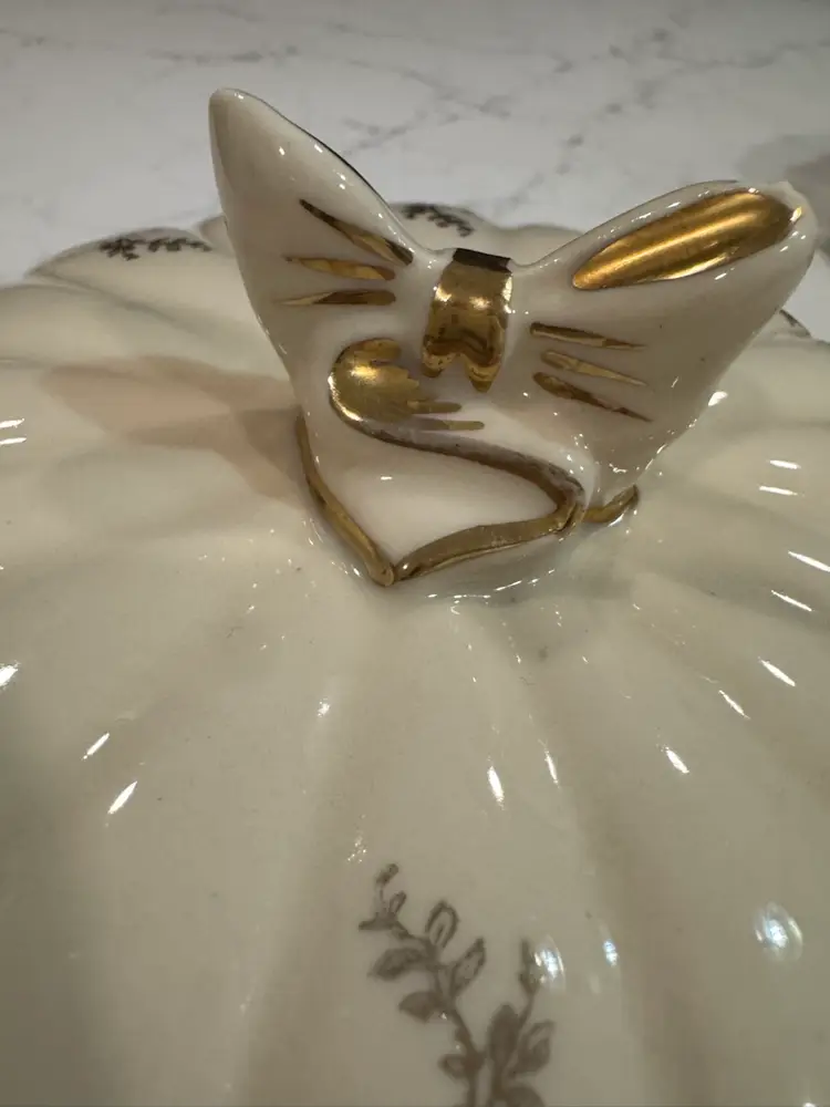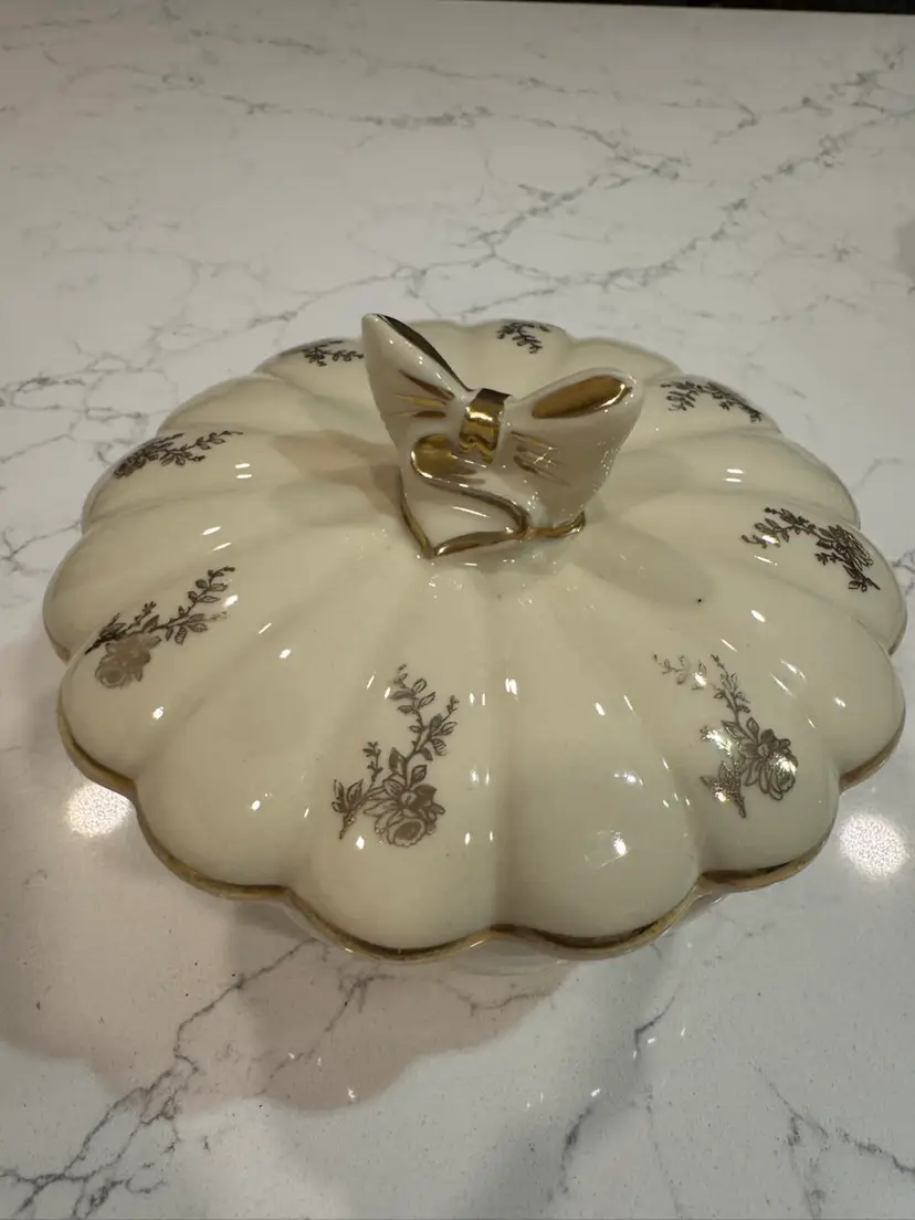 This charming vintage ceramic dish features a lovely floral design and an adorable bow handle. Perfect for adding a touch of elegance to your decor.
