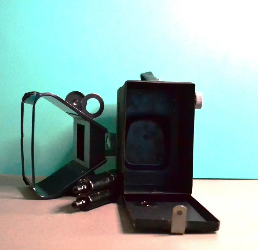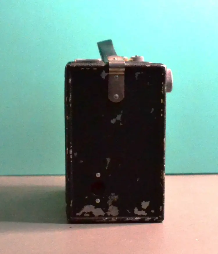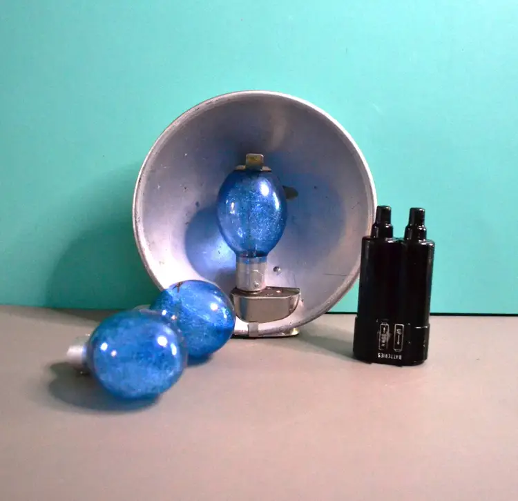 This is from around the 1950s, made by Pho-Tak of Chicago. Simple box camera using 120 roll film. Flash attaches to top of camera. Bulbs are the type would use. There is a piece missing that would securely fasten it. May still work, I have not tested.
