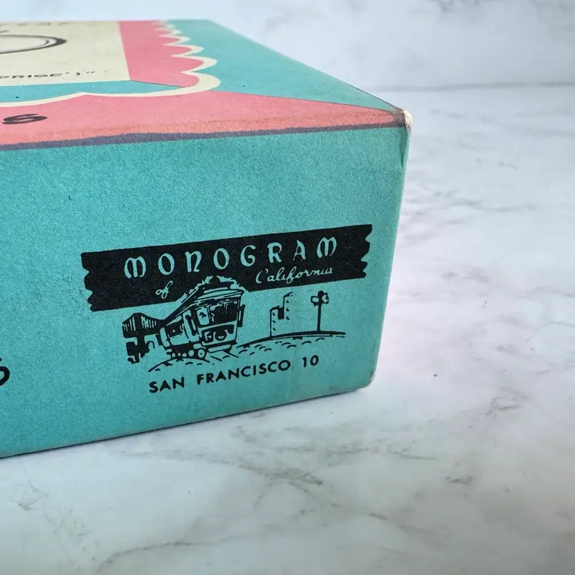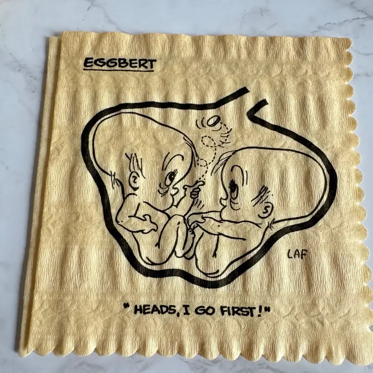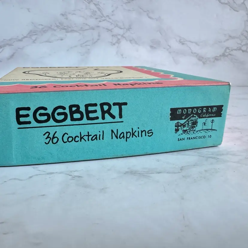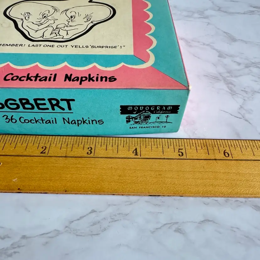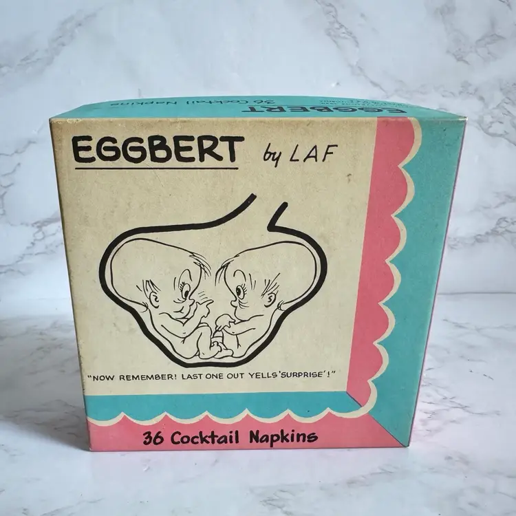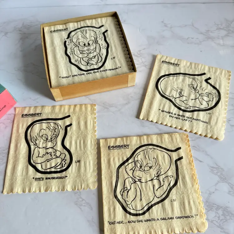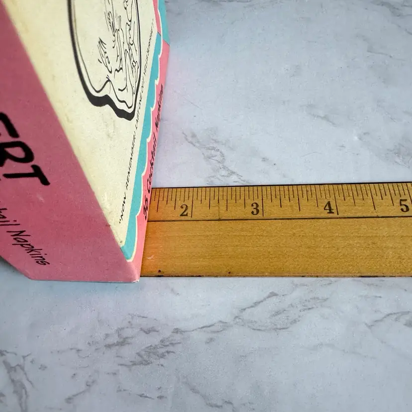 Fair condition with yellowing and wear to the box, yellowing and wrinkling to the napkins. Overall box size measures about 5”square x 1-3/8”
