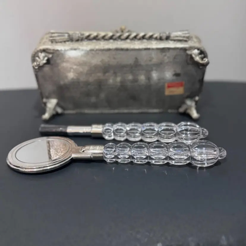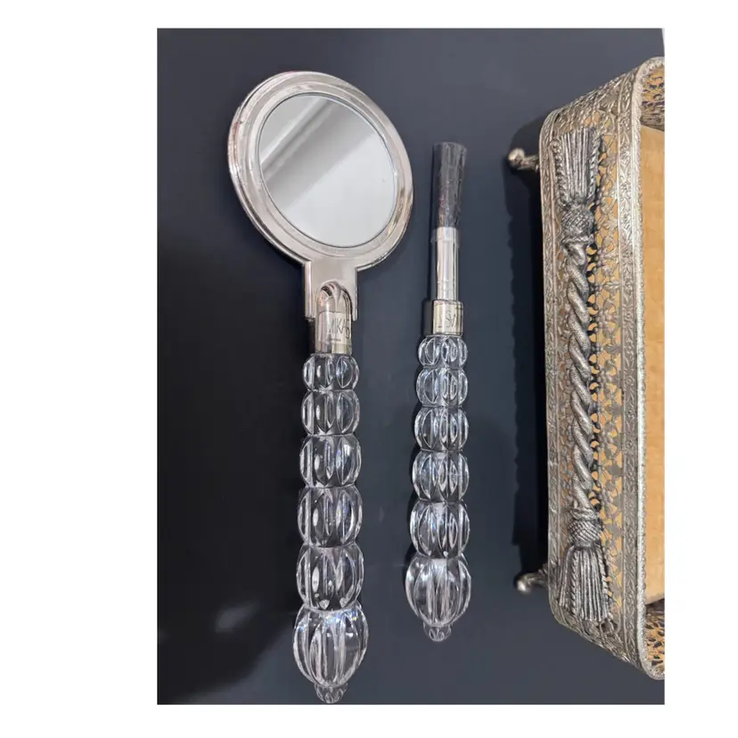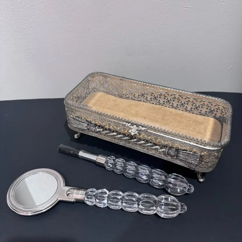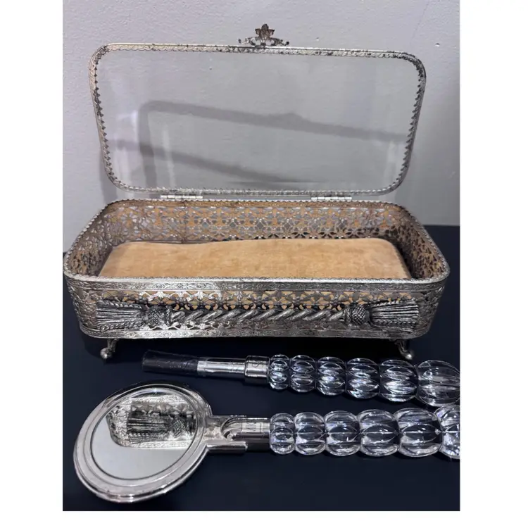 Not a set but goes beautifully together! Vintage ornate silver plate, jewelry box with glass lid and gold colored velvet interior. Measures 9 inches long 4 inches wide and 3 1/2 inches tall.. Also included is a Mikasa crystal hand mirror and makeup brush set.