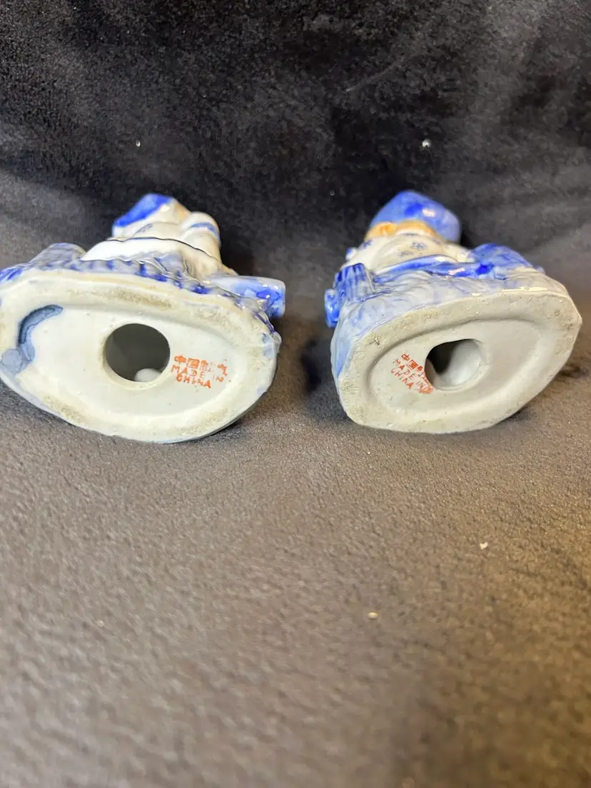 This vintage figurine set features a boy and girl playing a musical instrument and holding a songbook. The glossy finish adds a classic touch to the collectible piece