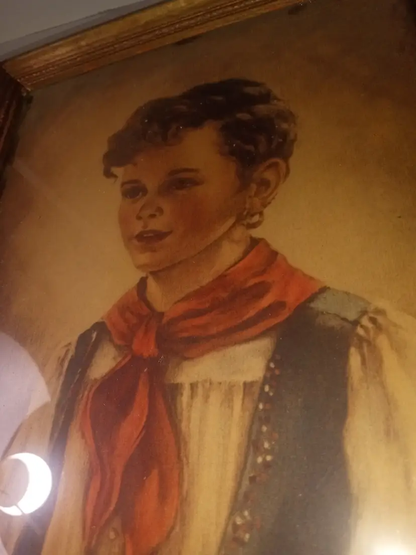 Charming vintage print of a young boy with a red scarf, perfect for adding a nostalgic touch to your decor. approx 8x10 framed