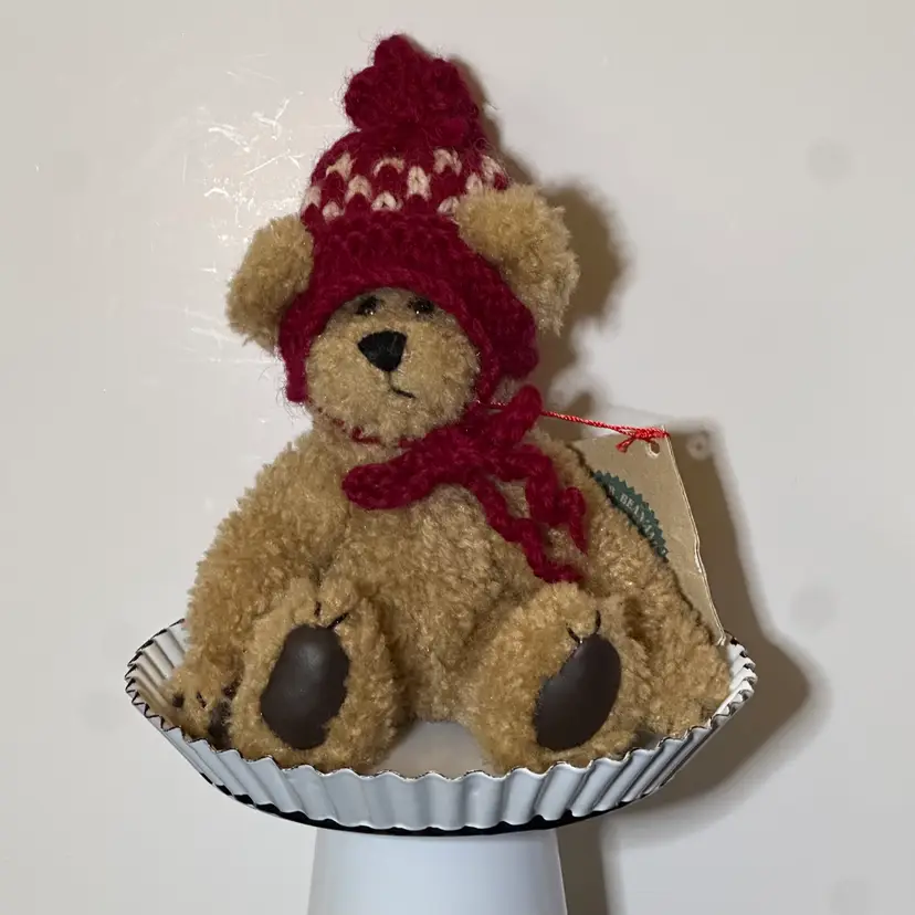 This item is a vintage Boyds Bears collectible plush, specifically the "Fitzgerald O'Bruin" bear from The Archive Collection. Fitzgerald O'Bruin (Item #91802). Small 6-inch, fully jointed teddy bear wearing a knitted red and cream winter hat and matching scarf. Typically found in good collectible condition with original tags.