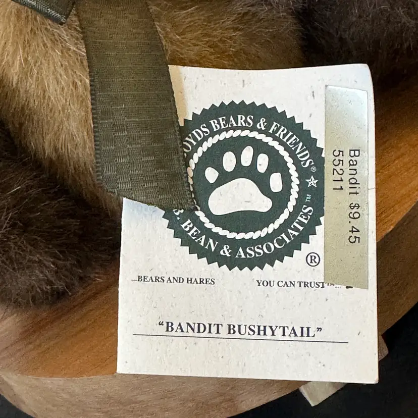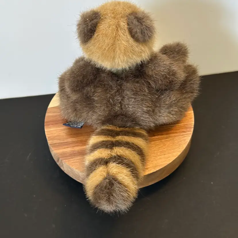 This is a Boyds Bears & Friends "Bandit Bushytail" Raccoon. It is a plush, beanbag-style toy measuring approximately 6 inches in height. The raccoon features jointed limbs and is adorned with a green ribbon bow.