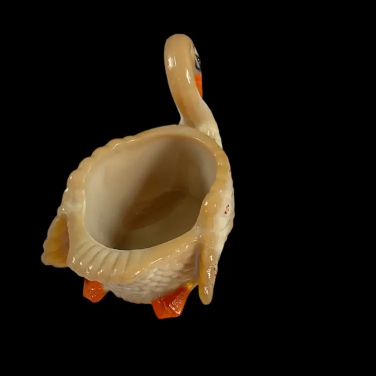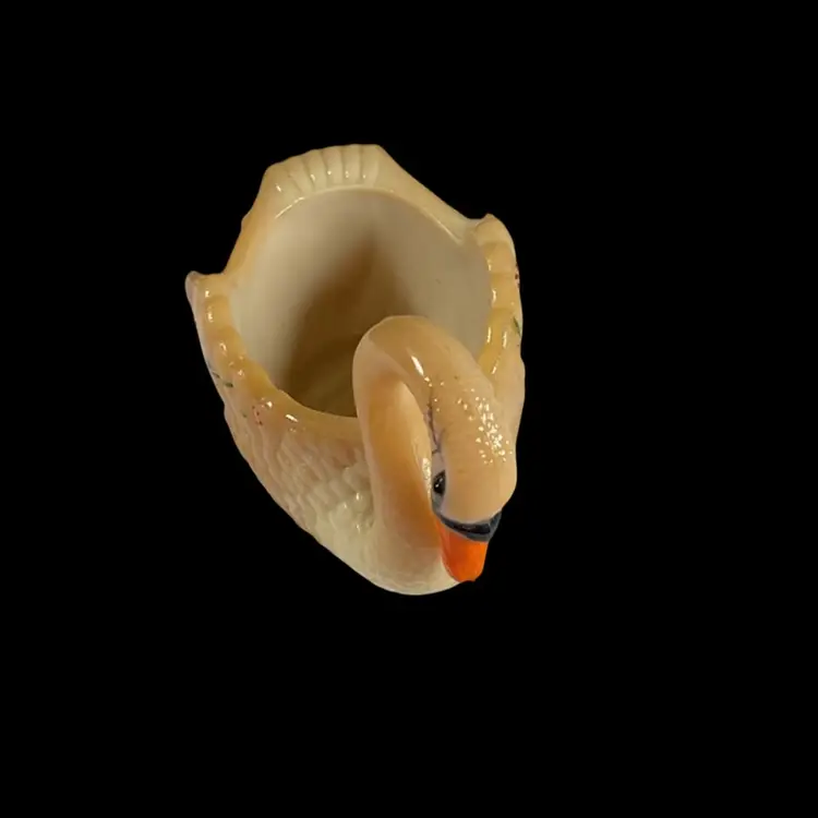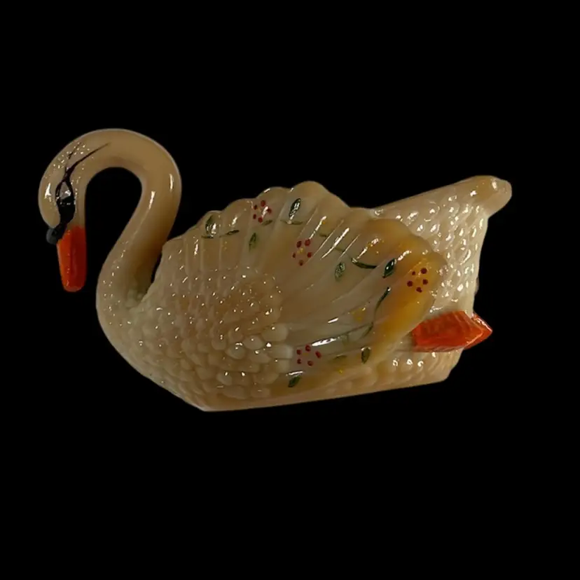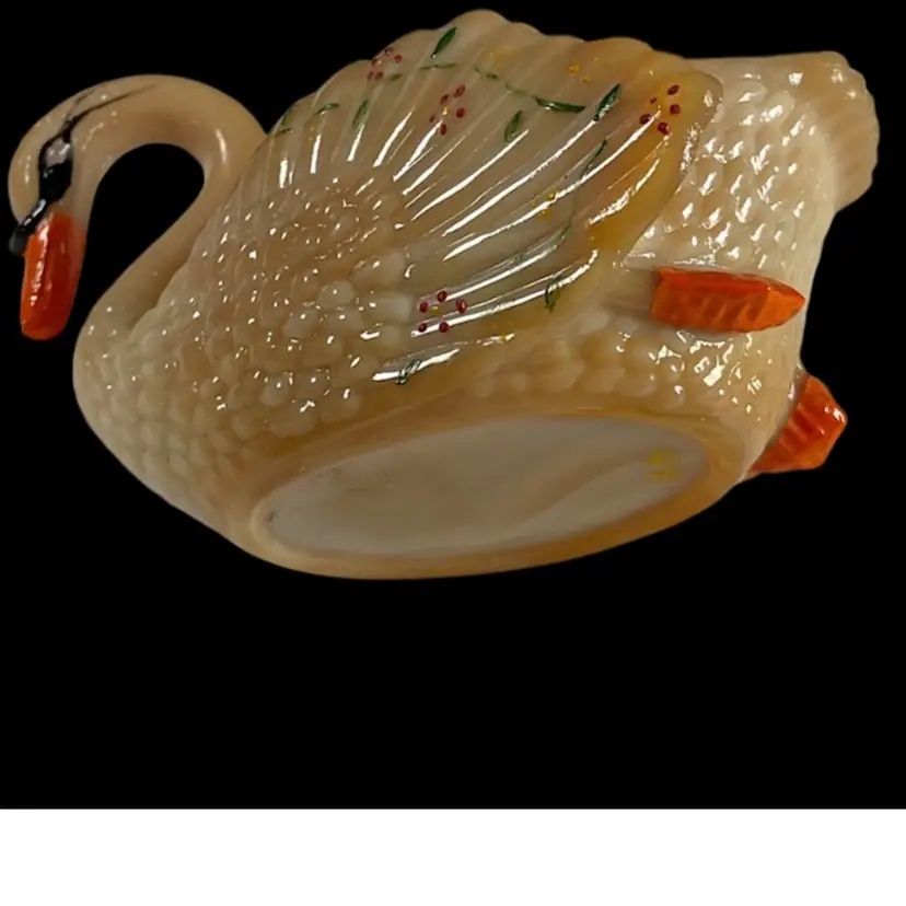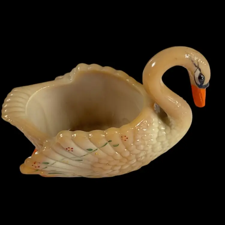 Vintage Boyd’s handpainted Carmel colored slag glass swan salt cellar. It is marked on bottom with a B in triangle and initialed by artist. No chips or cracks. Approximately 3.5” L x 2” W x 2” H.