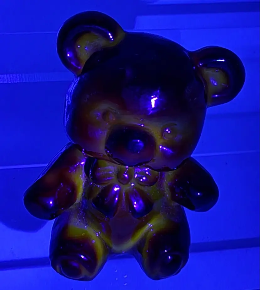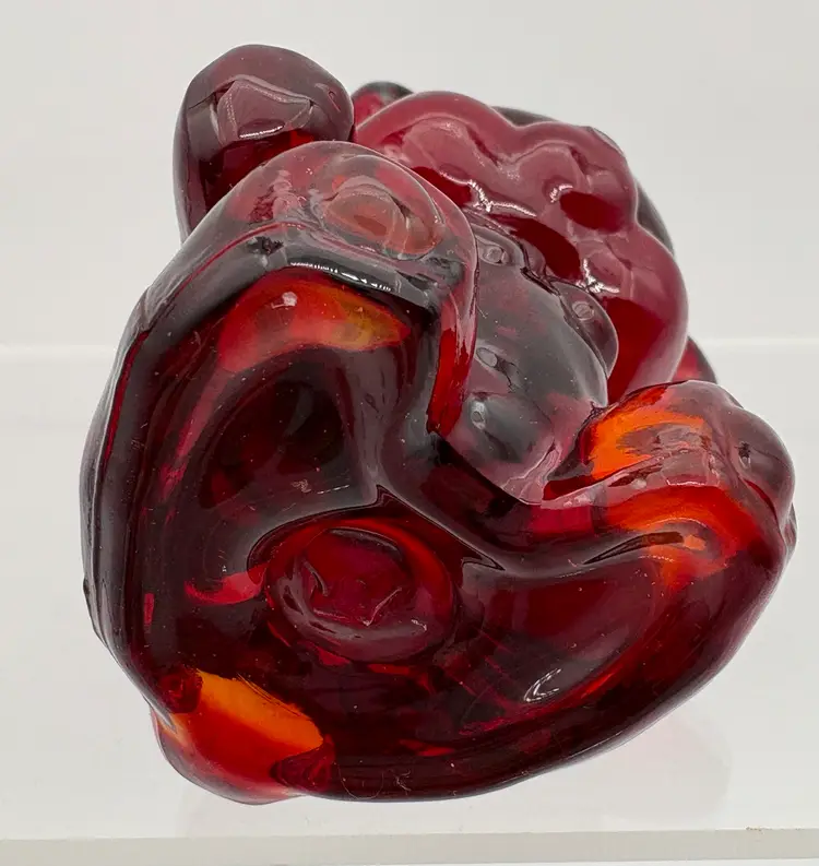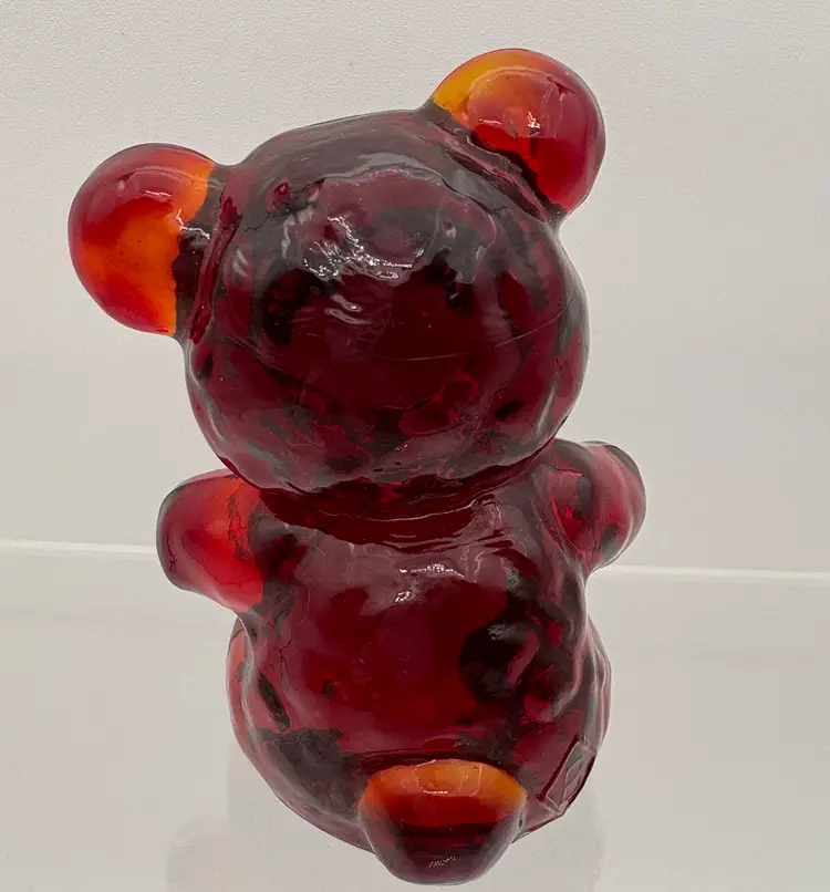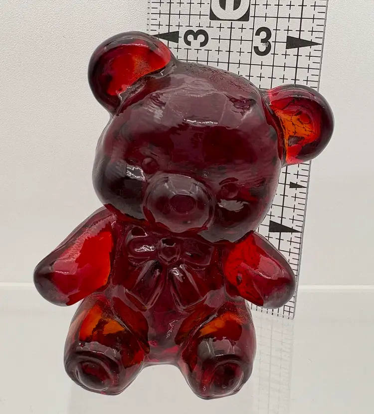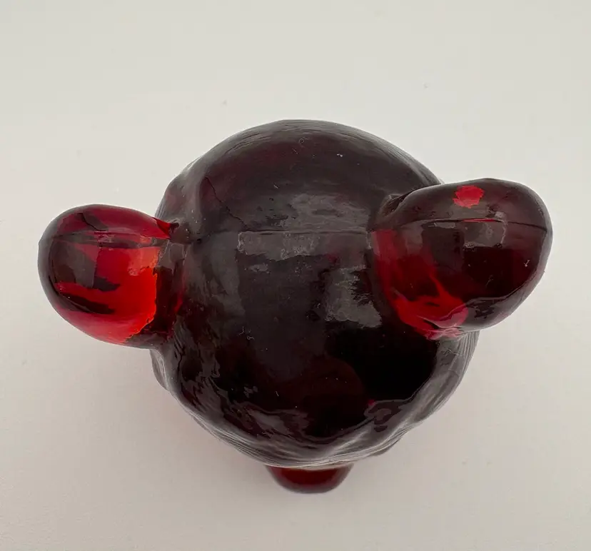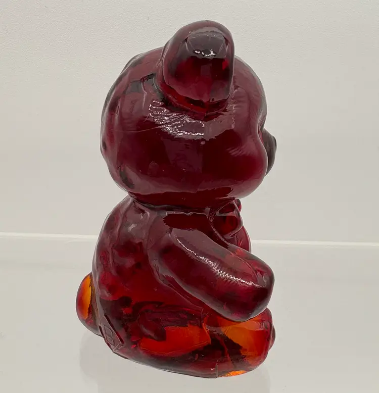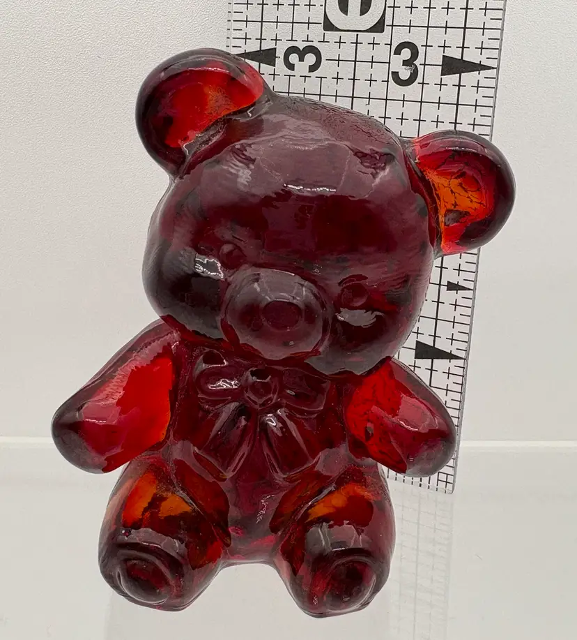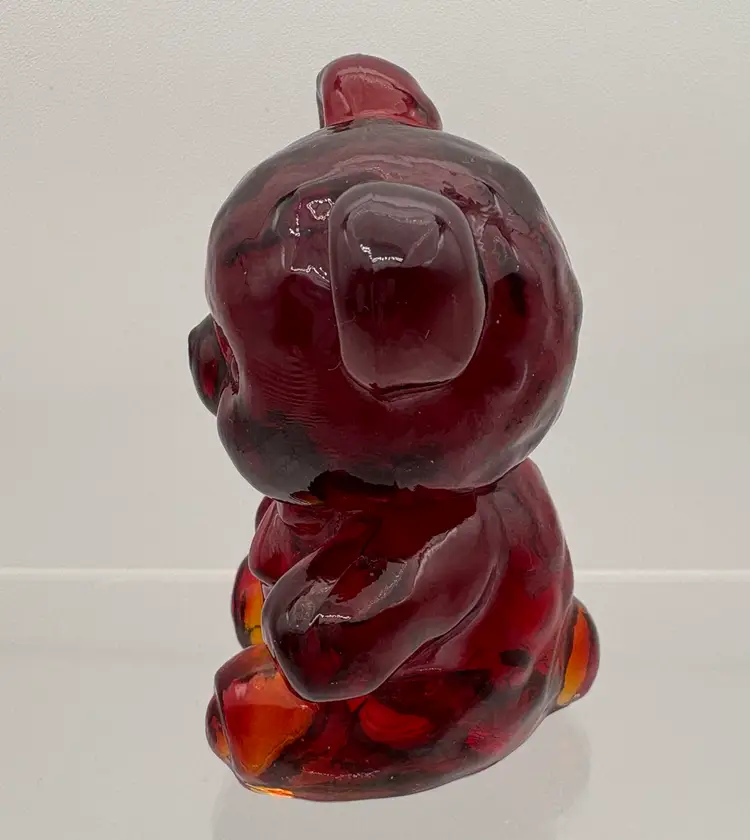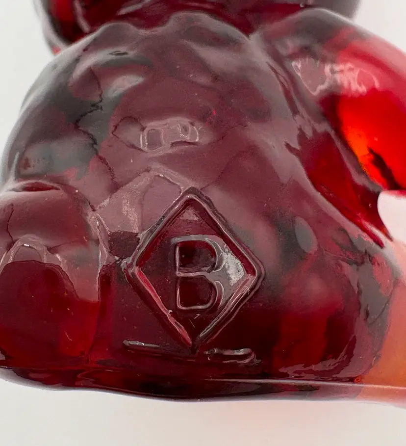 3”H x 2 1/4”W Nice condition, no chips or cracks. Marked on the rump with Boyd’s second mark (1983-88). This color was created in the first year of the bear series named Fuzzy. The ruby color Fuzzy is dated 4-27-87. Cadmium glow with UV light, please see images.