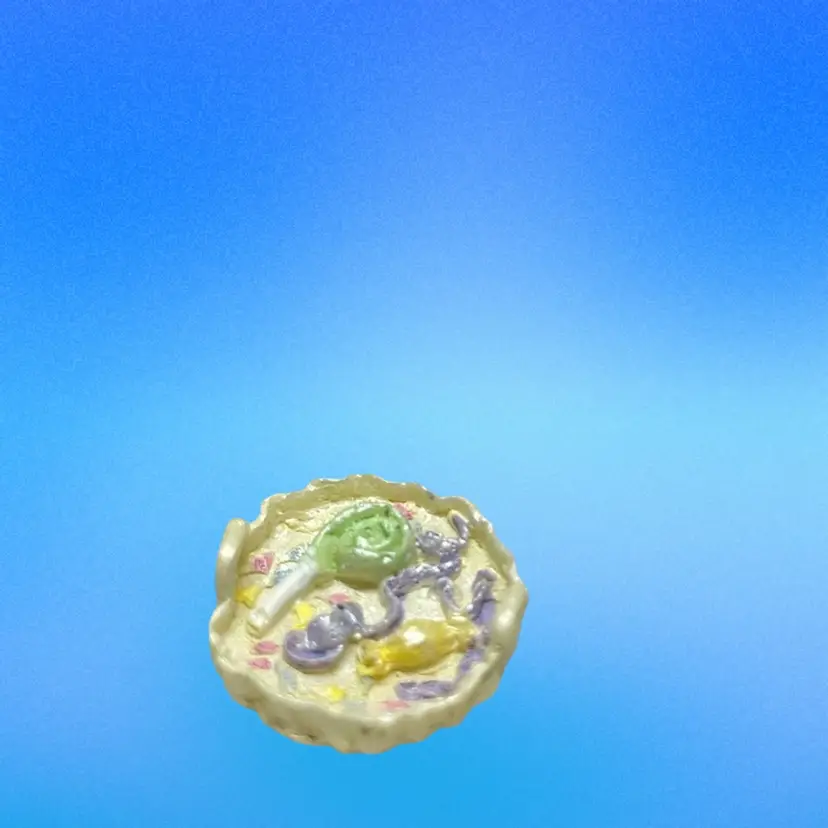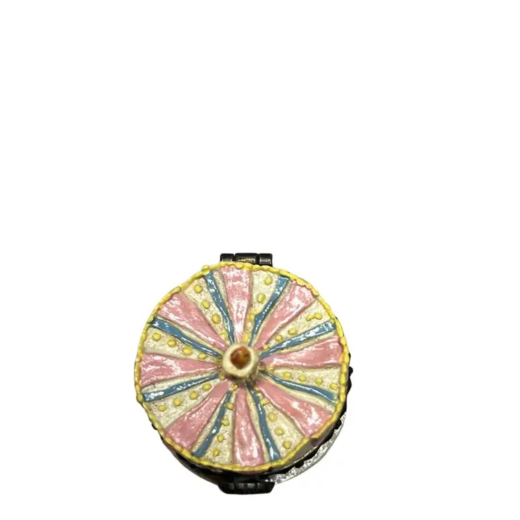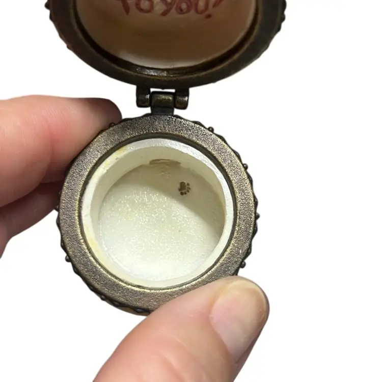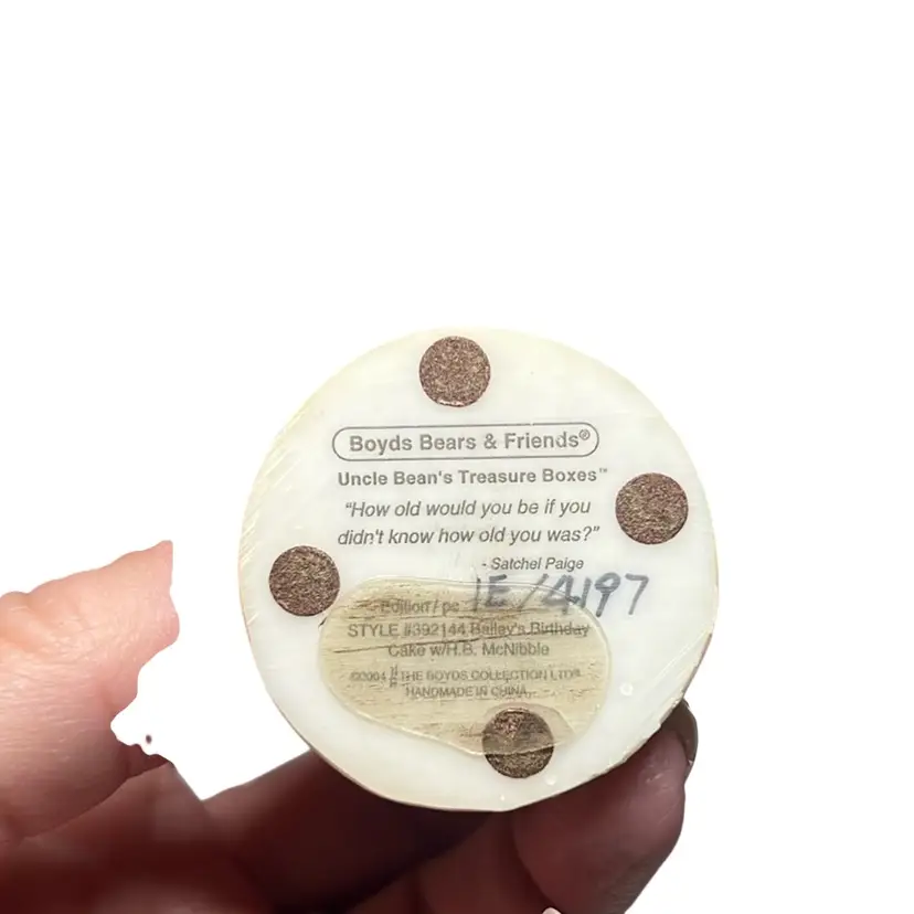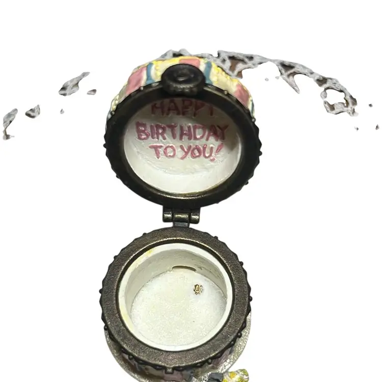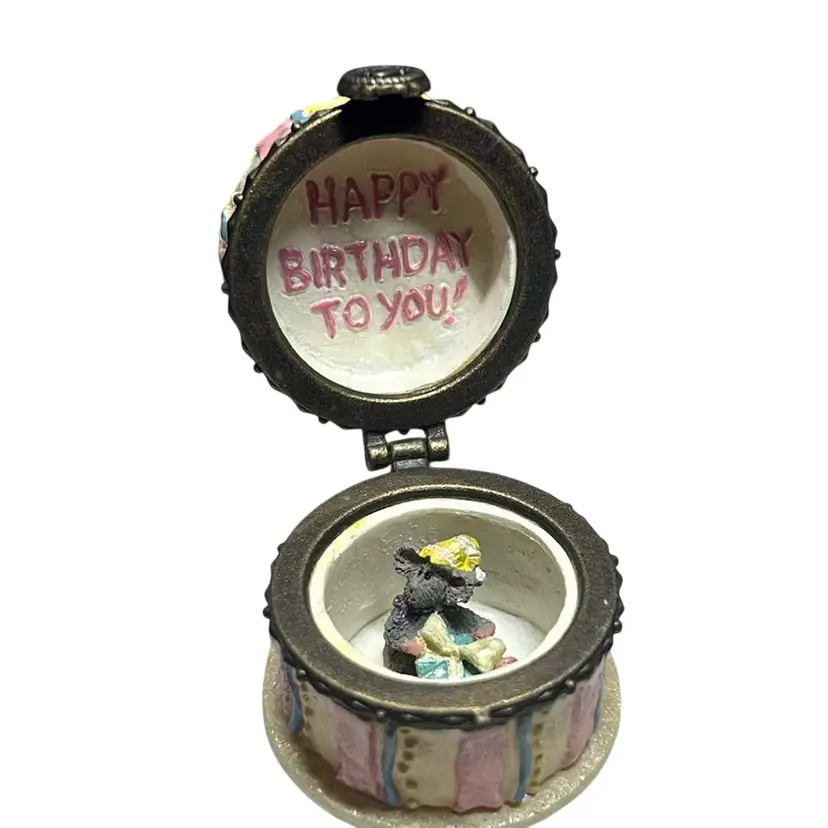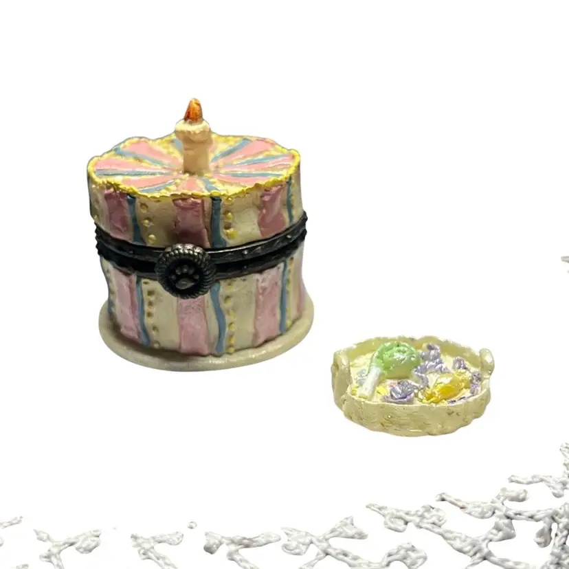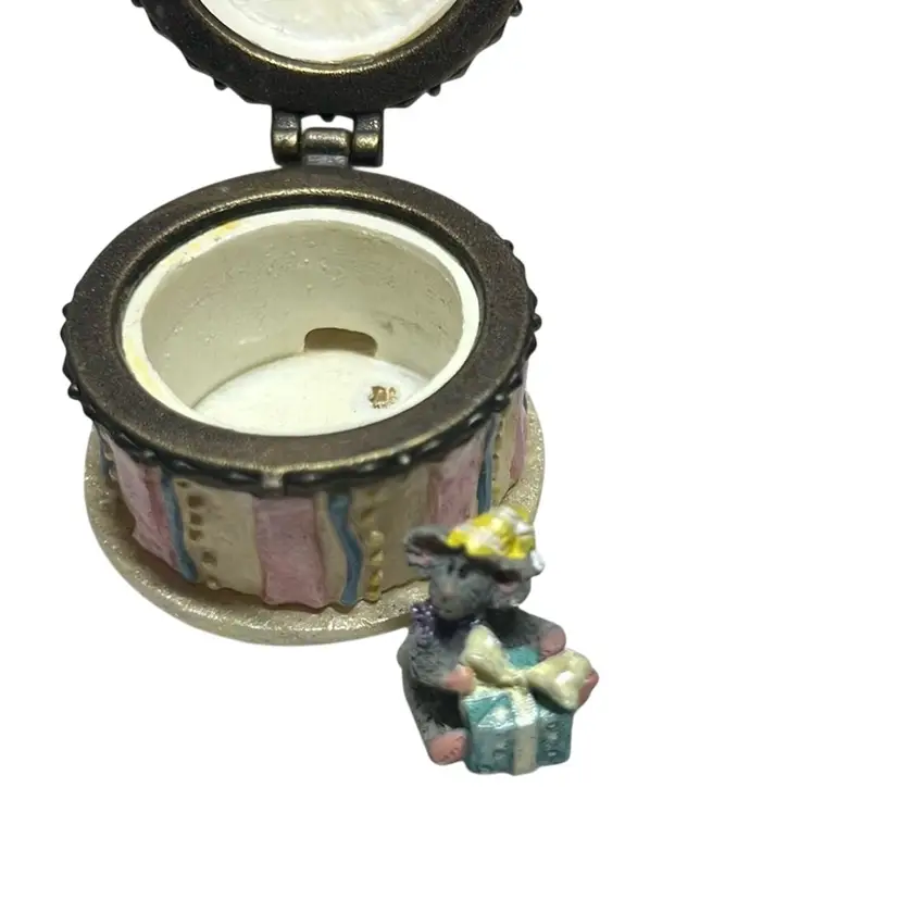 Cold cast resin trinket box in the shape of a birthday cake with a candle on top. Inside is the trinket H.B. McNibble (mouse) This is a first addition and was called “Halley’s birthday cake”. Included is an extra piece I found inside made of resin and has streamer and candy on a tray. This is an adorable set and extremely collectible. Measures 1.5” tall & 1.5” wide