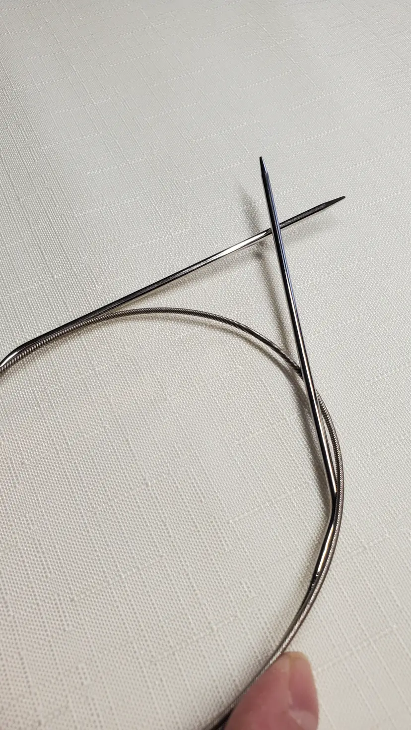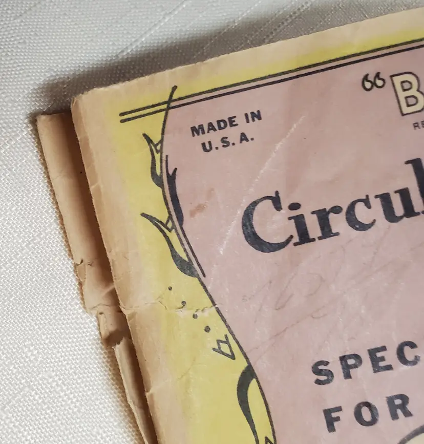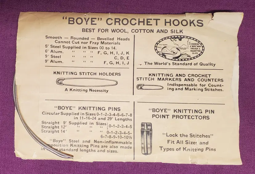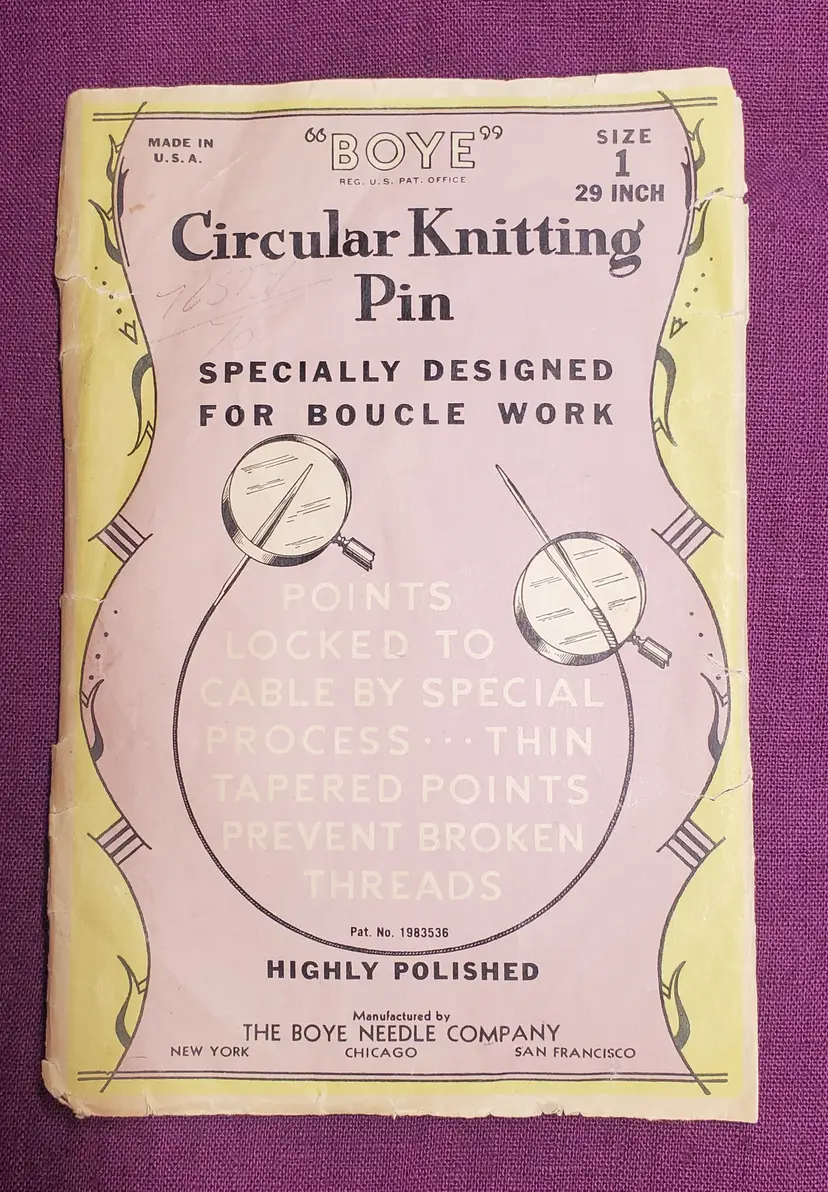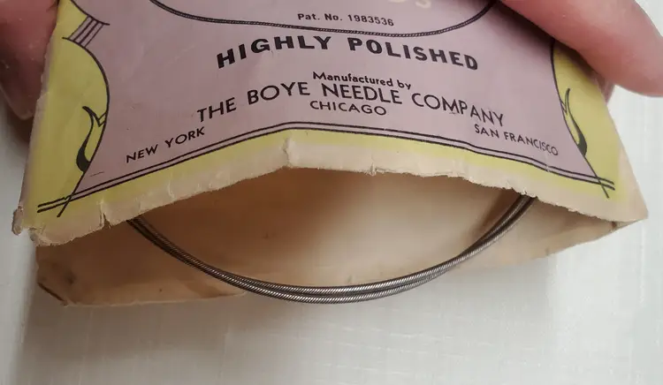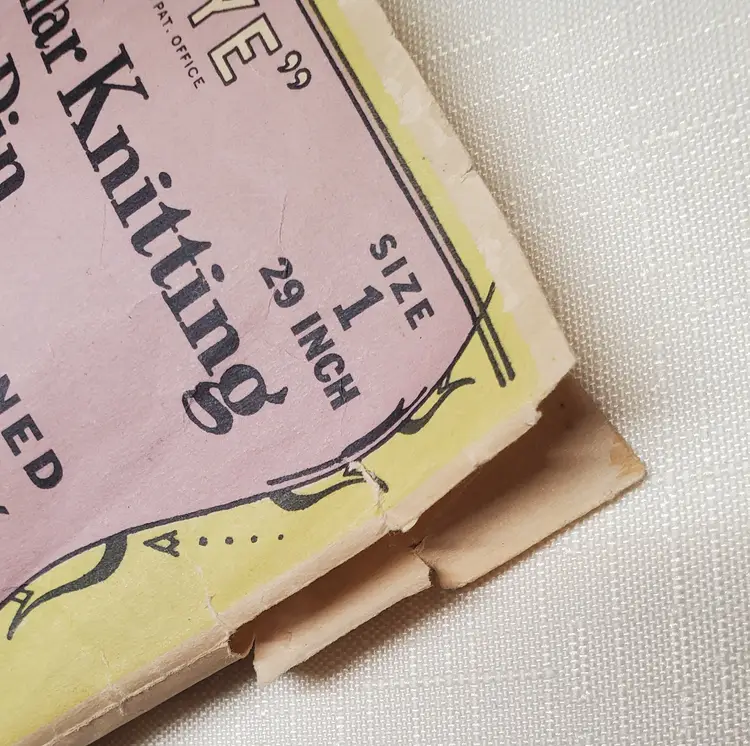 This little gem is from around the 1930's and the needles themselves look nearly new. The paper sleeve is damaged (see photos). Teensy bit of tarnish on the connection between the tips and the loop. It's a fun piece and waiting for a new home.