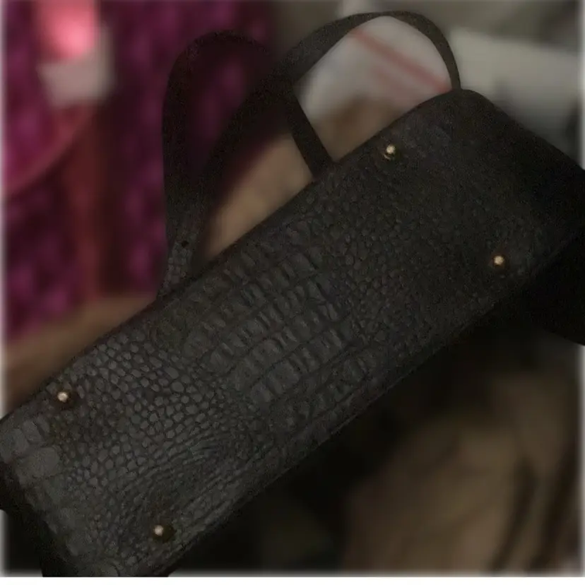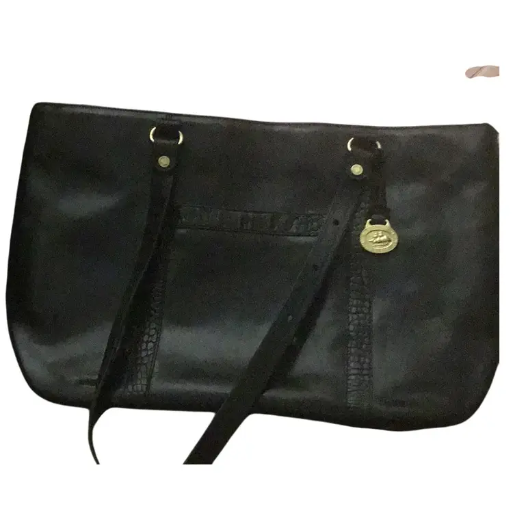 Vintage black Brahmin tote. The cayman we are used to seeing on Brahmin bags can be seen along the bottom and straps. Gorgeous tan suede inside.