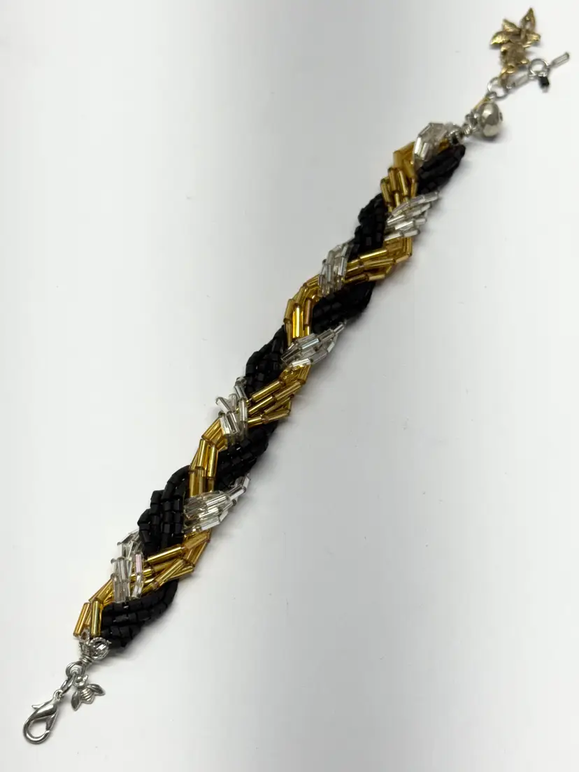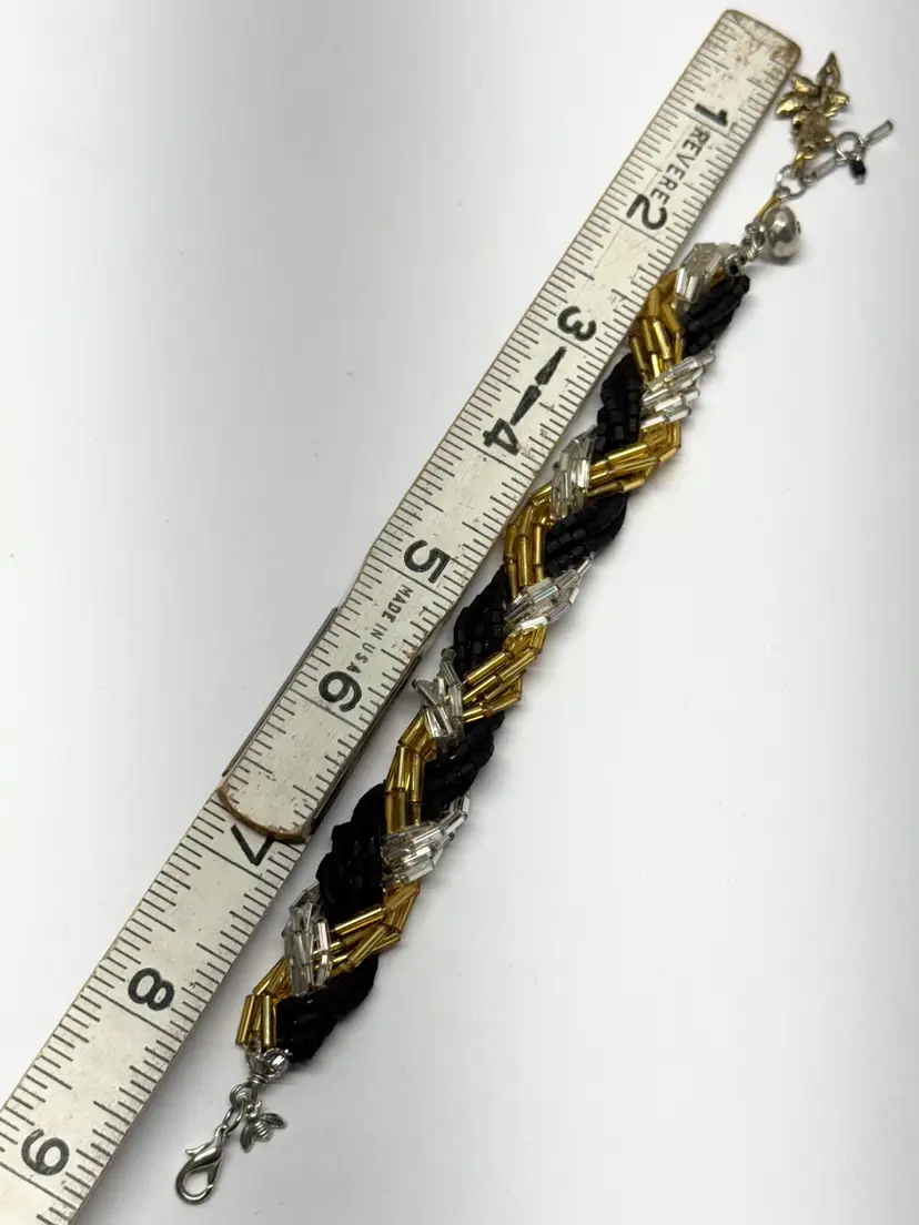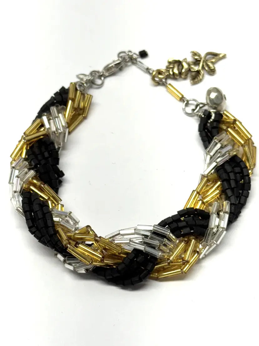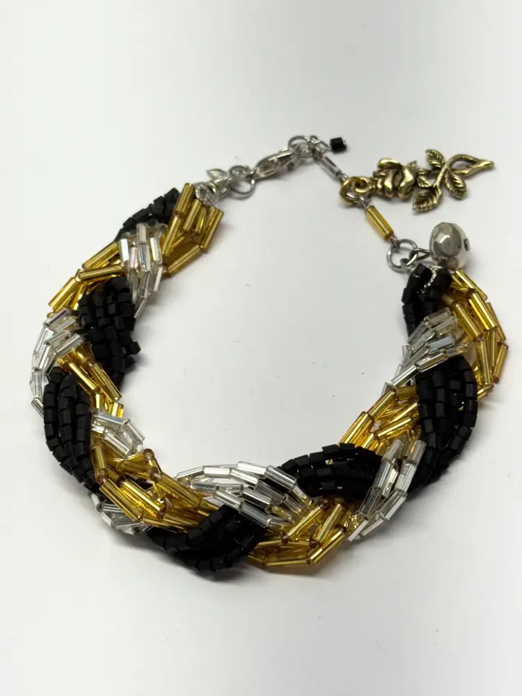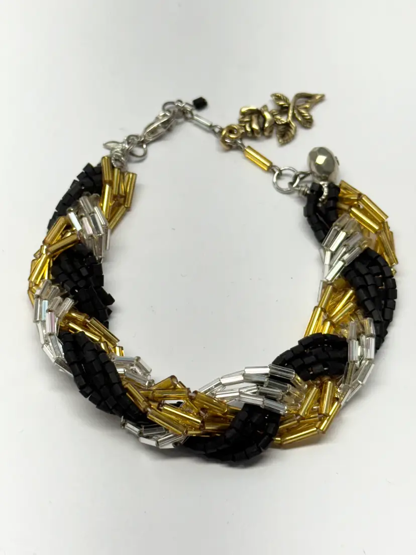 Vintage braided glass sequin charm bracelet. Flower rose charm. Black silver and gold sequin beads, braided bead bracelet. Extension chain at end for adjustable wear. MN54GH.