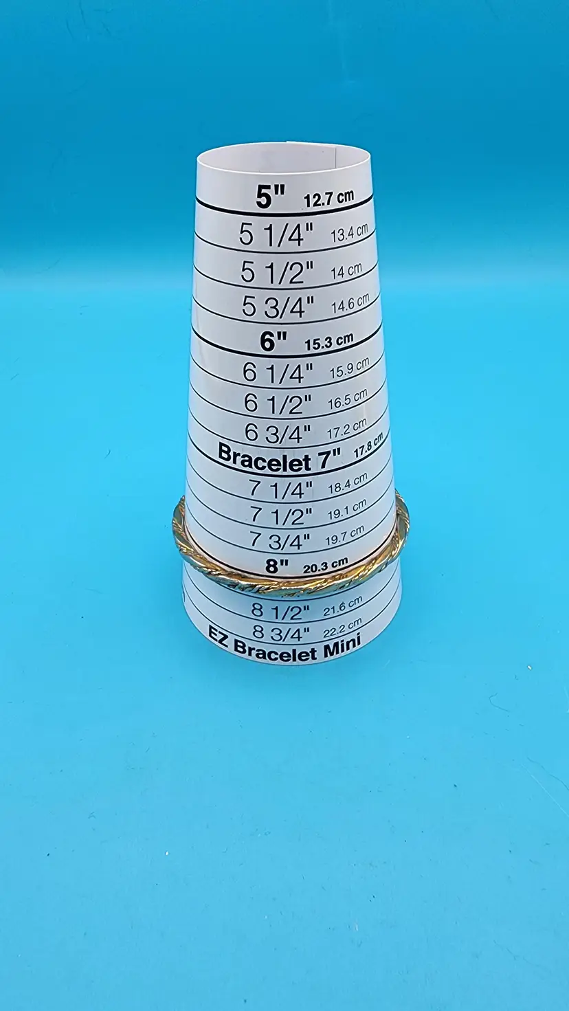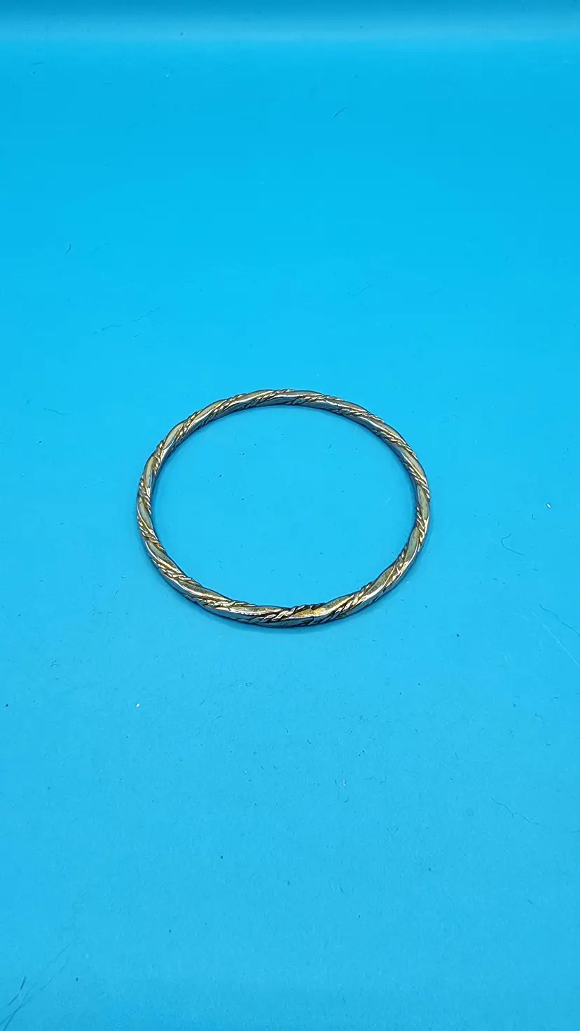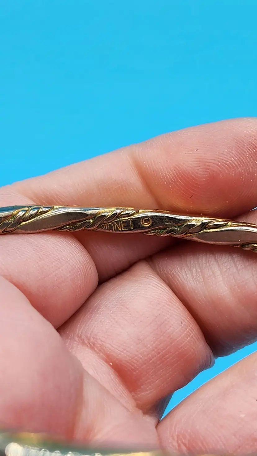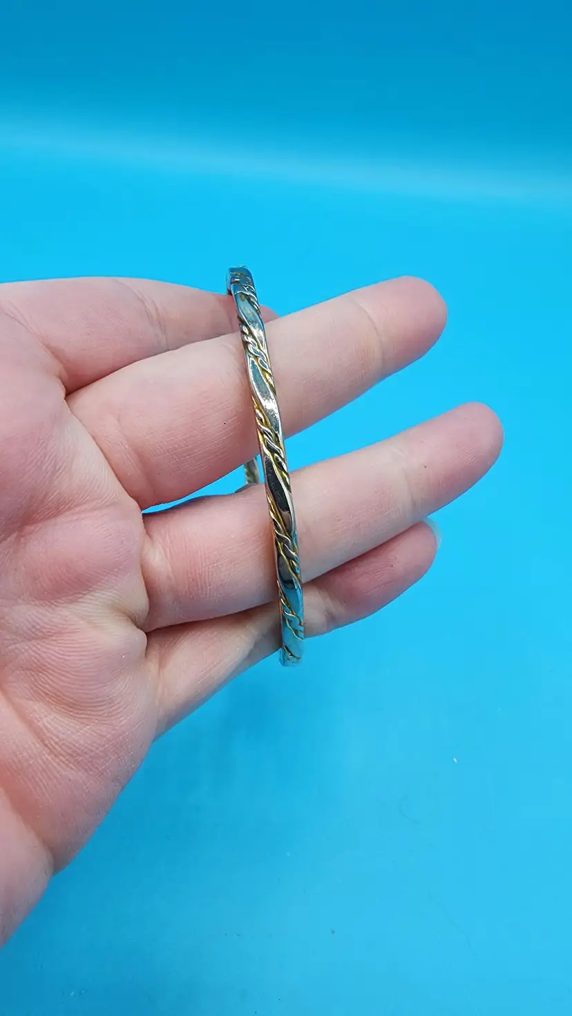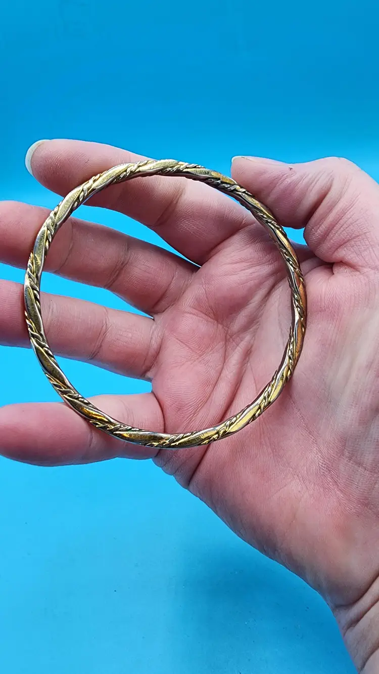 This gold tone bracelet has some wear mostly on the inside. Measurements in photos.
