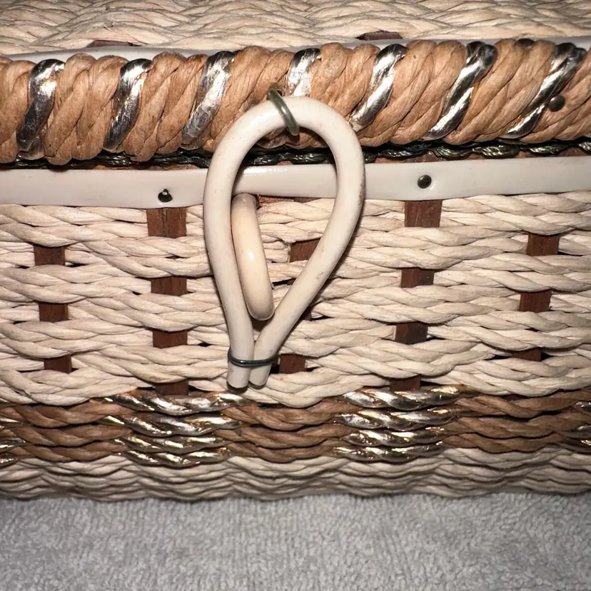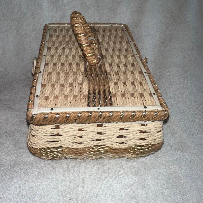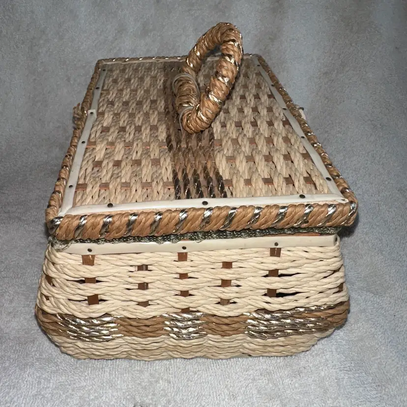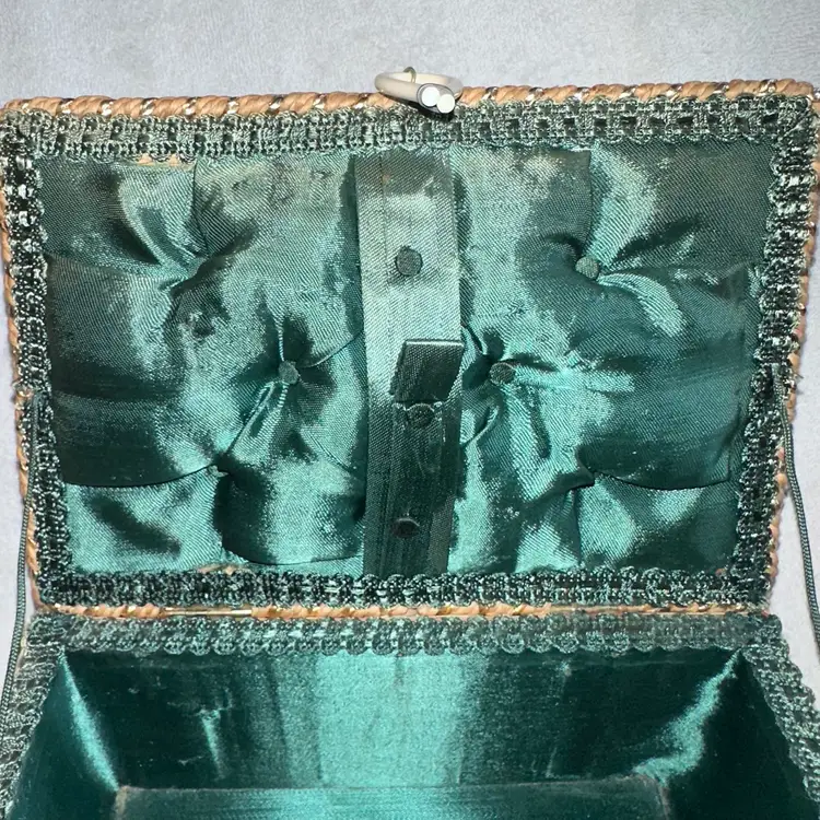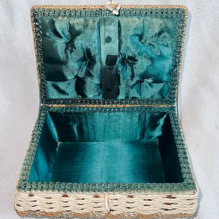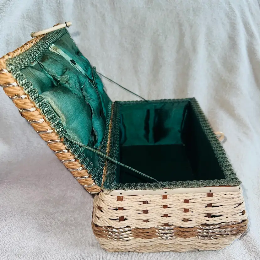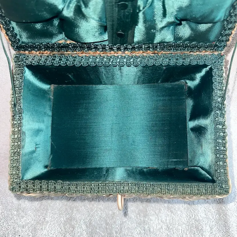 Vintage Braided Woven Wicker Sewing Basket Box Green Satin Lined Japan. Excellent Condition For Age. Lid is quilted with Green Satin Which Hold Pins And Needles. Box Bottom Is Green Satin Trimmed With Green Lace Around Edge. Made In Japan. Size 8” x 5” x 4”. No Makers Mark/Unbranded. Smoke Free Home. #sewing #sewingbox #vintage #mcm #retro #japan