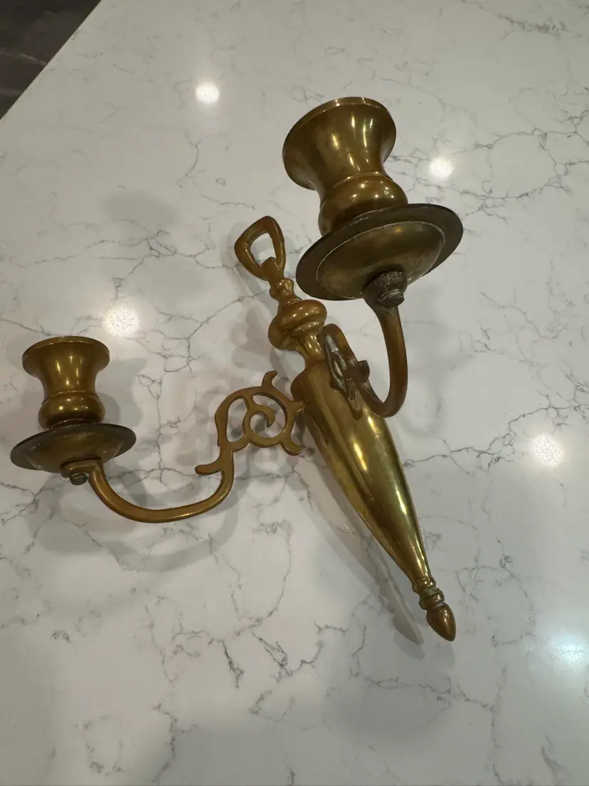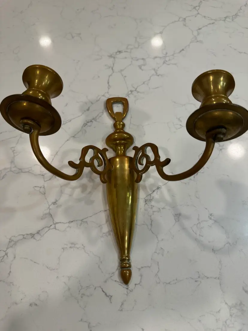 This classic and elegant piece is perfect for adding a touch of antique charm to any room. This beautiful unbranded sconce features two arms, each designed to hold a candle, providing ambient lighting and a sophisticated aesthetic. The rich brass finish showcases a lovely patina, highlighting its vintage appeal. Ideal for living rooms, dining areas or hallways, it instantly elevates your decor. Excellent pre-owned condition, with normal signs of age that contribute to its character.
